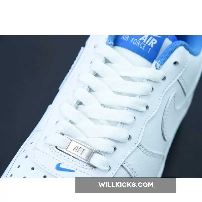 The classic Bruce Kilgore-designed Nike Air Force 1 puts on a clean and minimalist design with a touch of blue as it celebrates its 40th anniversary. Introducing the Nike Air Force 1 White University Blue. This AF1 Low is dressed entirely in smooth white leather, from heel to toe. This includes the profile leather Swooshes on both the medial and lateral sides of the shoe. The titular sky-hued University Blue on the Nike Air-branded tongue tabs, the tongue lining, the mesh sock liner and the heel tabs with Nike Air branding embroidered in white. Metallic lace deubrés adorn the toe section.