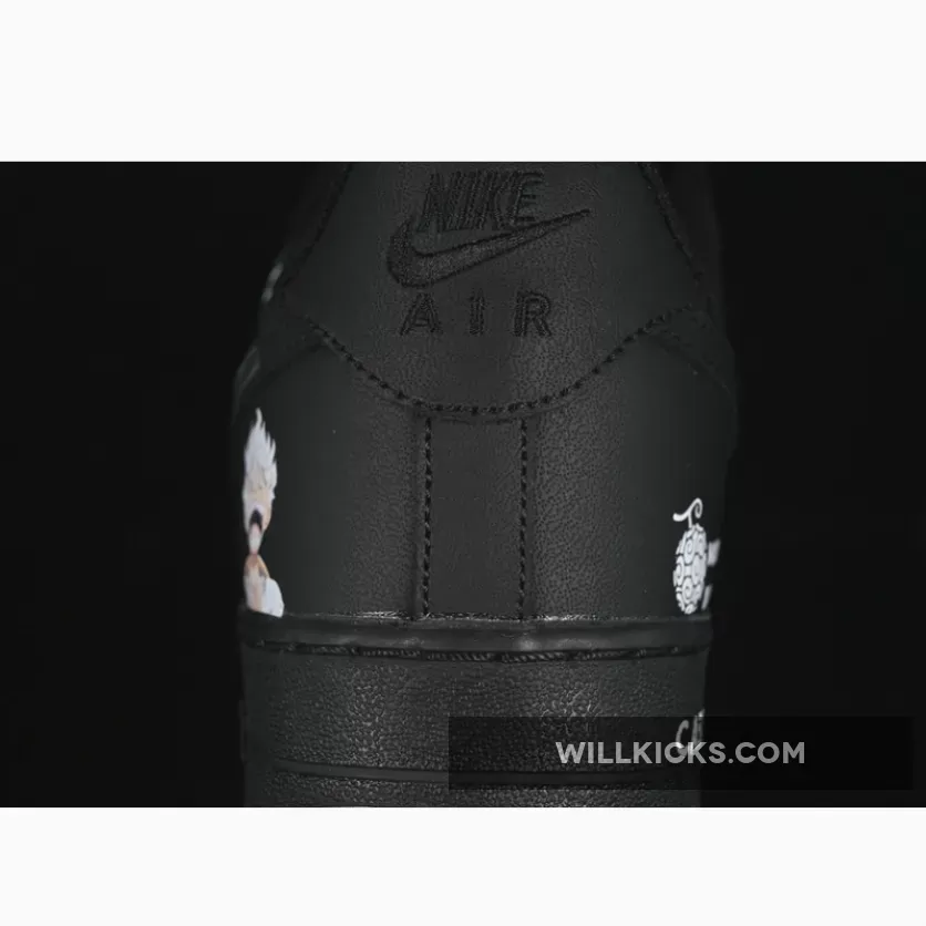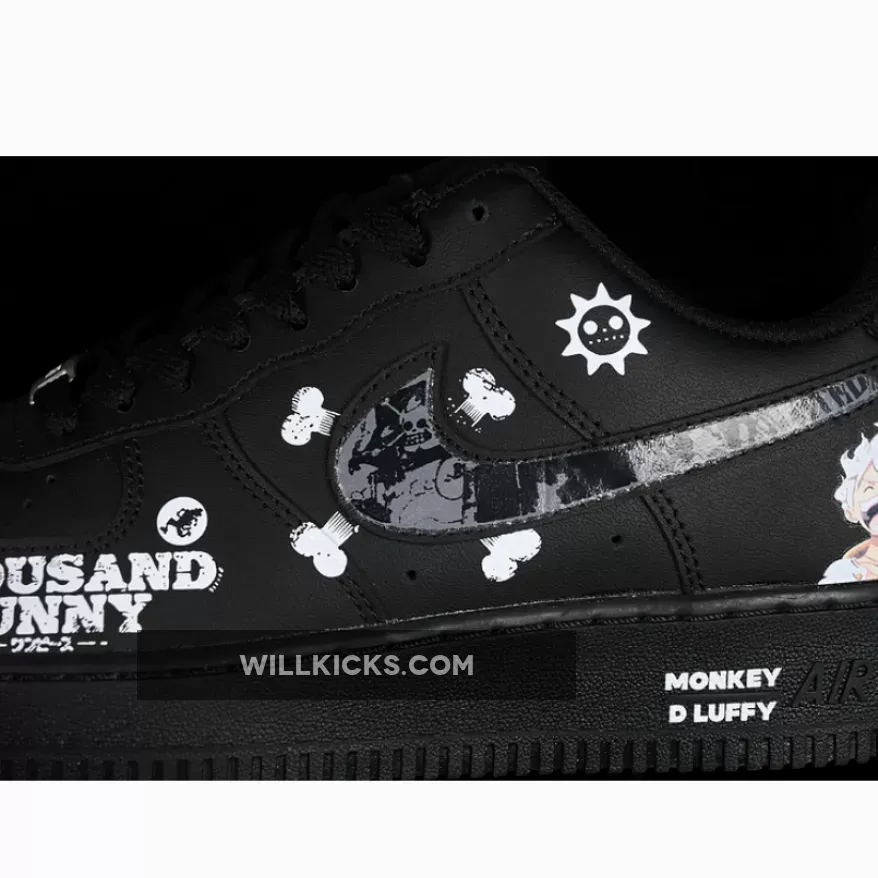 - Silhouettes feature intricate patterns inspired by popular anime themes, including references to Monkey D Luffy from One Piece series depicted near the heel tab along with other thematic designs like skull motifs scattered across the upper panel.