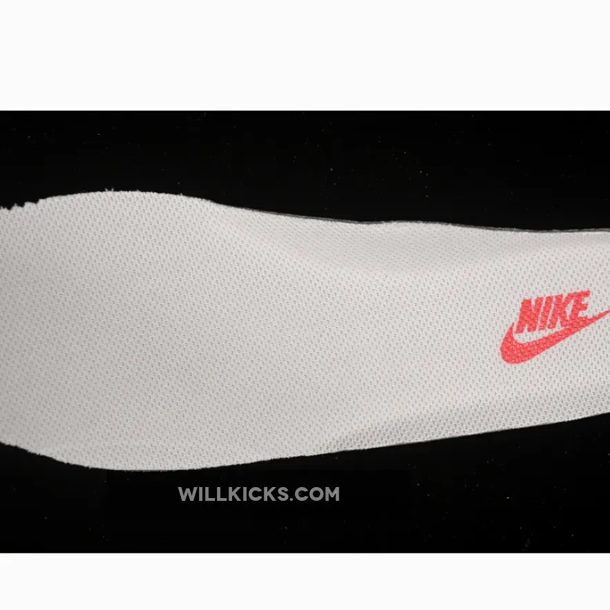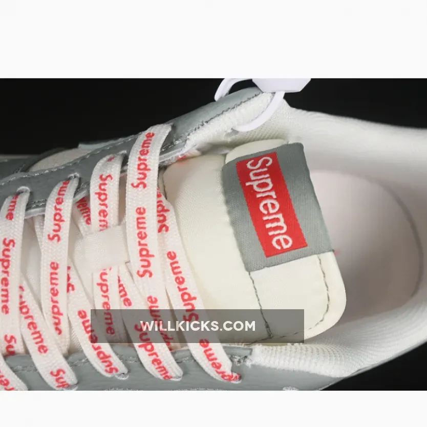 This low-top model showcases a harmonious blend of white, grey, and red hues across its upper construction. The classic Swoosh logo sits prominently near the heel tab, while smaller branding appears discreetly at various points along the side paneling – including beneath the laces where you’ll find subtle hints of red accents matching perfectly with other details like the tongue label which proudly displays ‘Supreme’ against a vibrant backdrop.
