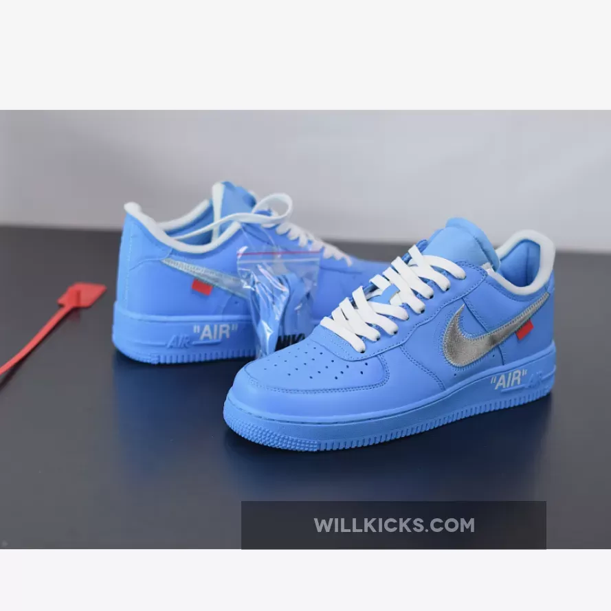 Painted all over in a rich blue hue, a shimmering silver Swoosh shoots down the lateral and medial sides for a look that’s both bold and beautiful. An orange tag is present for that deconstructed look that we all know and love, and this is further emphasised by Abloh’s signature red cable tie that adorns the laces, introducing a pop of contrast.