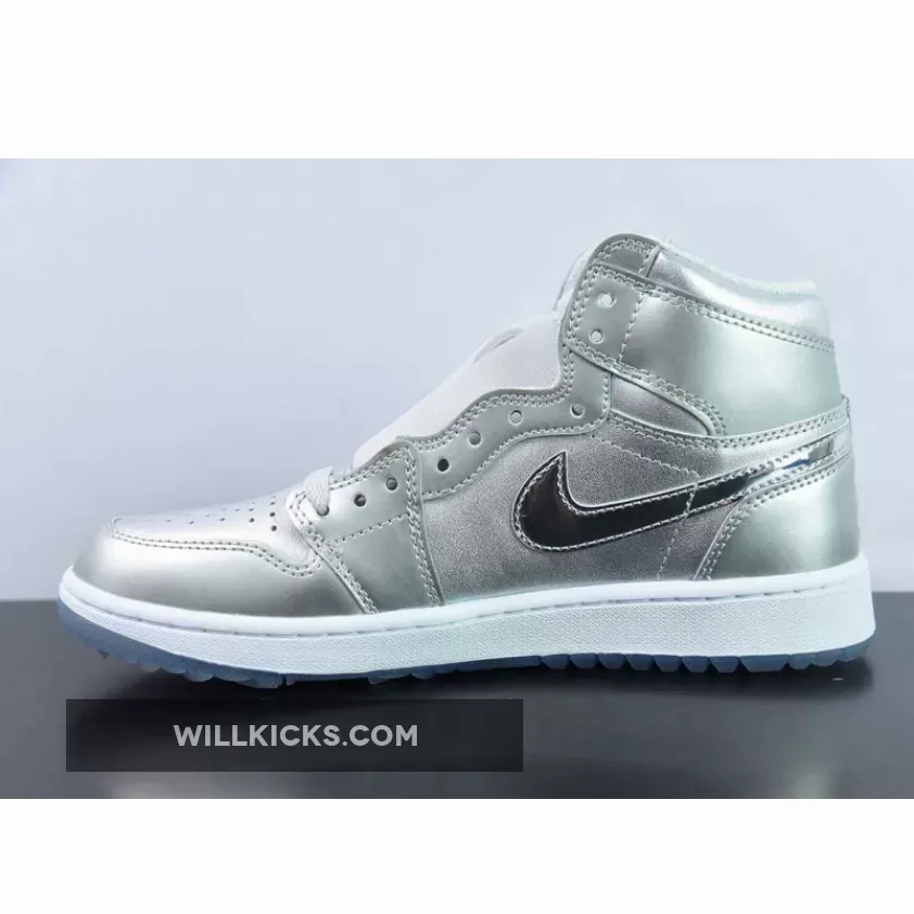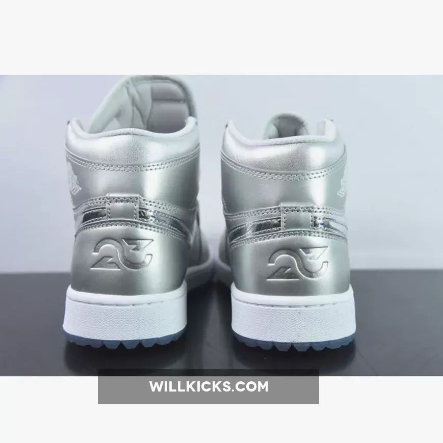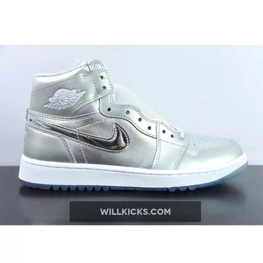 Solid colorway for the Air Jordan 1 High Golf. The Metallic Silver leather upper is sleek and breathable, while the Chrome accents add a touch of luxury. The attention to detail with the decorative insoles and outsole is commendable. Overall, a stylish and functional golf sneaker.