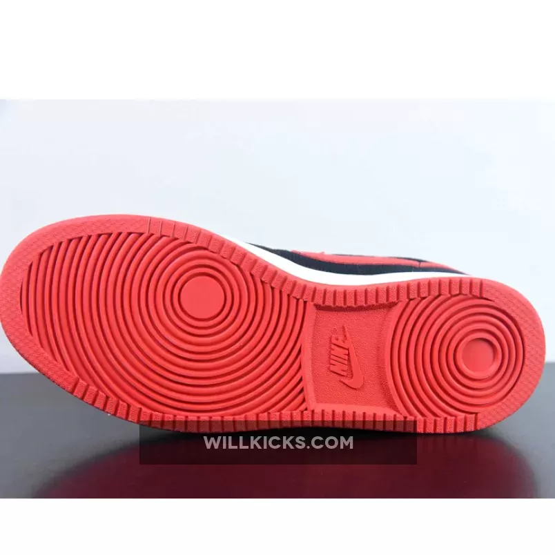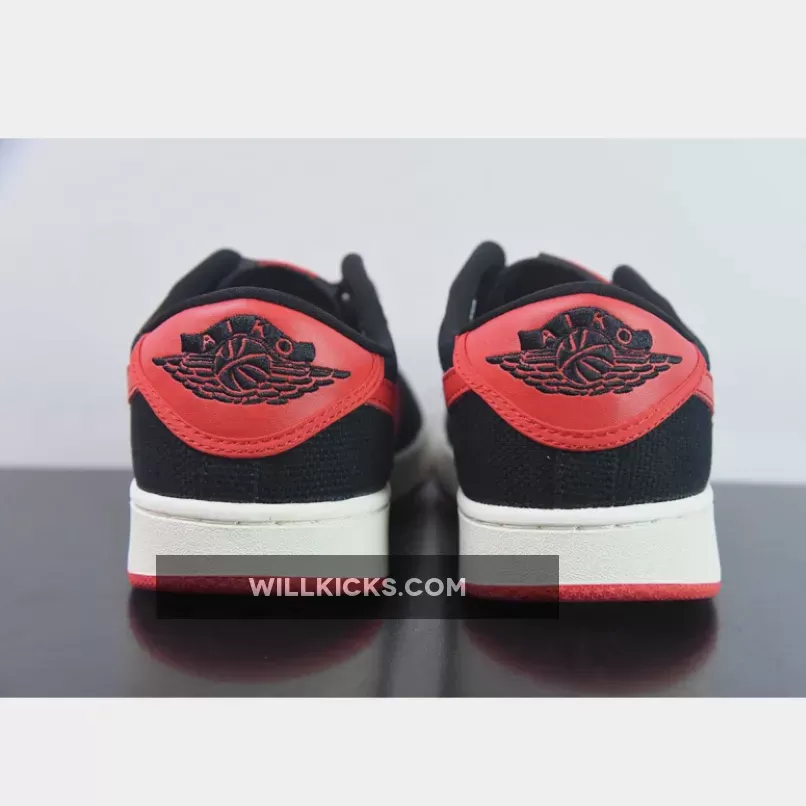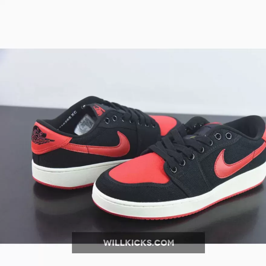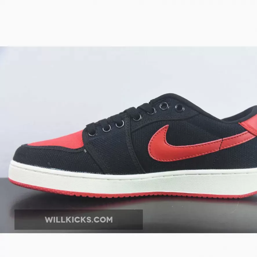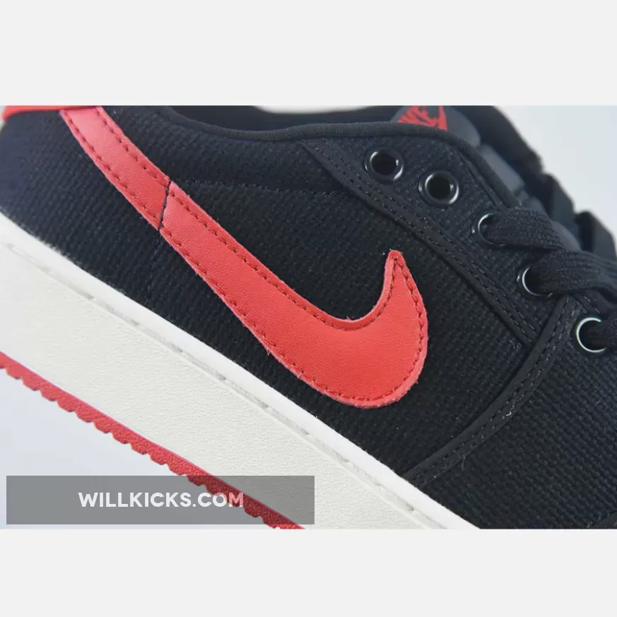this colorway of the Air Jordan 1 KO Low is constructed out of a full Black and Red canvas base decorated with Red leather Swooshes and heels.