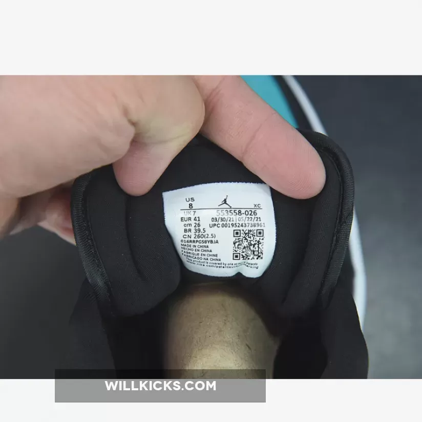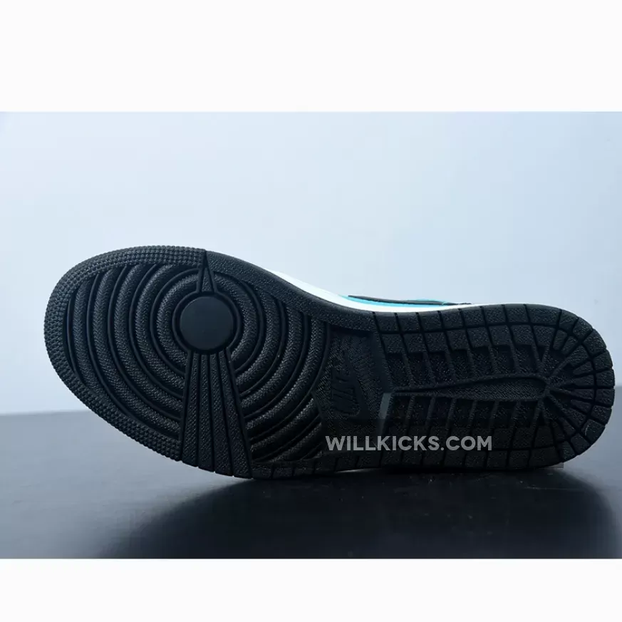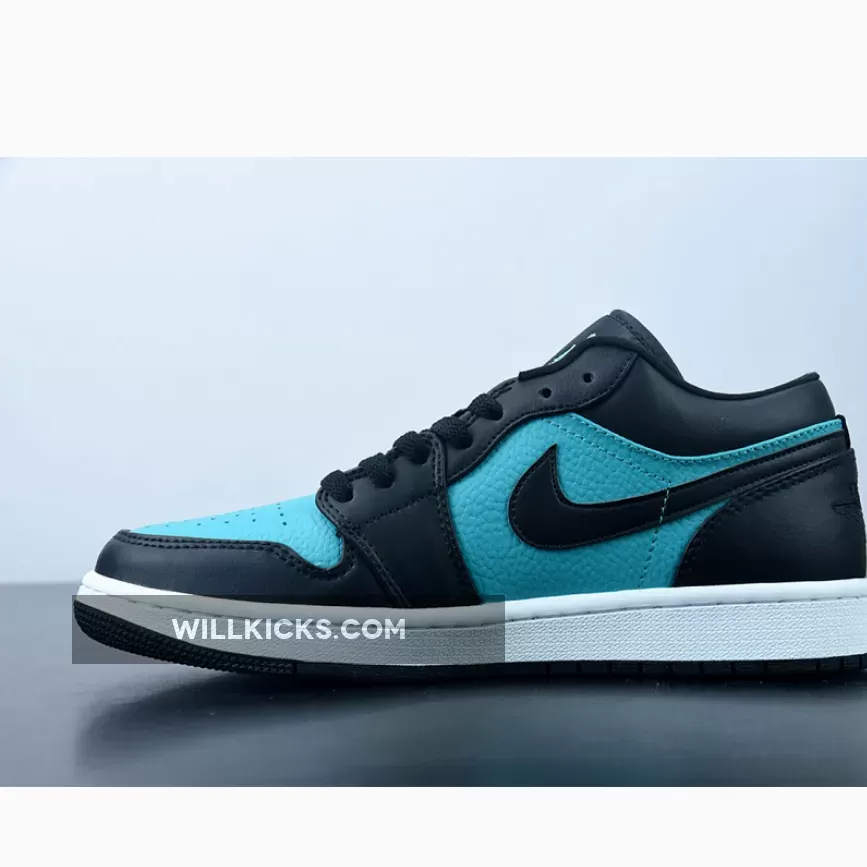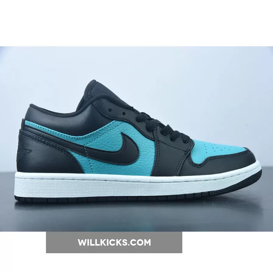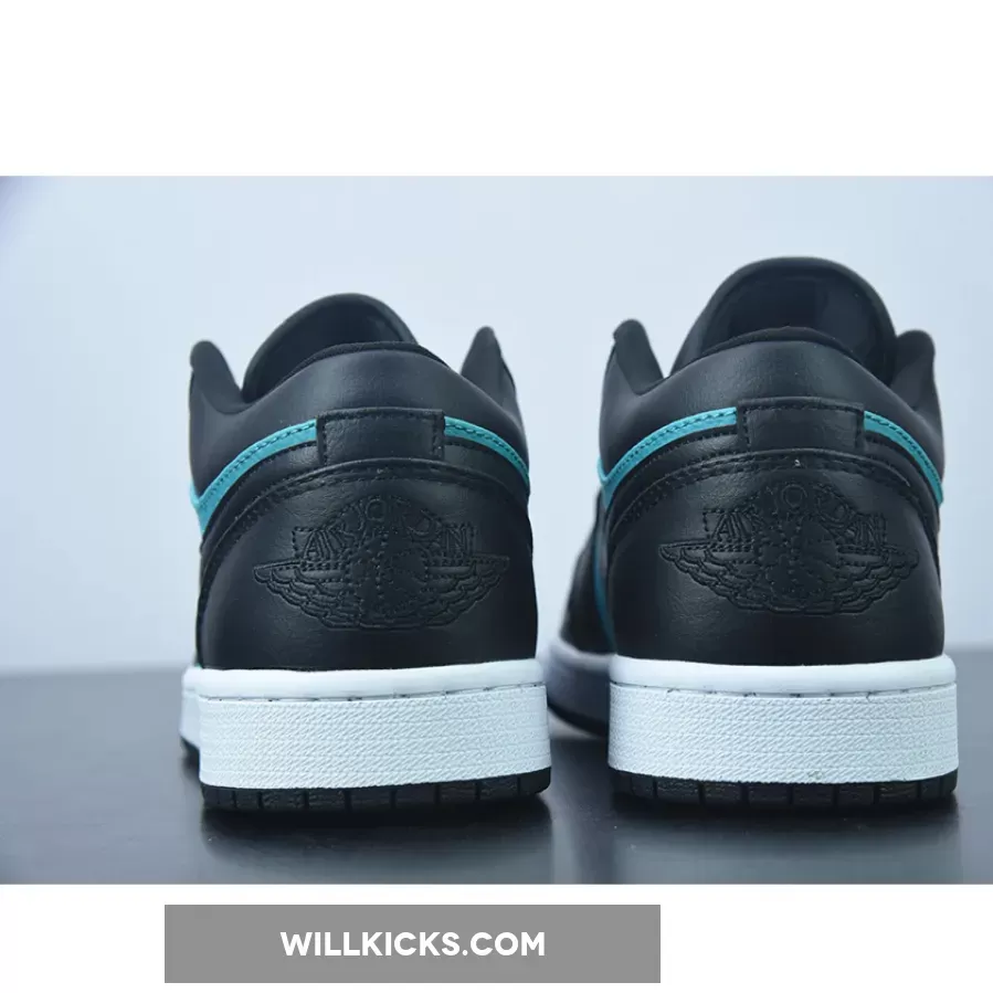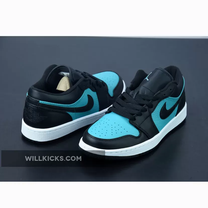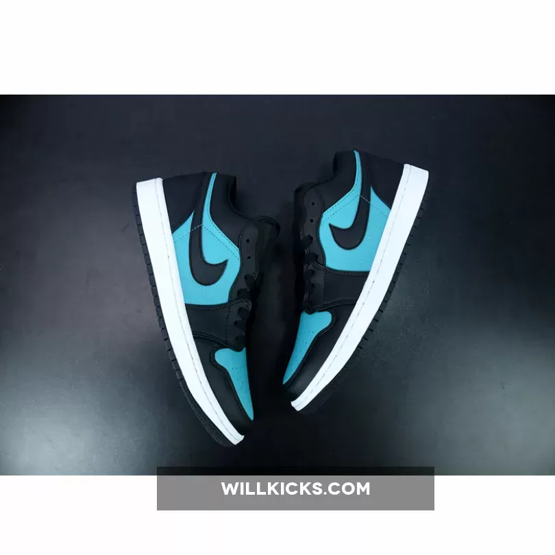 Dressed in a Black, University Blue, and White color scheme. This offering of the low-top Air Jordan 1 features a White leather base with Black overlays, laces, liner, insoles, and rubber outsole.