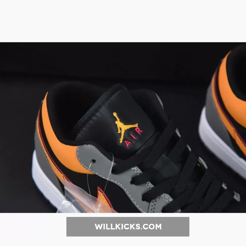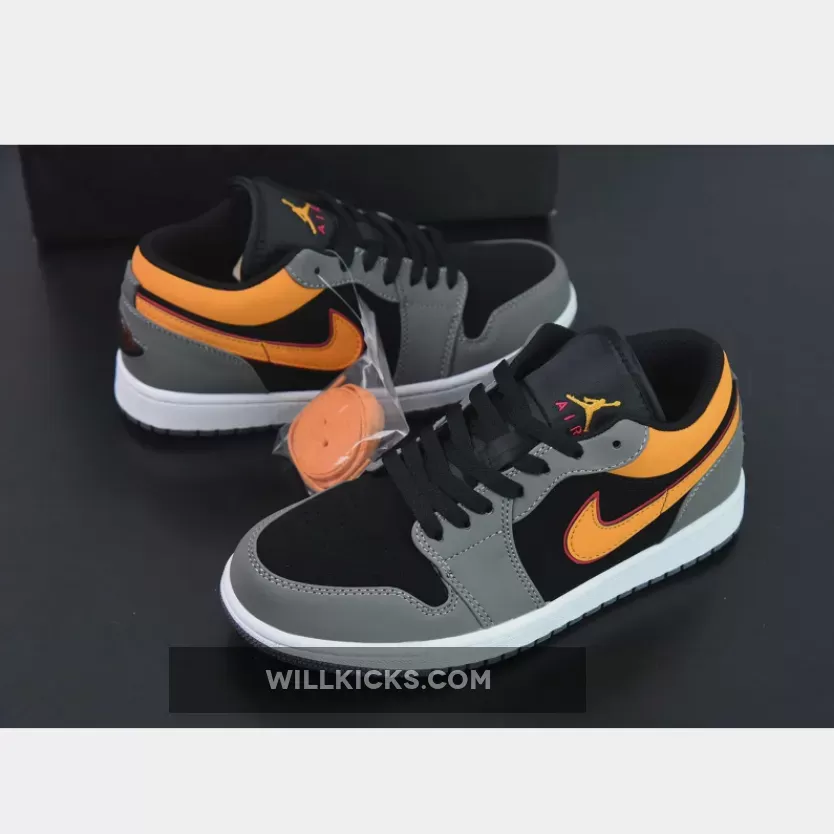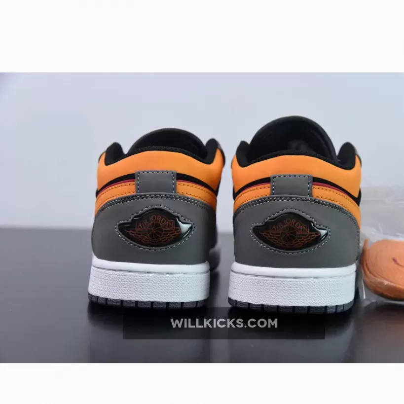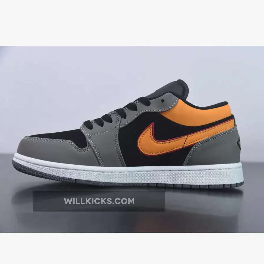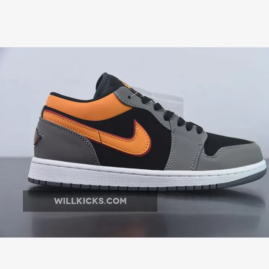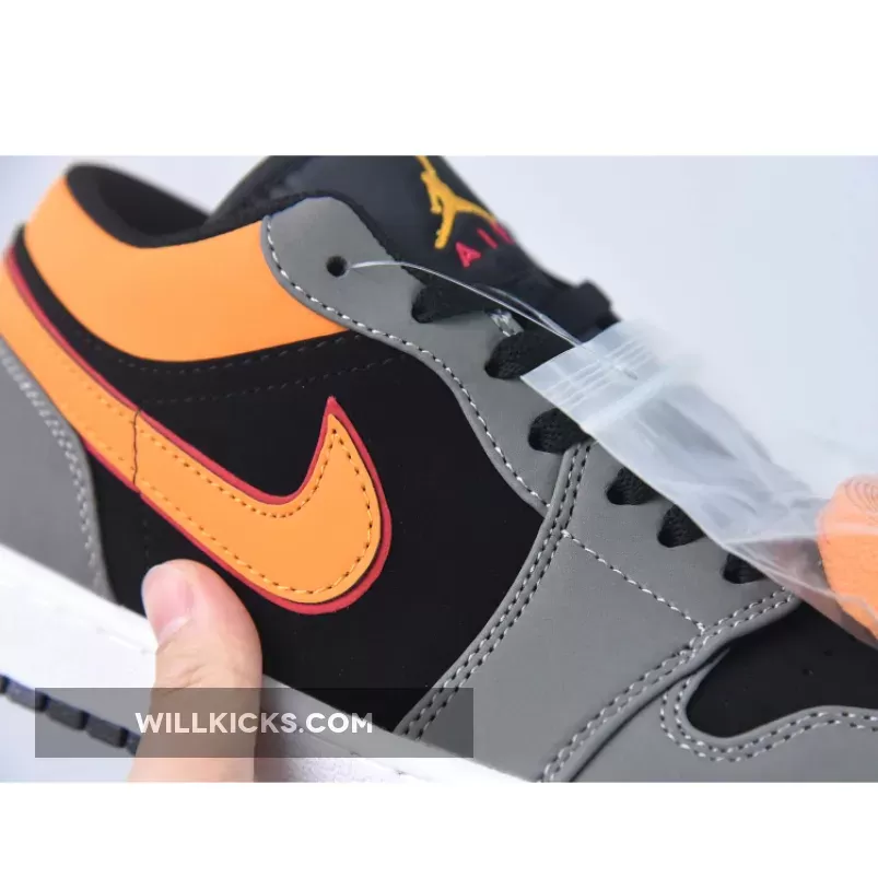 Done in an official color scheme listed as Black, Vivid Orange, Light Granite, Cardinal Red, White, this new iteration of the Air Jordan 1 Low is constructed in a mix of nubuck and leather alongside mesh used on the tongues and inner lining.