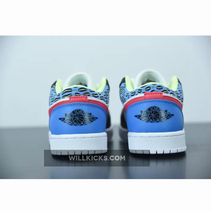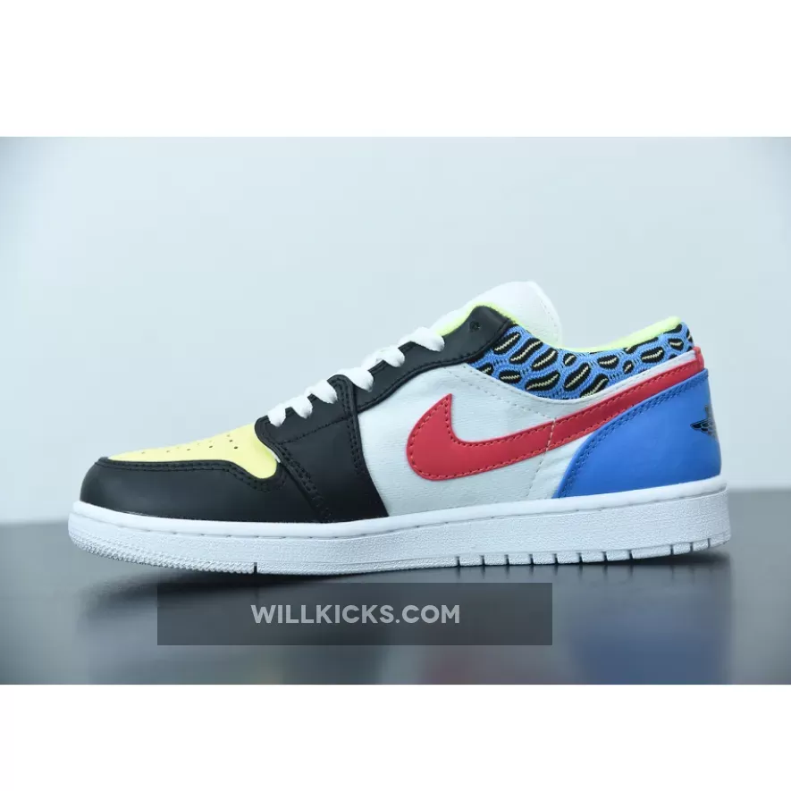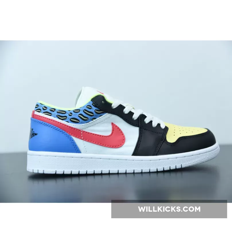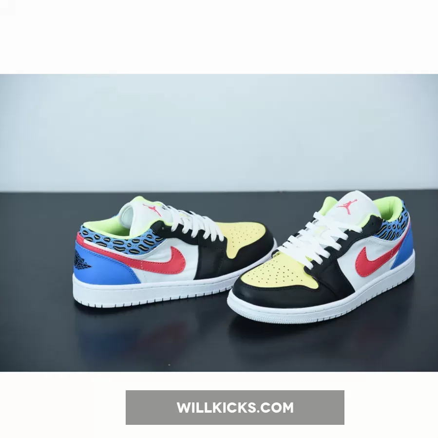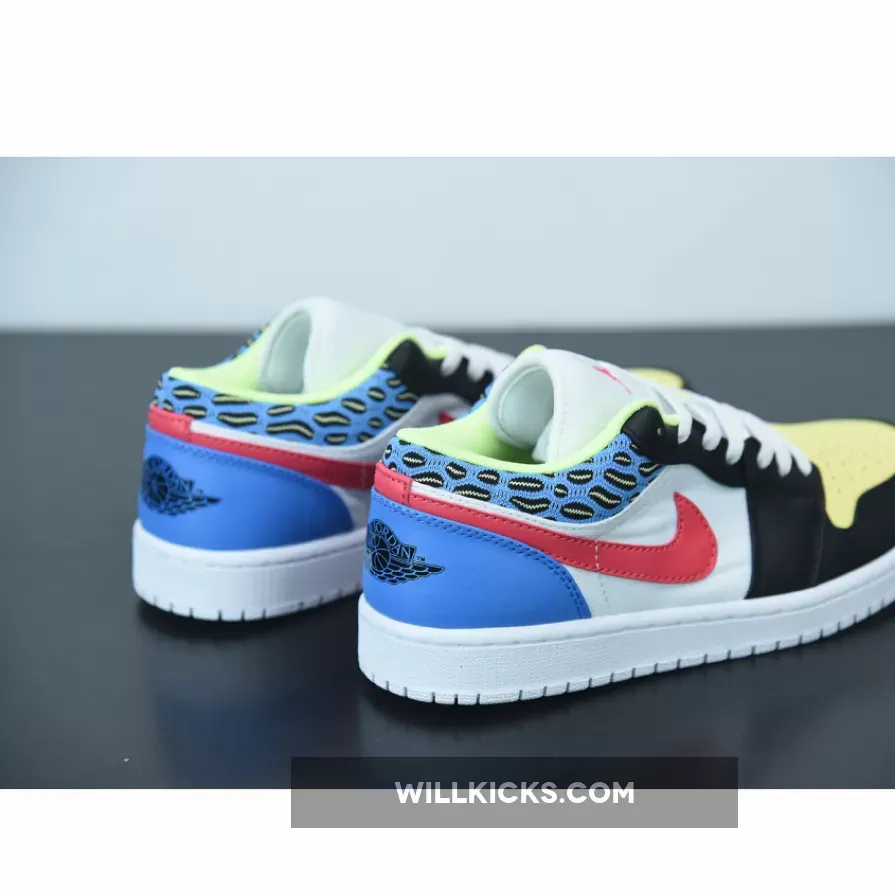 This low-top Air Jordan 1 comes dressed in a Black, Light Fusion Red, White, and Coast color combination. Highlighted with White mesh on the panels and tongue with Lemon Yellow across the toe. Next, Black leather appears on the overlays with Lime Green on the liner and Blue on the heel. Fusion Red hits the Swoosh logos and Jumpman on the tongue with a weave pattern on the collar. Finally, a graphic on the insole and White on the midsole and rubber outsole finishes the look.
