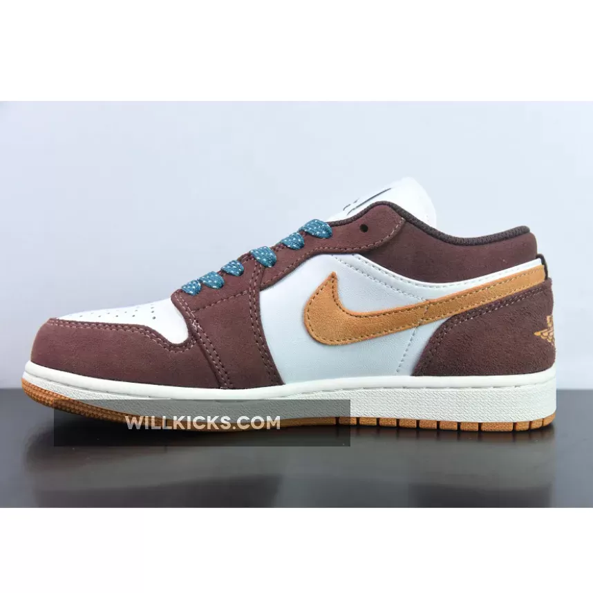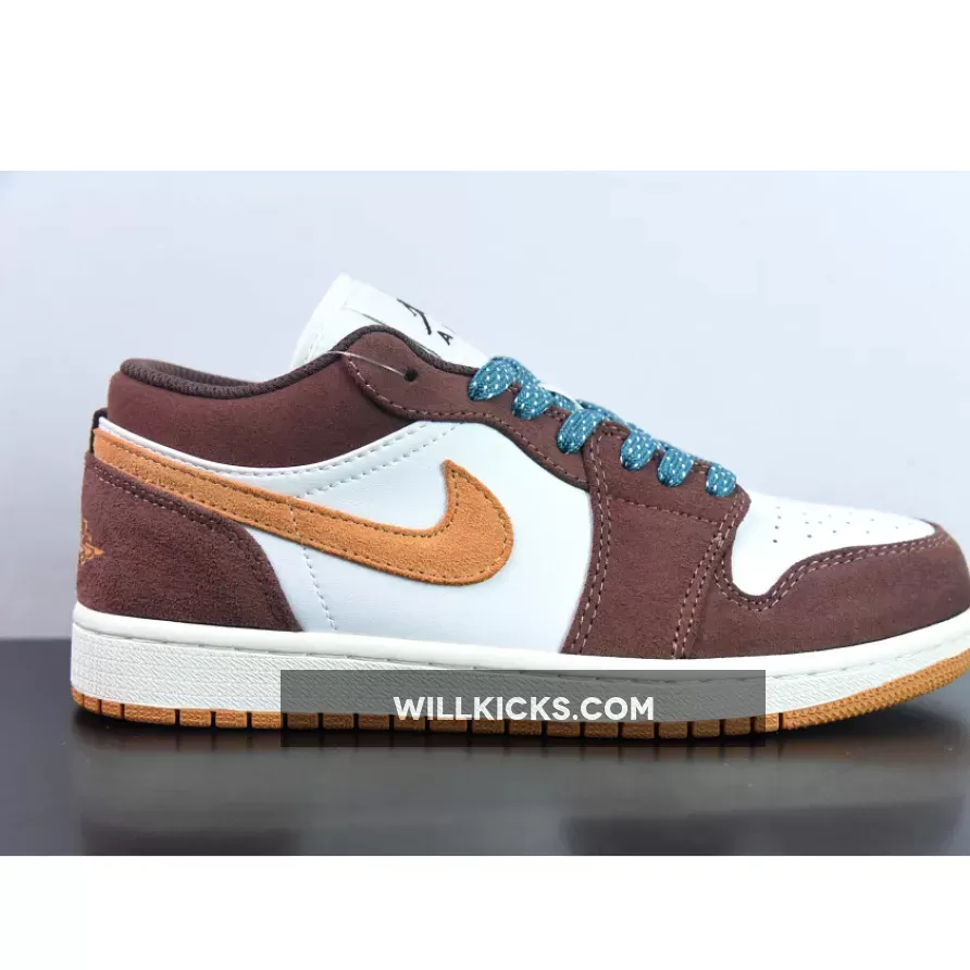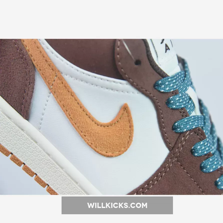 This offering of the Air Jordan 1 Low comes constricted in a mix of leather, hairy suede, and mesh materials. The hairy suede signature profile Swooshes on both the medial and lateral mid-panels are a lighter tan shade. Geode teal joins the mix via the laces, bringing a splash of colour to the neutral backdrop.