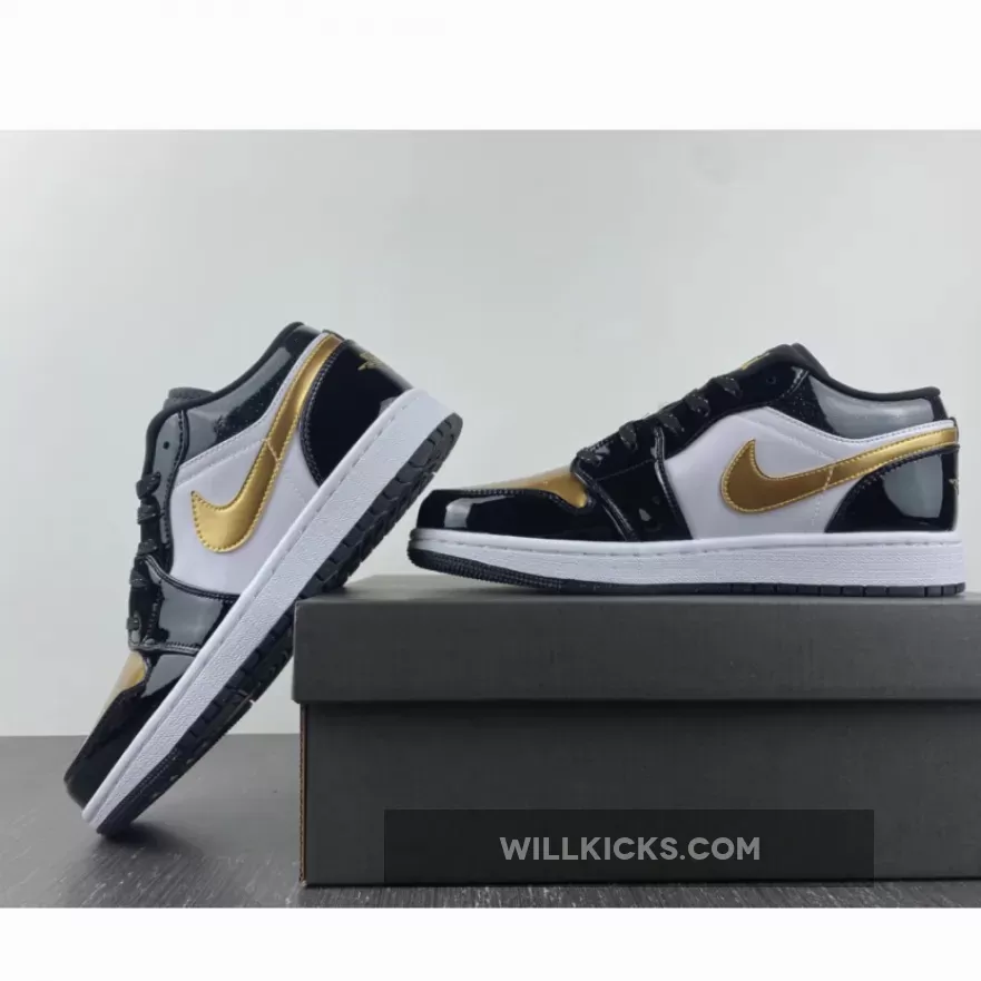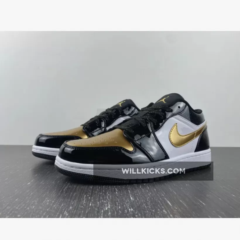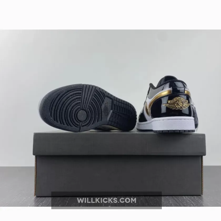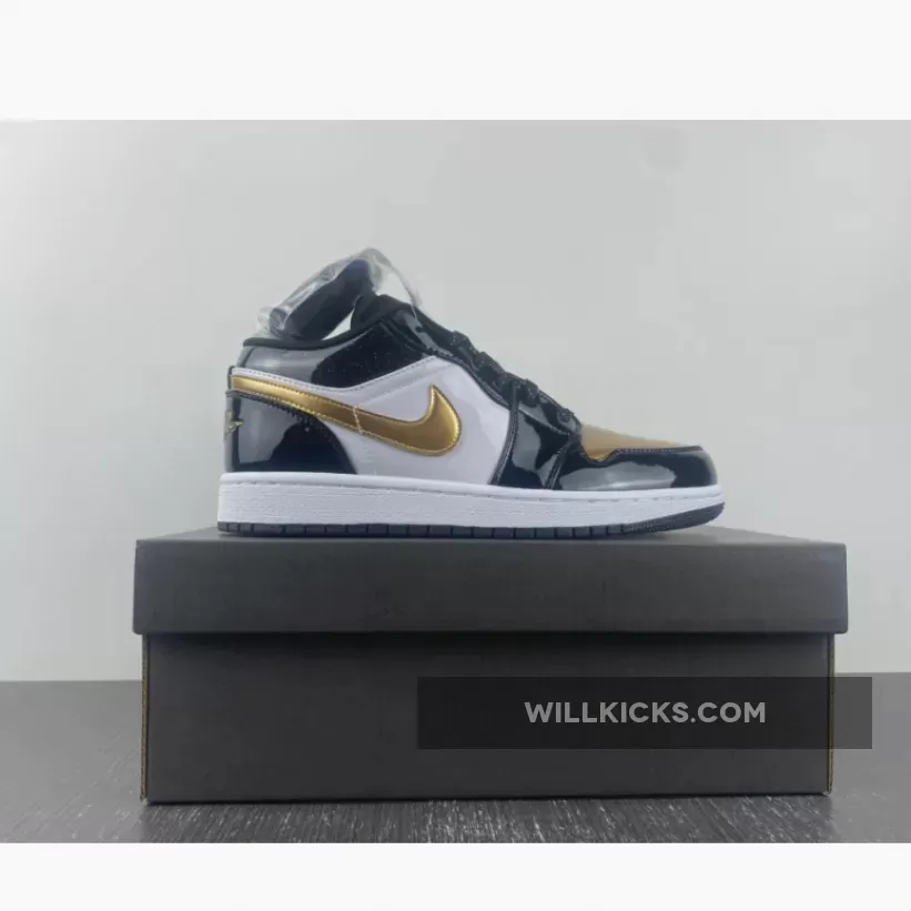 The Air Jordan 1 Low is a rotation staple and sometimes you need a little glamour in your life. This sneaker delivers both everyday wearability and a design that stands out from the crowd. Introducing the Air Jordan 1 Low GS Gold Toe. This AJ1 Low comes in smaller sizes for those with feet size 3 – 6. Patent leather dresses the overlays, with black covering the toe cap, eyelets, ankle and heel. Meanwhile, gold detailing adorns the Wings logo on the heel, Michael Jordan’s Jumpman at the top of the tongue, as well as Nike’s signature Swooshes on the medial and lateral sidewalls. Matching to this, the gold toe box comes perforated for enhanced breathability, whilst the ankle appears glittery.