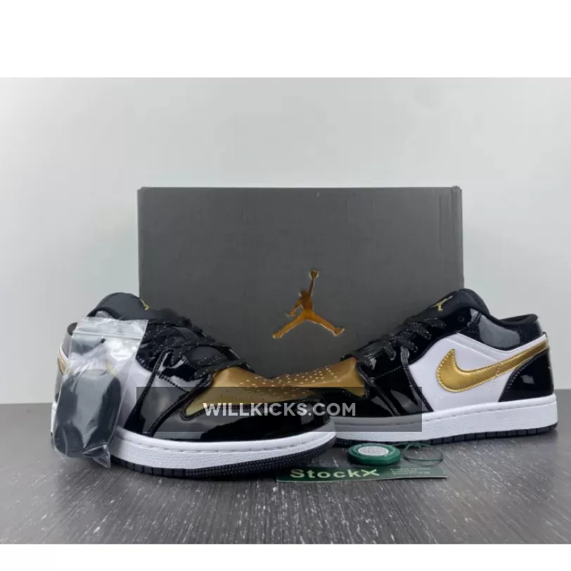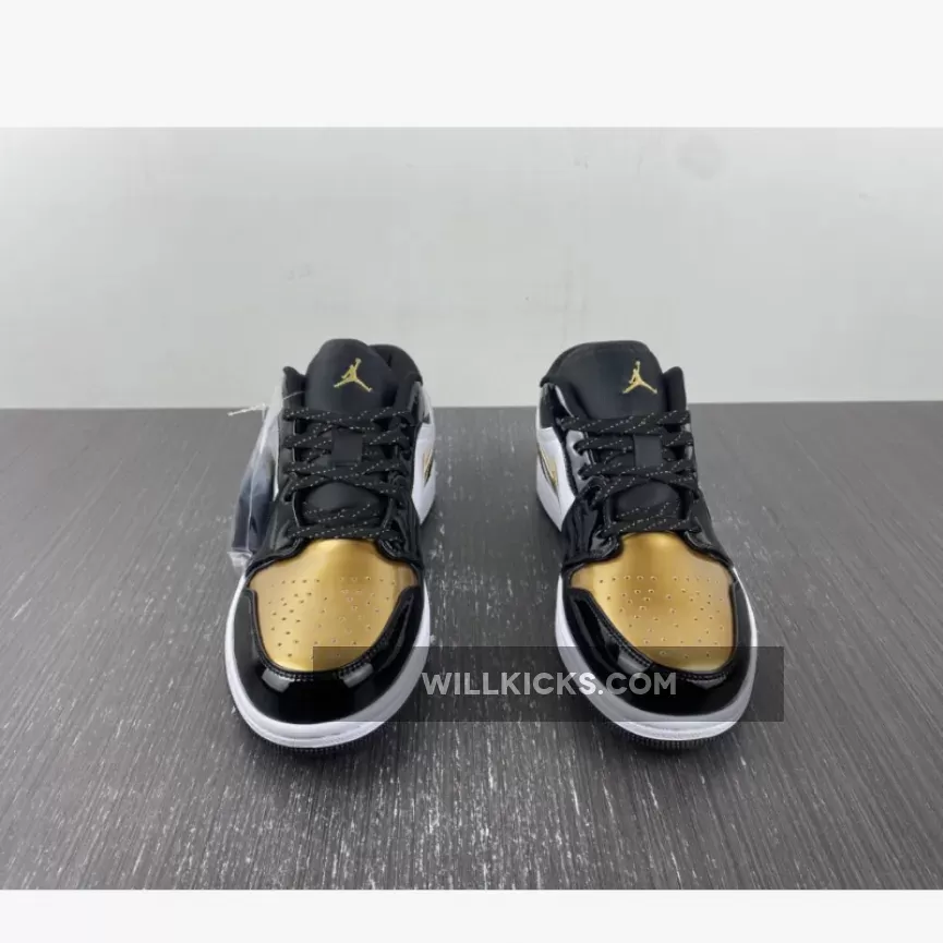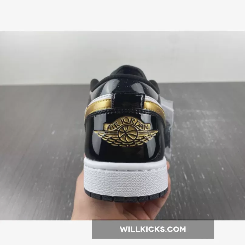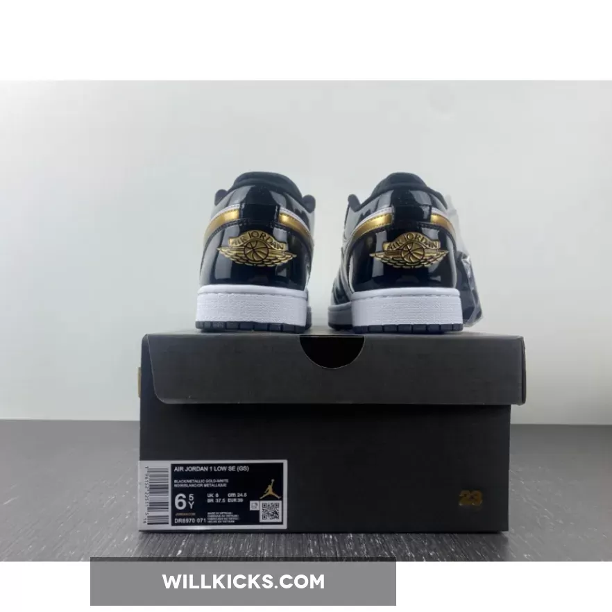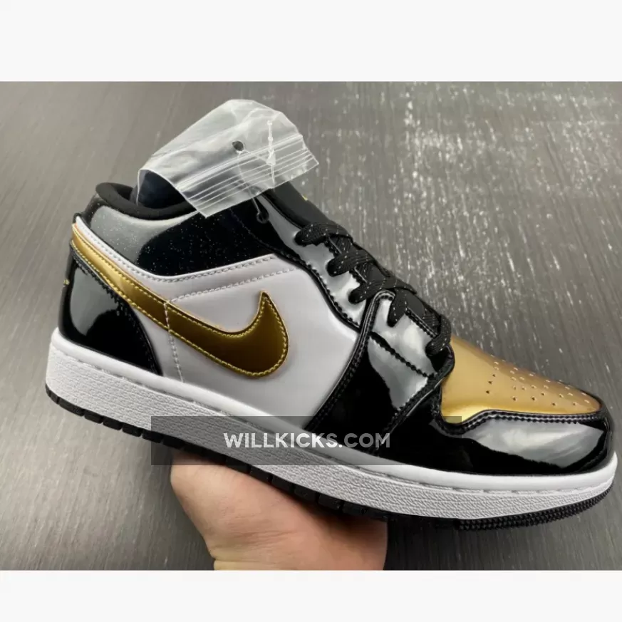 The Air Jordan 1 Low is a rotation staple and sometimes you need a little glamour in your life. This sneaker delivers both everyday wearability and a design that stands out from the crowd. Introducing the Air Jordan 1 Low GS Gold Toe. This AJ1 Low comes in smaller sizes for those with feet size 3 – 6. Patent leather dresses the overlays, with black covering the toe cap, eyelets, ankle and heel. Meanwhile, gold detailing adorns the Wings logo on the heel, Michael Jordan’s Jumpman at the top of the tongue, as well as Nike’s signature Swooshes on the medial and lateral sidewalls. Matching to this, the gold toe box comes perforated for enhanced breathability, whilst the ankle appears glittery.