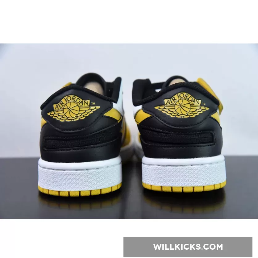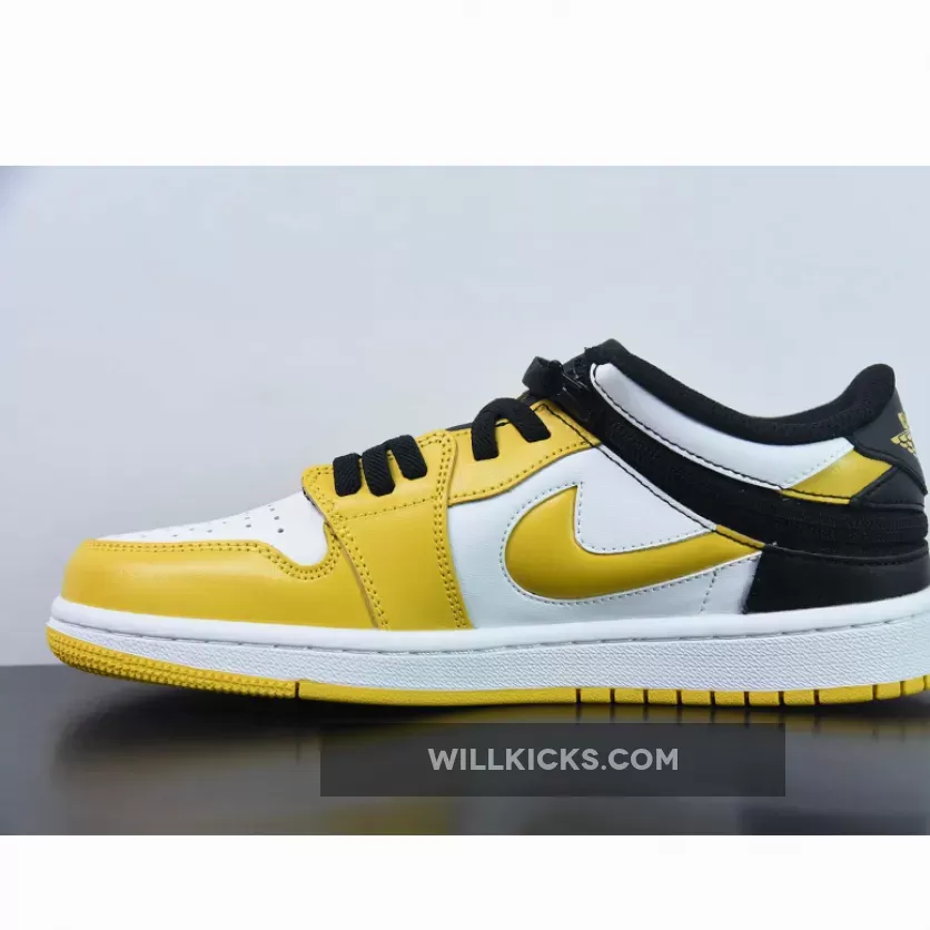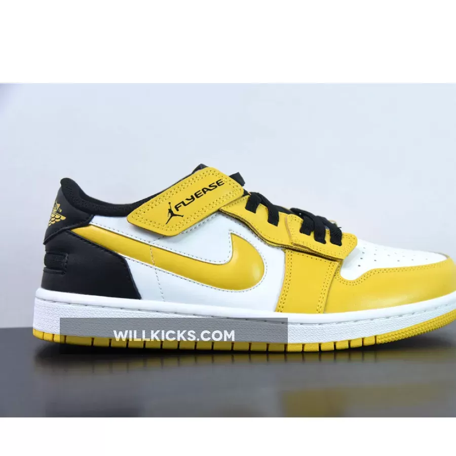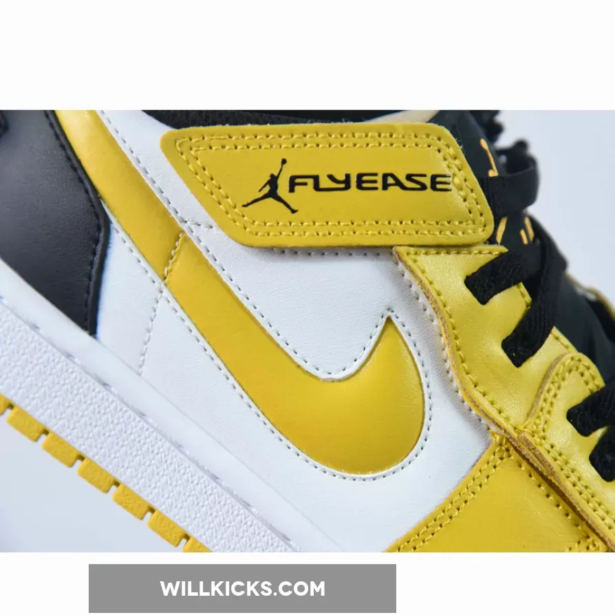 The upper on this Air Jordan 1 Low FlyEase has a white leather base complete with “Taxi” overlays around the toebox and eyestay. Lateral Swooshes appear as bulbous leather panels and the velcro eyestays are fixed with elastic laces for easy adjustments. The heel counter has a black leather finish which matches the tongue and laces.