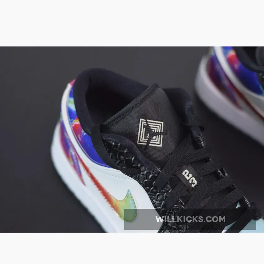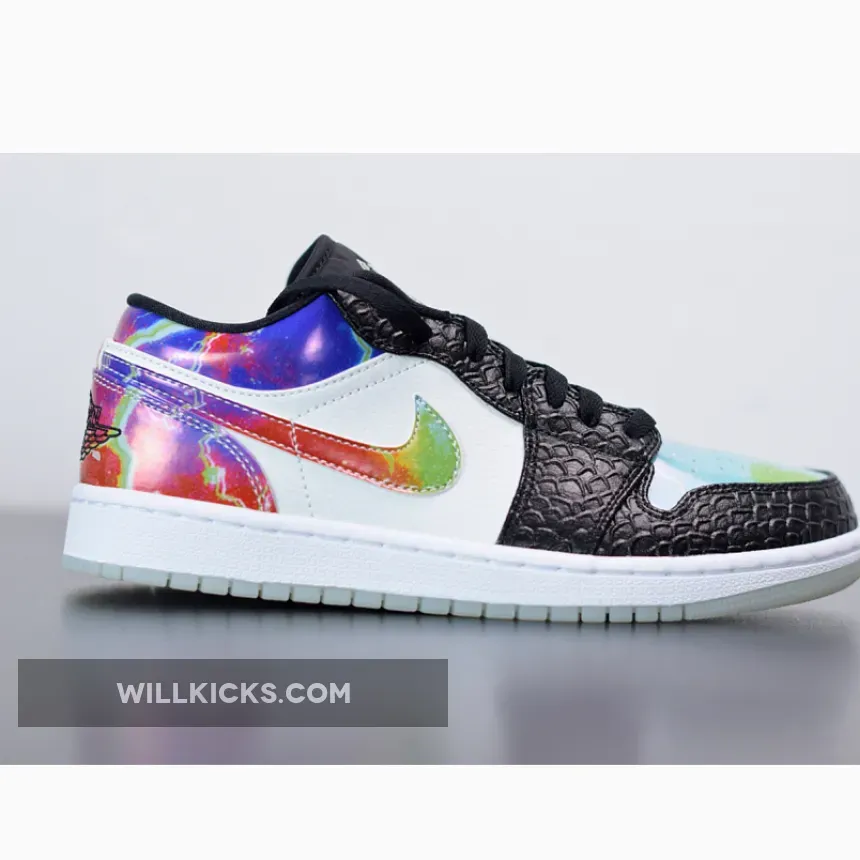 The Air Jordan 1 Low “Galaxy” is constructed from mismatched panels featuring faux black snakeskin leather, hi-gloss galaxy prints, colorful palates, and glow-in-the-dark soles. The black snakeskin dresses the toe and eyelets, while black nylon crafts the tongue and liners. “Galaxy” prints highlight the Swoosh insignia, heel overlay, and collar, while the perforated toe box is dressed in blue watercolor. To finish it all off, special branding marks the tongue tab and insoles, while glow-in-the-dark materials make up the outsole.