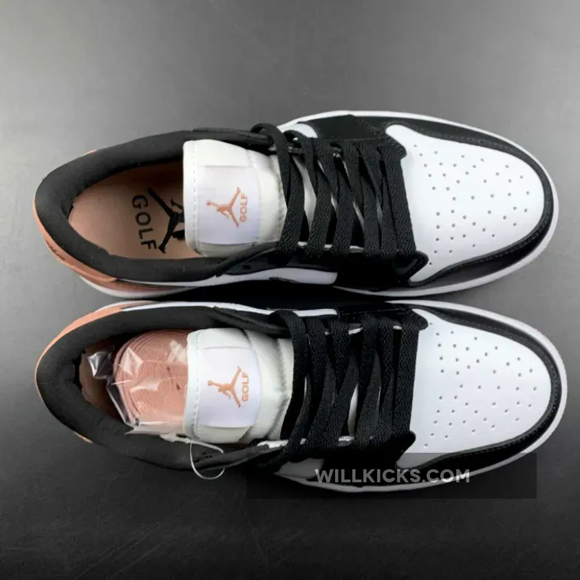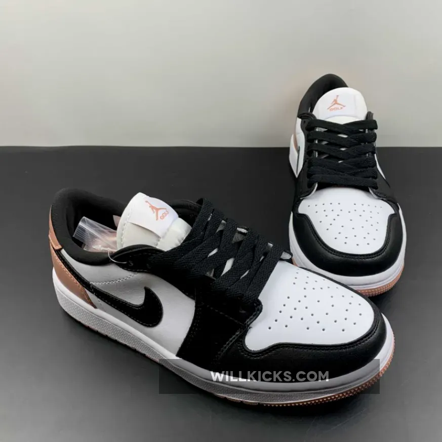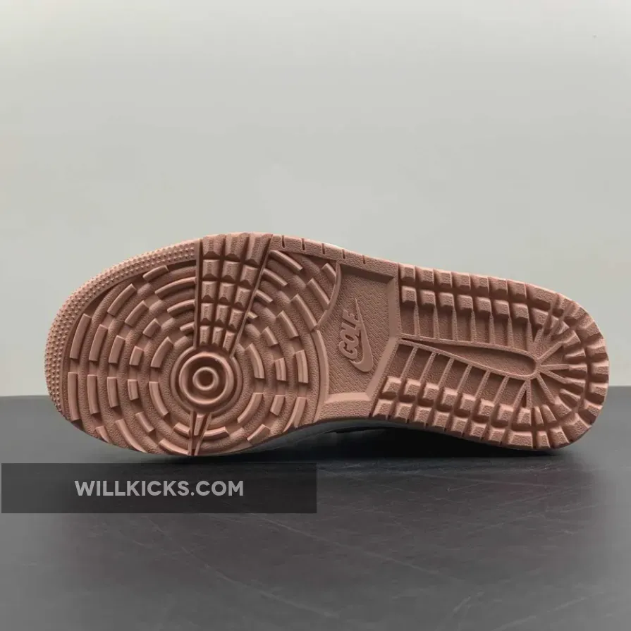 The Jordan Brand’s Air Jordan 1 golf line built with soles designed for the fairway, the Air Jordan 1 Low Gold, has a new offering featuring a black toe and a touch of rose. Get ready for the Air Jordan 1 Low Golf Rust Pink. This low-cut AJ1 Golf starts out with a “colourless” smooth leather base showing on the perforated toe box and the mid-panels. The smooth leather overlays on the toe cap, the mudguard and eye stay panels are all in contrasting pitch black. The laces, signature profile Swooshes on both the medial and lateral mid-panels and the plush sock liners all jump on the black bandwagon. A lovely shade of Rust Pink enters the picture on the leather heel tabs showing off black embossed “Wings” logos, the heel counters, the Jumpman branding on the tongue labels and the insoles.