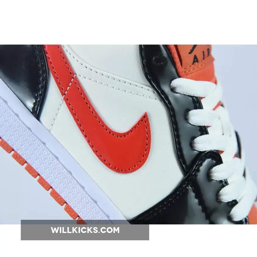 The classic Peter Moore-designed Air Jordan 1 is ready for trick or treat. Meet the Air Jordan 1 Low GS Halloween.This smaller-sized AJ1 has smooth white mid-panels and collars. This colourless backdrop makes the bold Halloween pumpkin orange stand out on the toe box and the profile Swooshes on both the medial and lateral sides of the shoe. The nylon tongues and mesh sock liners follow suit. The toe cap, eye stay panel and heel counter add an extra dimension of character to the shoe in shiny black patent leather.