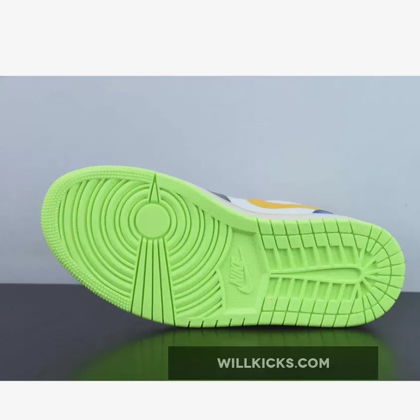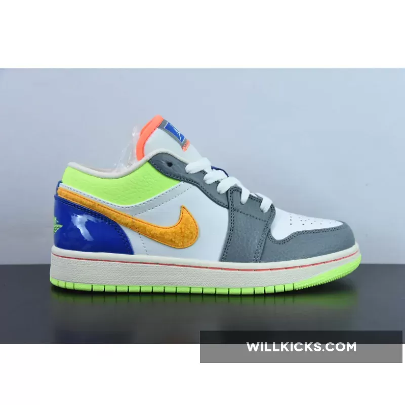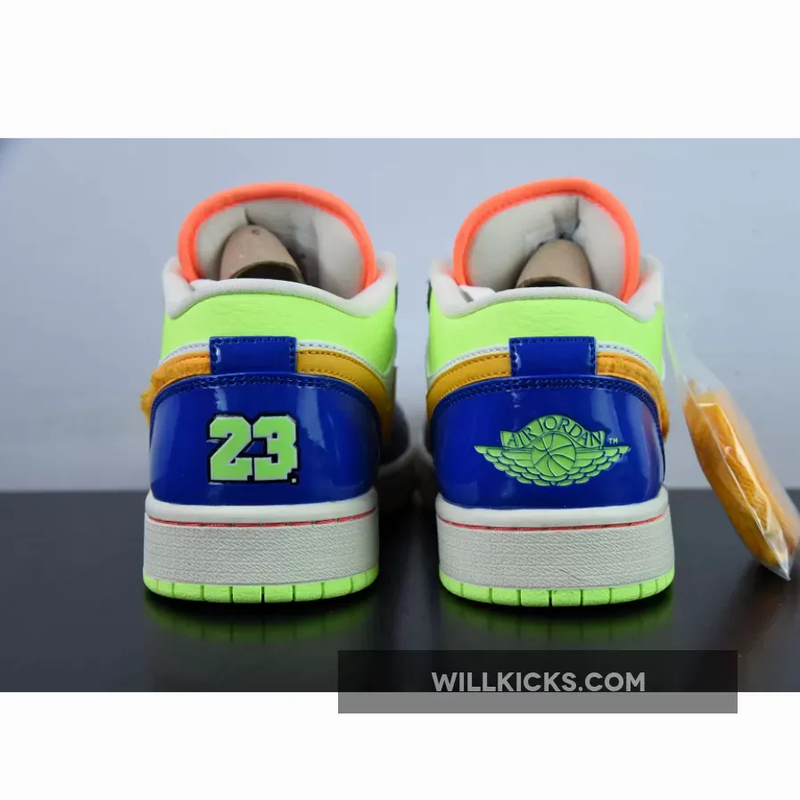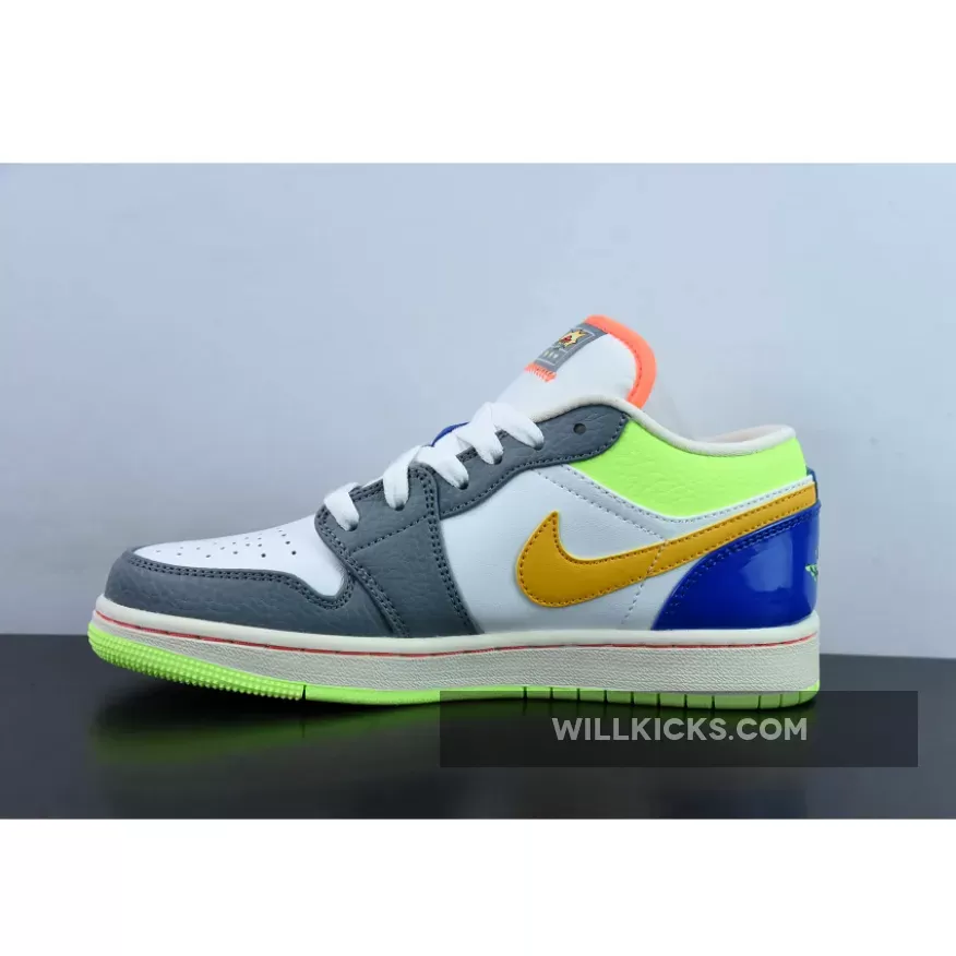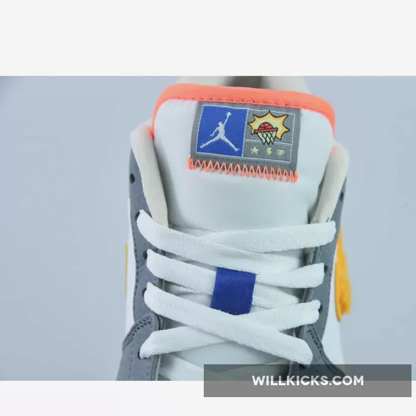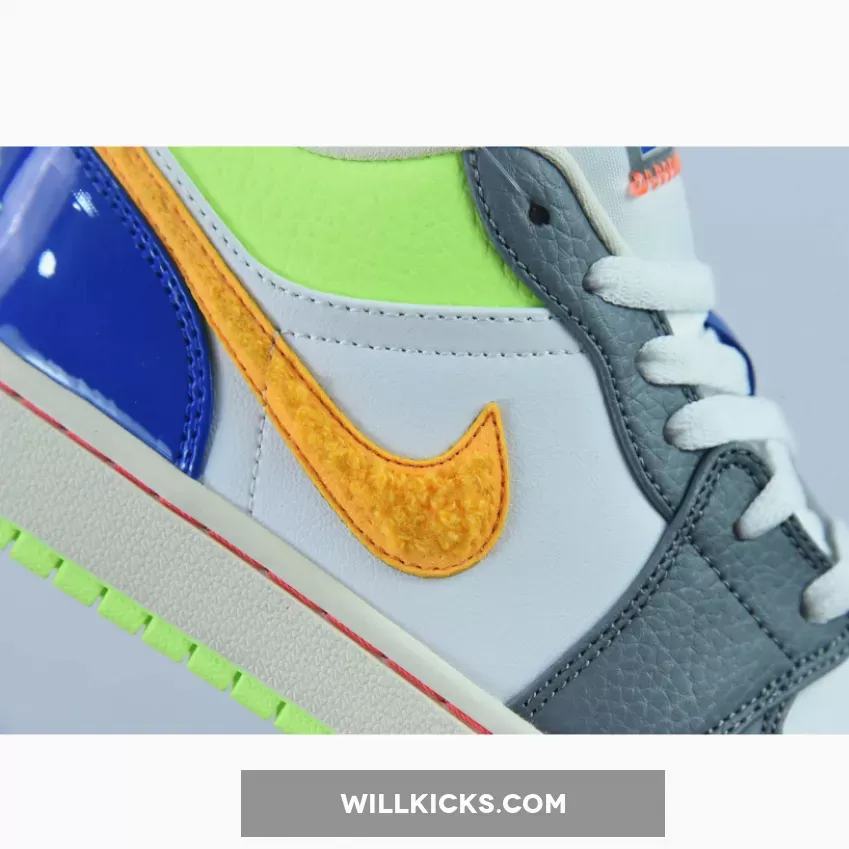 A playful rendition of one of Peter Moore’s most recognisable designs, the Air Jordan 1 Low GS Hoops Grey Multi is nothing but vibrant. The perforated toe and midfoot are both decked in smooth white leather and are reinforced by grey tumbled leather overlays. The orange Nike Swoosh is also eye-catching and boasts a furry texture. More tangerine touches are present in the tongue’s outline. Rounding off this colourful grade school sizing of the 1985 model is the blue patent heel with neon green “23” and Air Jordan insignia branding.