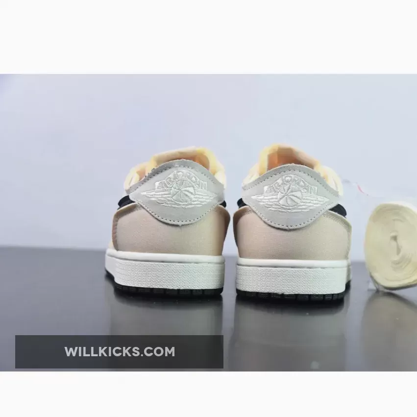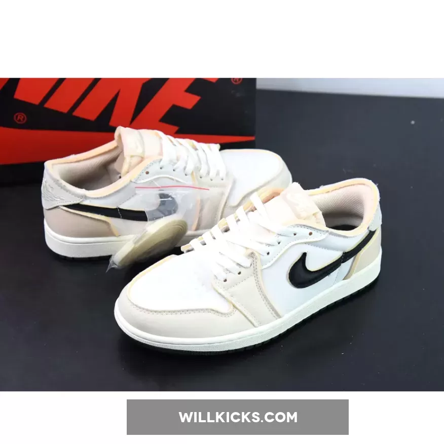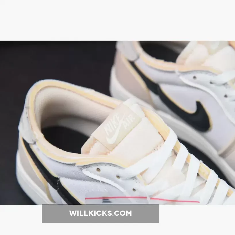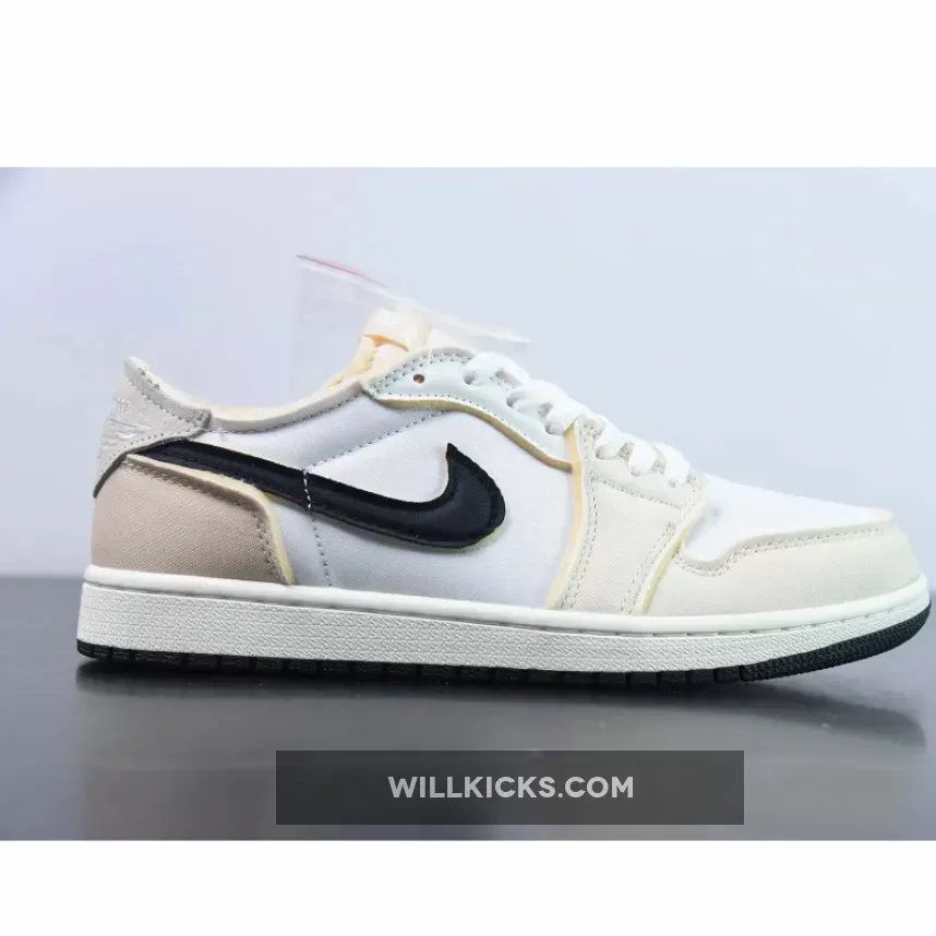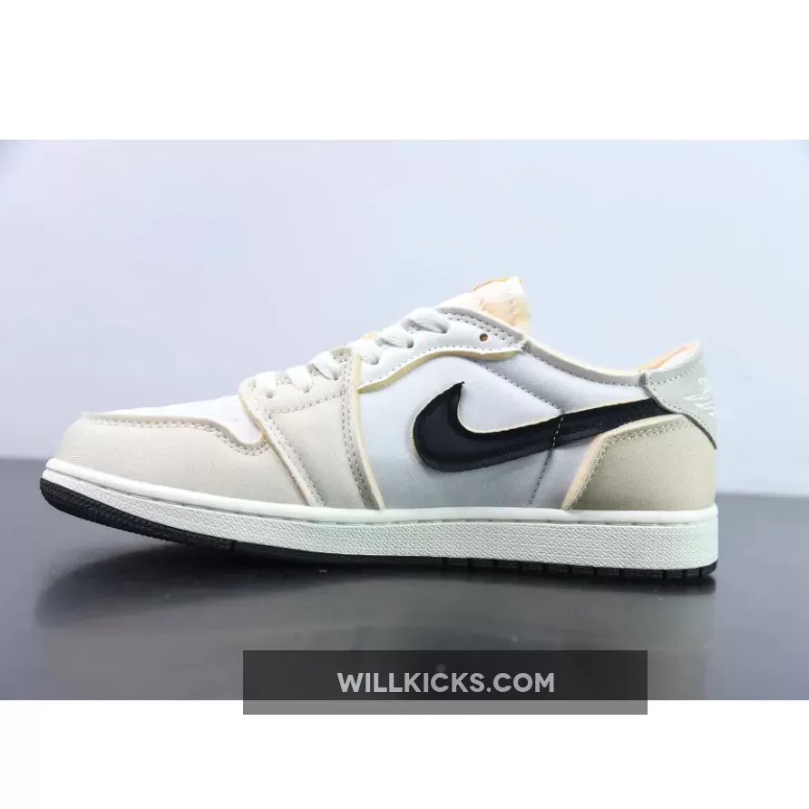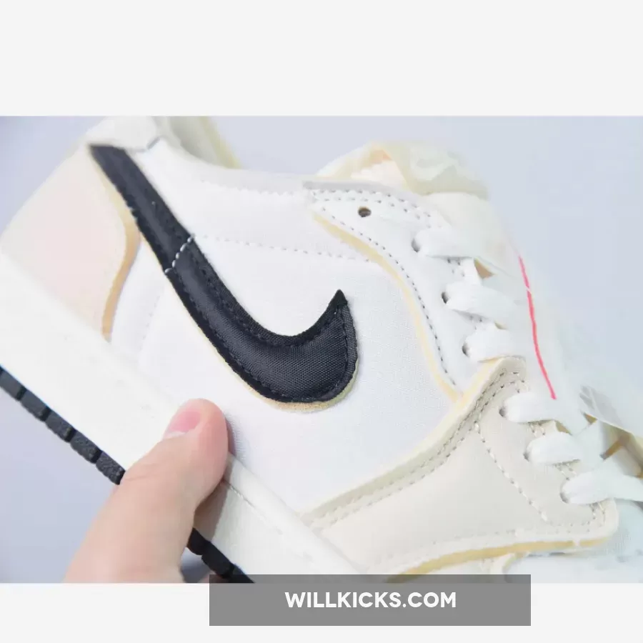 The “Coconut Milk” colorway features the same utilitarian design that focuses on water resistance. Borrowing the silhouette from the Air Jordan 1 Low OG, the shoe features a slightly modified upper. The base layer has a deconstructed aesthetic as the Swooshes and overlays feature exposed foam edges to give it a three-dimensional look. The upper is mostly a crisp, white base, featuring warm grey-sail overlays and a bold, black Swoosh. The shoe sits atop a sail-colored midsole and a black rubber outsole to match the Swoosh. The tongue is dressed in a light pink tone and the Nike Air branding is seen across the tongue tab and insoles while the Air Jordan branding is embroidered onto the heel to round out the design.