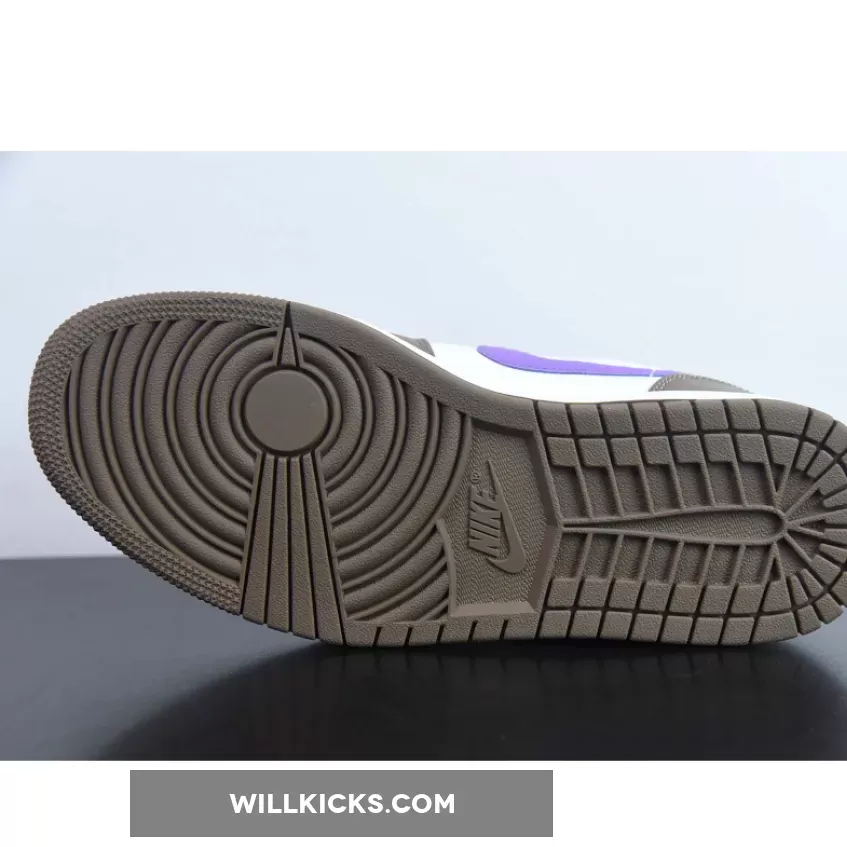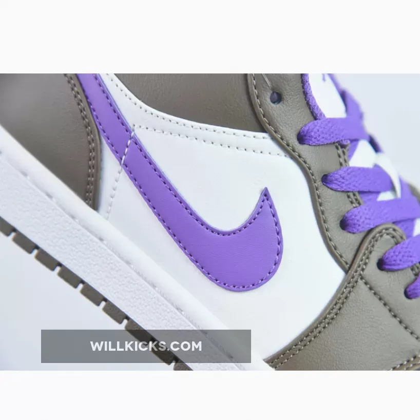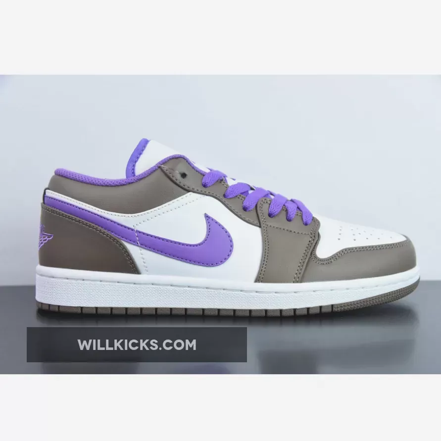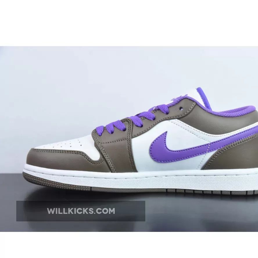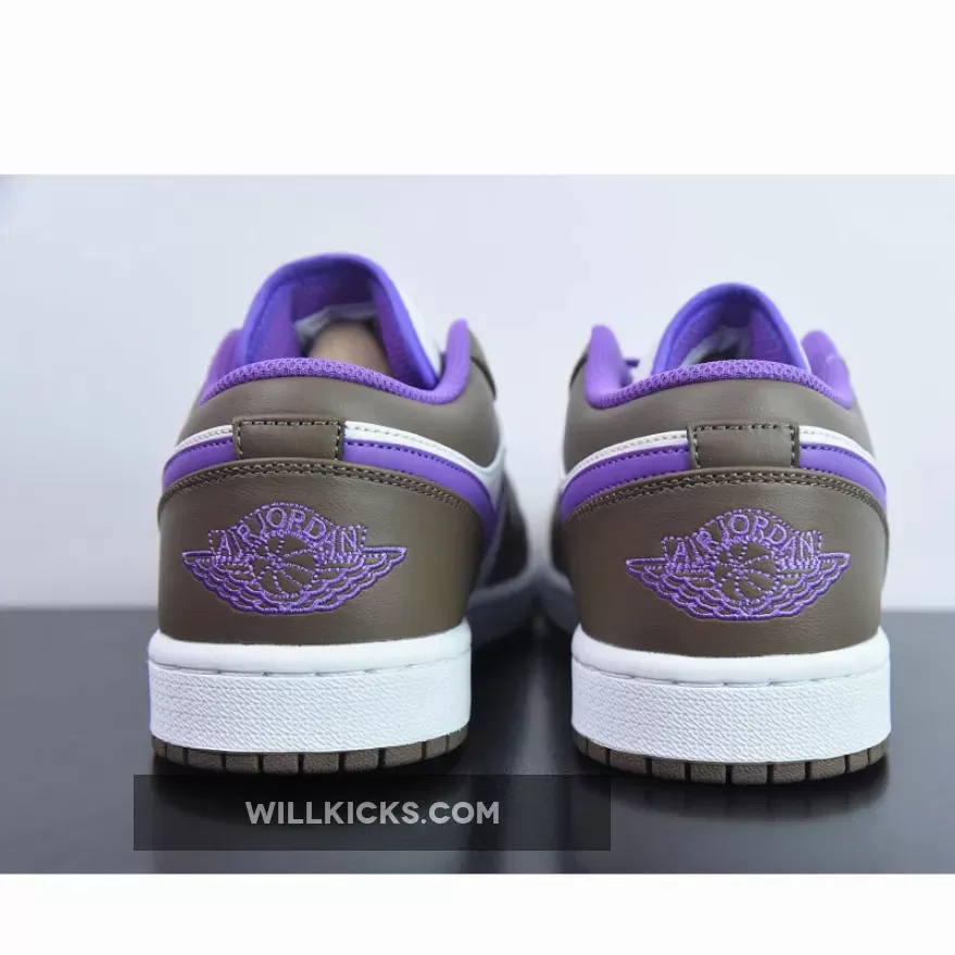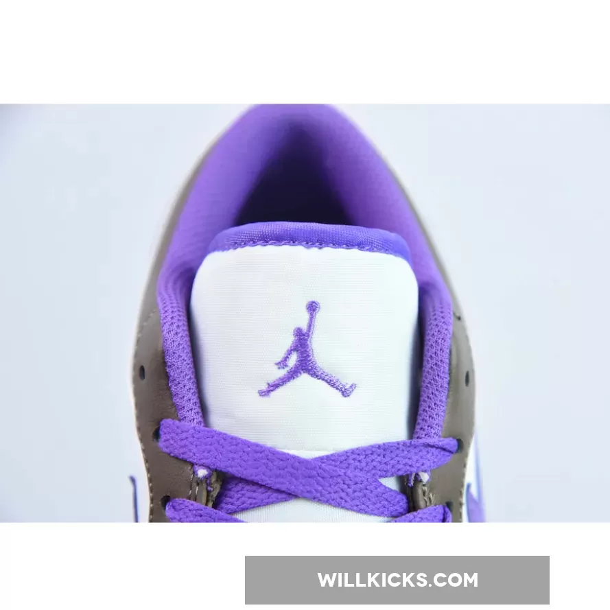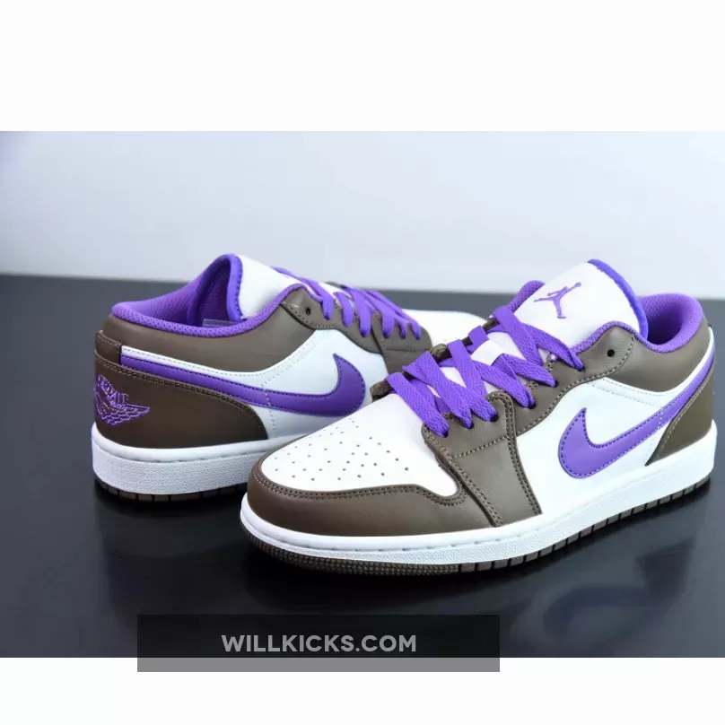 Dressed in a Palomino, Wild Berry, and White color scheme. This offering of the low-top Air Jordan 1 comes constructed in a leather build with mesh tongues and lining. It features a White base with Brown overlays highlighted with Purple contrasting accents. A White midsole atop a Brown rubber outsole completes the design.