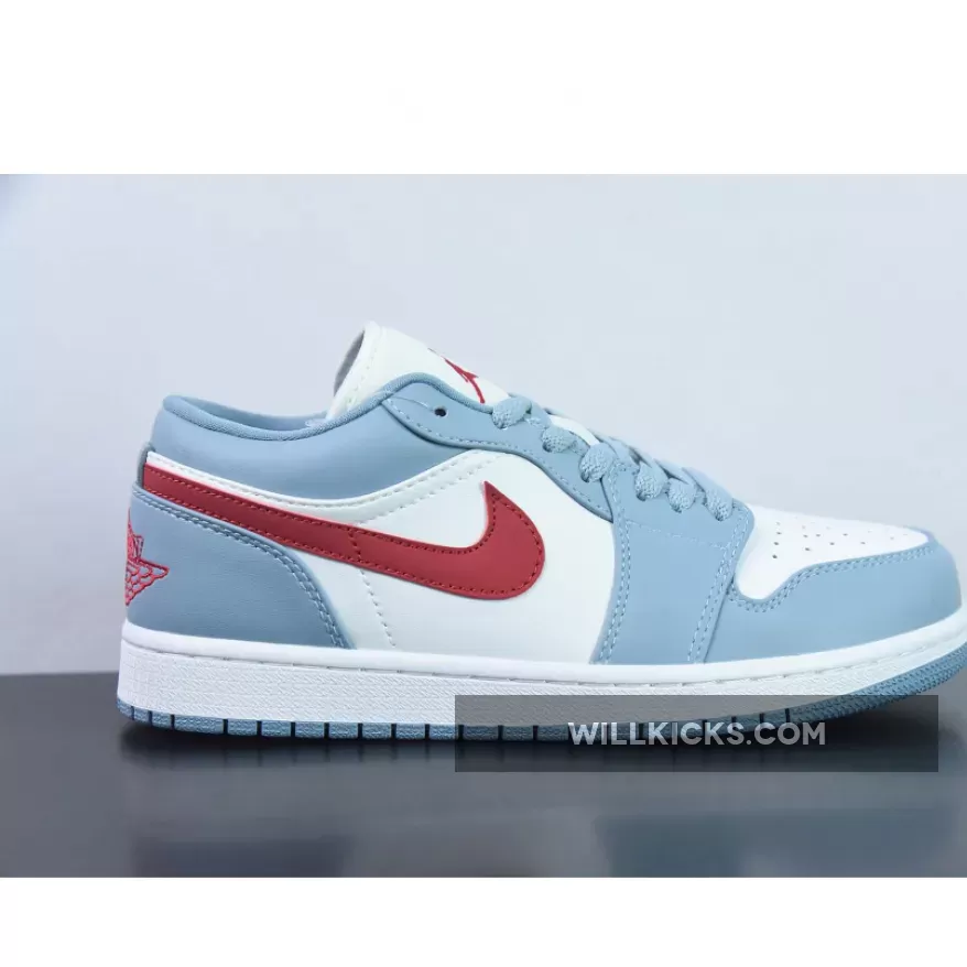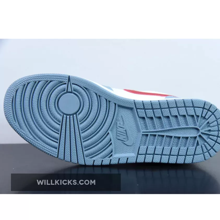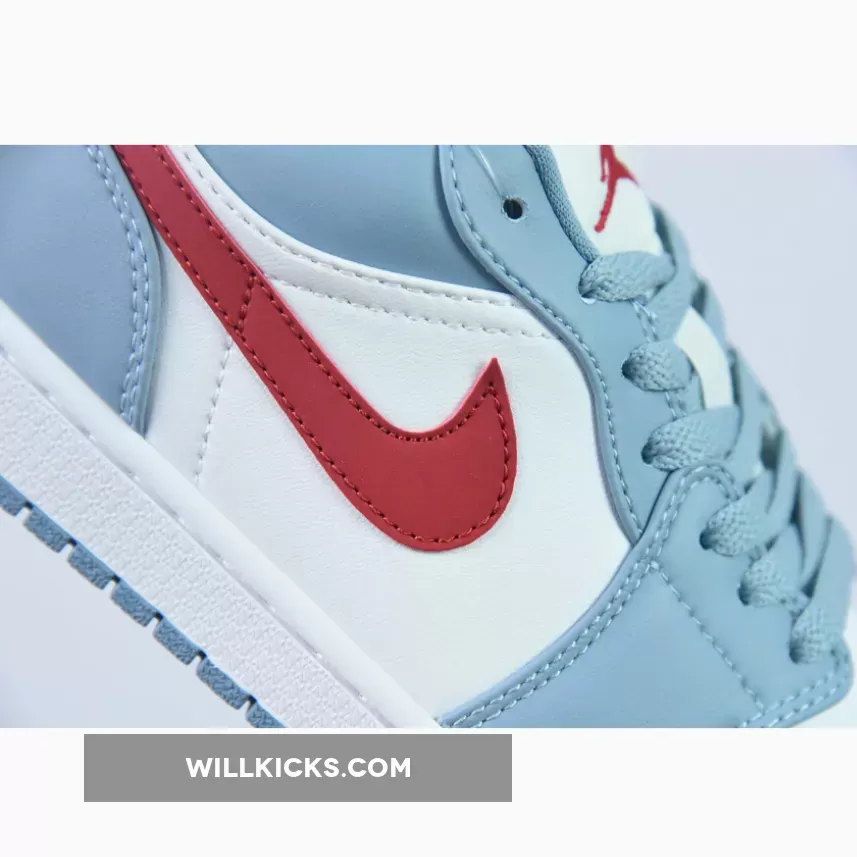 This Air Jordan 1 Low features an all-leather top in white, red, and light blue, similar to the Nike SB Dunk Low “Phillies” from 2022. The mudguard, eyestays, collar, and heel are all covered in a blue-grey hue, while a sail shade appears on the toe box, nylon tongue flap, and quarter panel.
