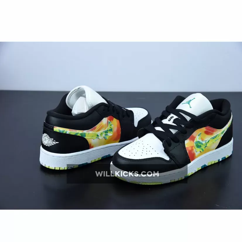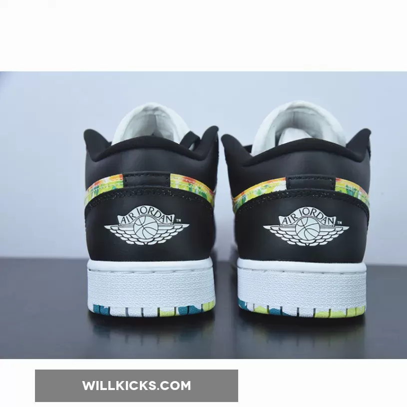 The Air Jordan 1 Low joins the brand’s “Drip Collection”, featuring colourful paint splashes and an artistic treatment of the overlays. Introducing the Air Jordan 1 Low GS Drip. This AJ1 Low has a basic black-and-white construction on the upper, but that’s where the boring part ends. The quarters look like the work of an Impressionist painter, featuring smudged strokes of orange, red, white and pink. The profile Swooshes with “paint drip” edges, on the other hand, show off blue, white, and light yellow hues.