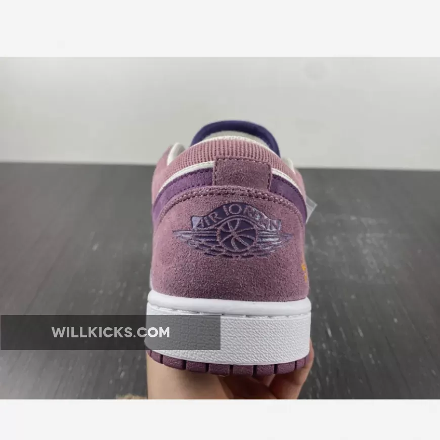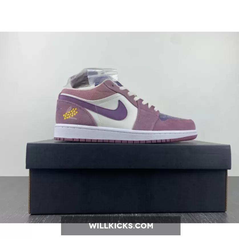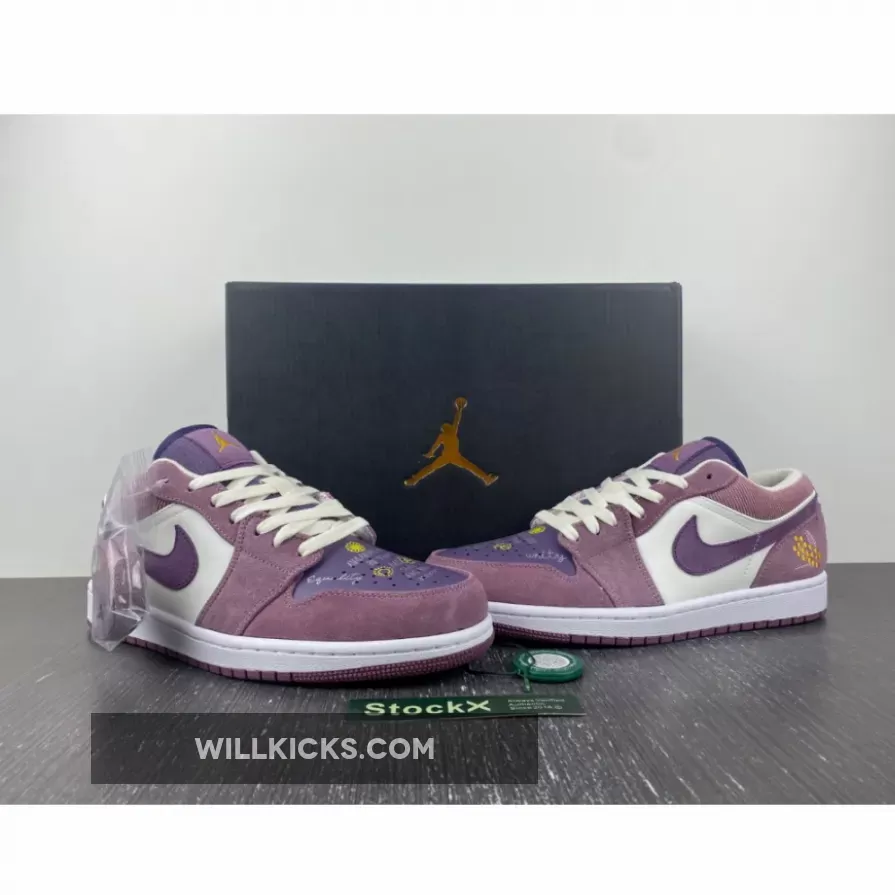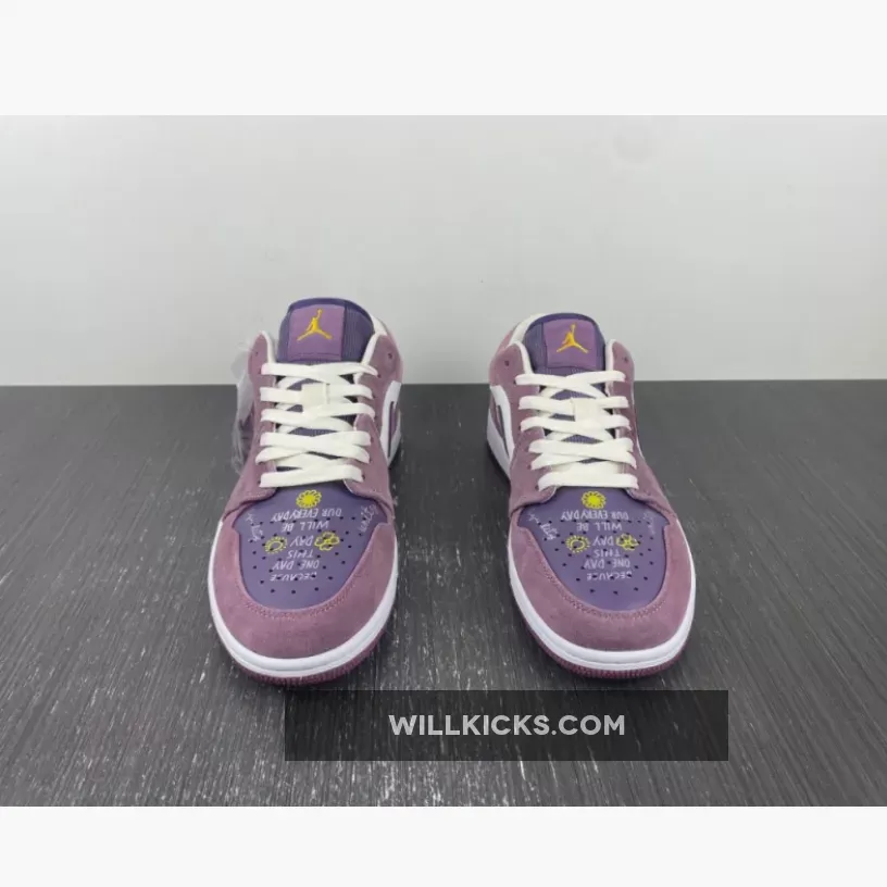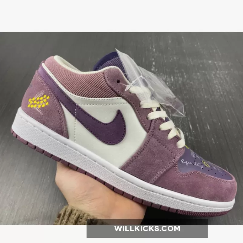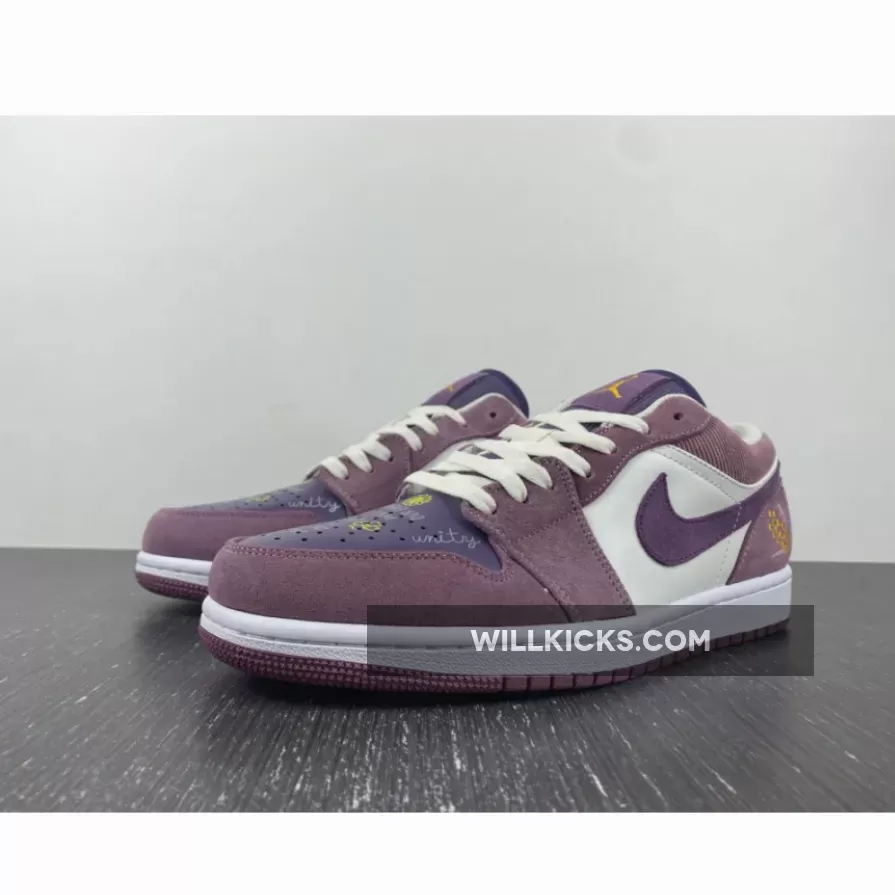 The Air Jordan 1 Low Unity Purple celebrates harmony and solidarity with its “Unity” theme. This vibrant sneaker design showcases dainty cursive text scribbles at the violet perforated toe, which includes the phrase “Because One Day This Day Will Be Our Everyday”, the words “Equality”, and of course, “Unity”. It is also decorated with bright yellow flowers and sun doodles. The rest of the silhouette features a balanced look. The colourless leather quarters are nicely complemented with purple suede overlays while the Swoosh, ribbed corduroy-like tongue is dressed in violet.