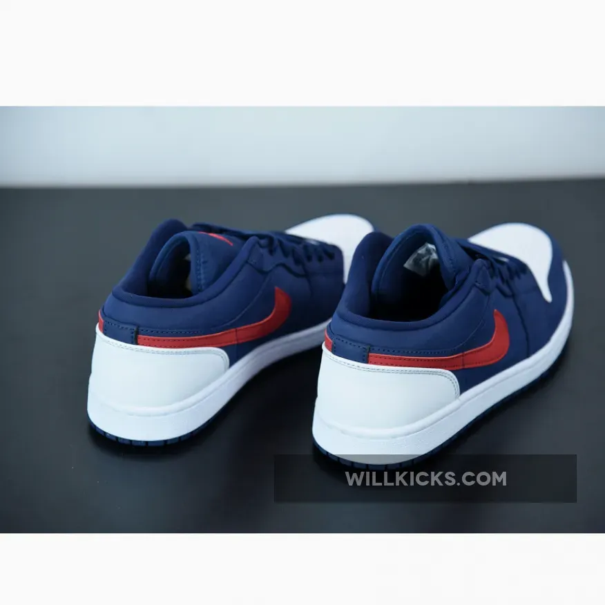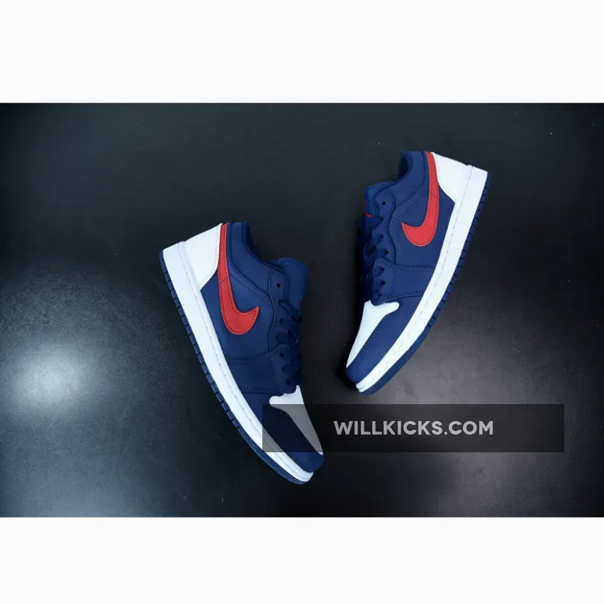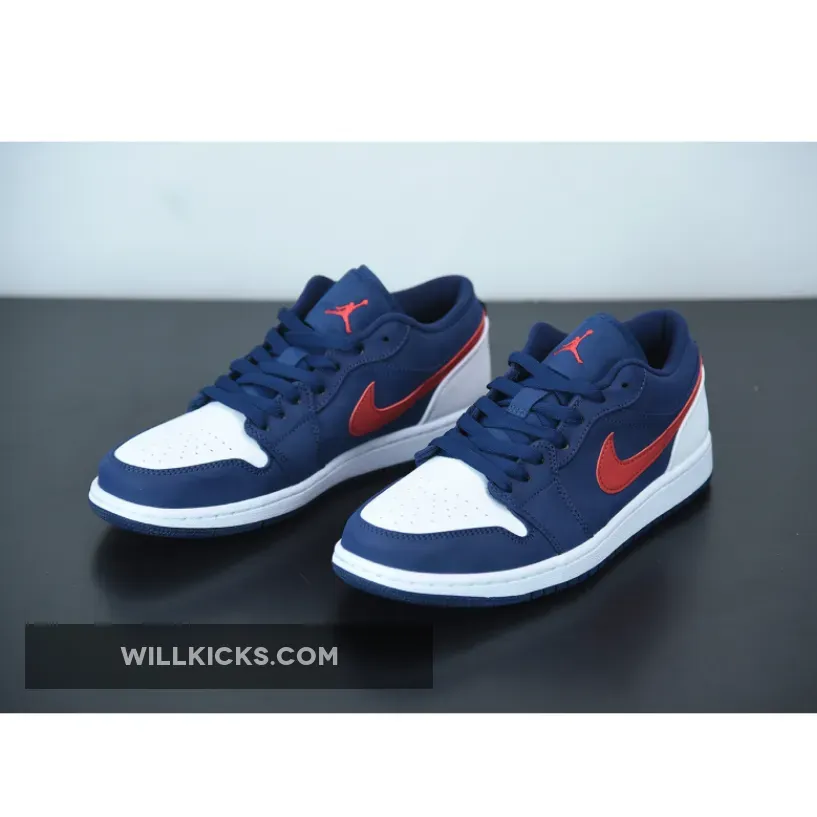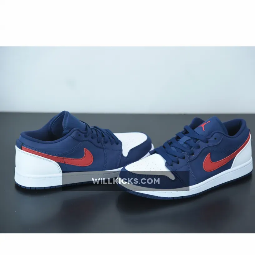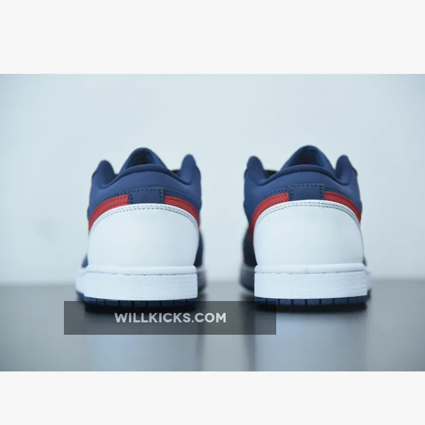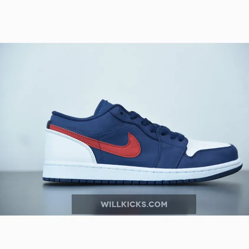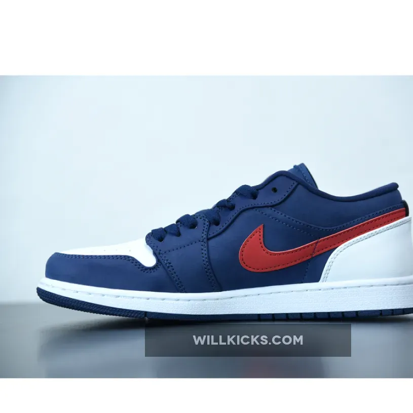 “I’m thoroughly impressed with my Air Jordan 1 Low ‘USA’! The navy blue and red color combo is sleek and stylish. The premium leather upper feels luxurious, and the white accents add a nice touch. Comfortable fit and great arch support. Definitely recommend for any sneaker enthusiast!”