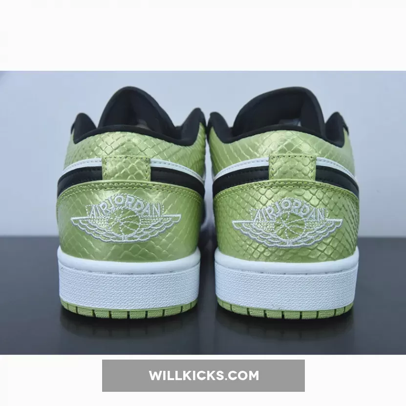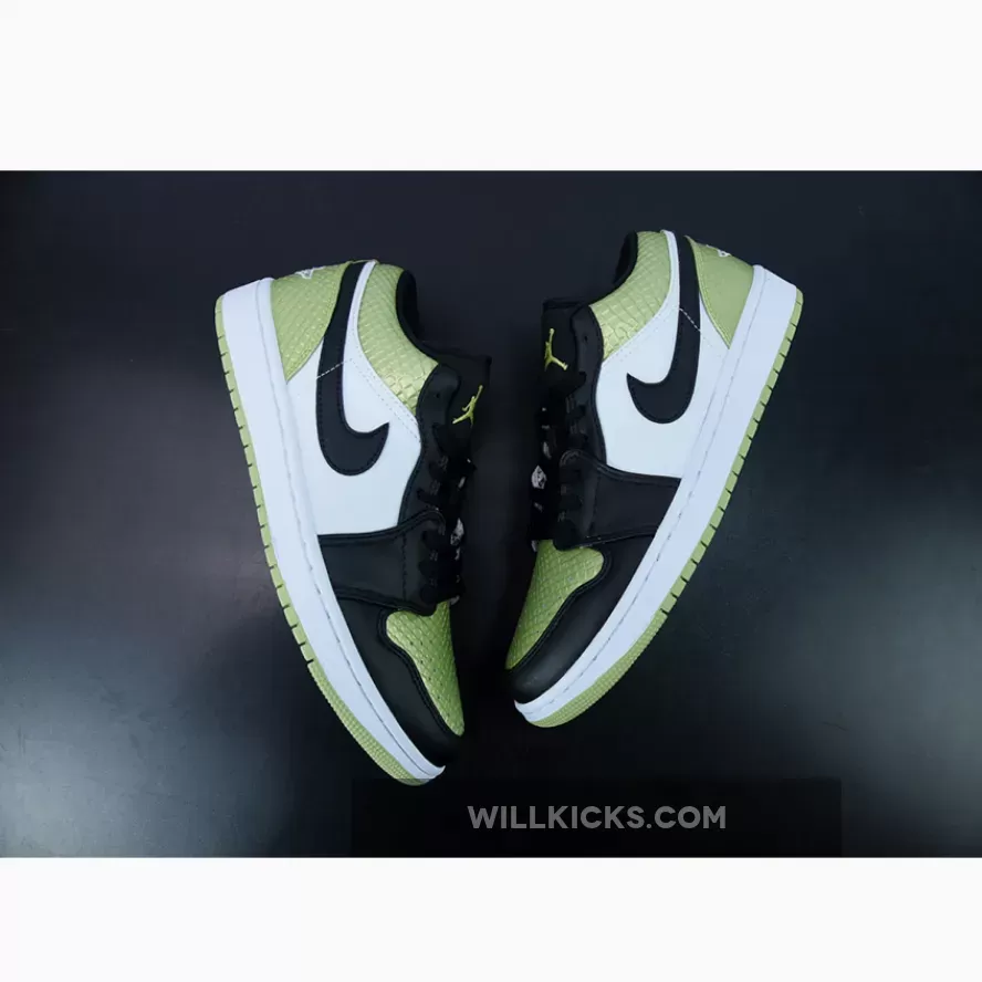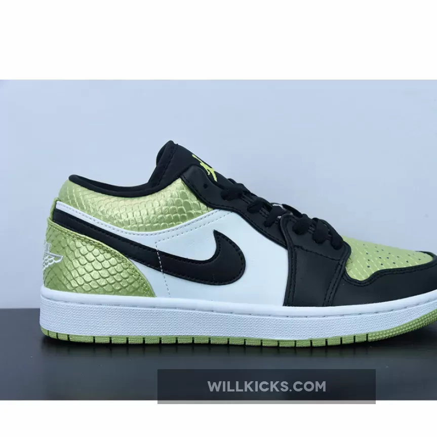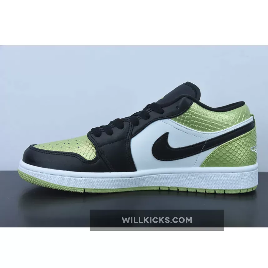 Slither into the Air Jordan 1 Low Vivid Green Snakeskin for an instant dose of striking style. Lime green snakeskin-patterned leather instantly takes the spotlight as it animates the toebox, collar and heel. Adding sleekness to this Air Jordan 1 Low’s bold base are the hits of black via the smooth overlays, comfy tongue and sleek Swooshes. Meanwhile, bright white side panels provide a visual balance.