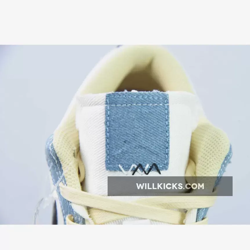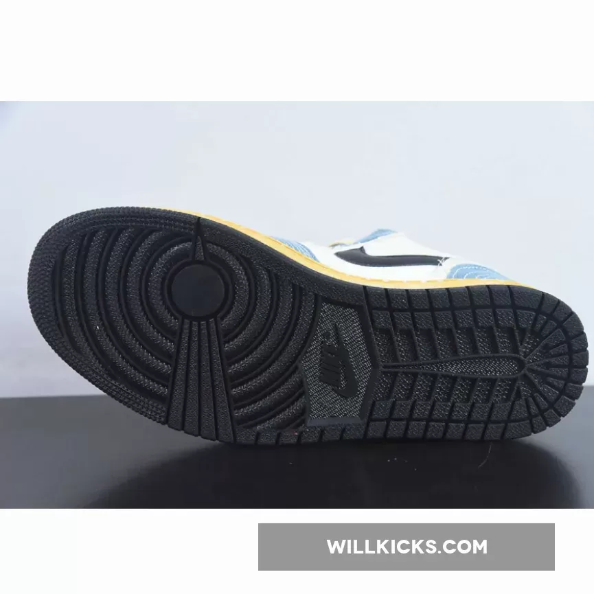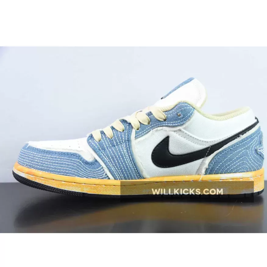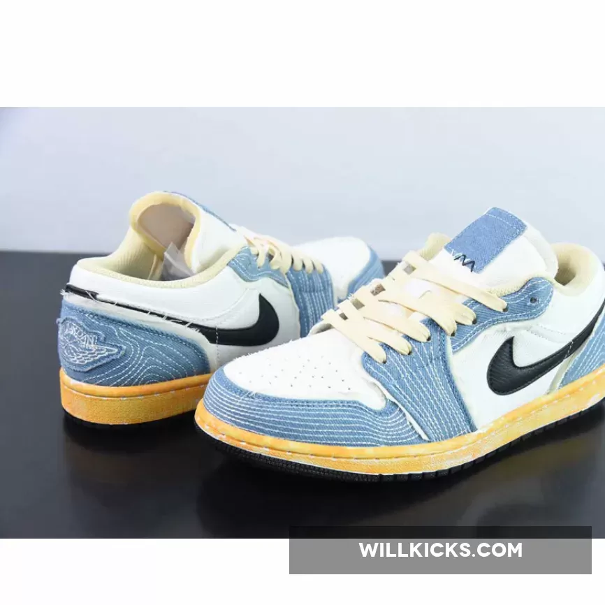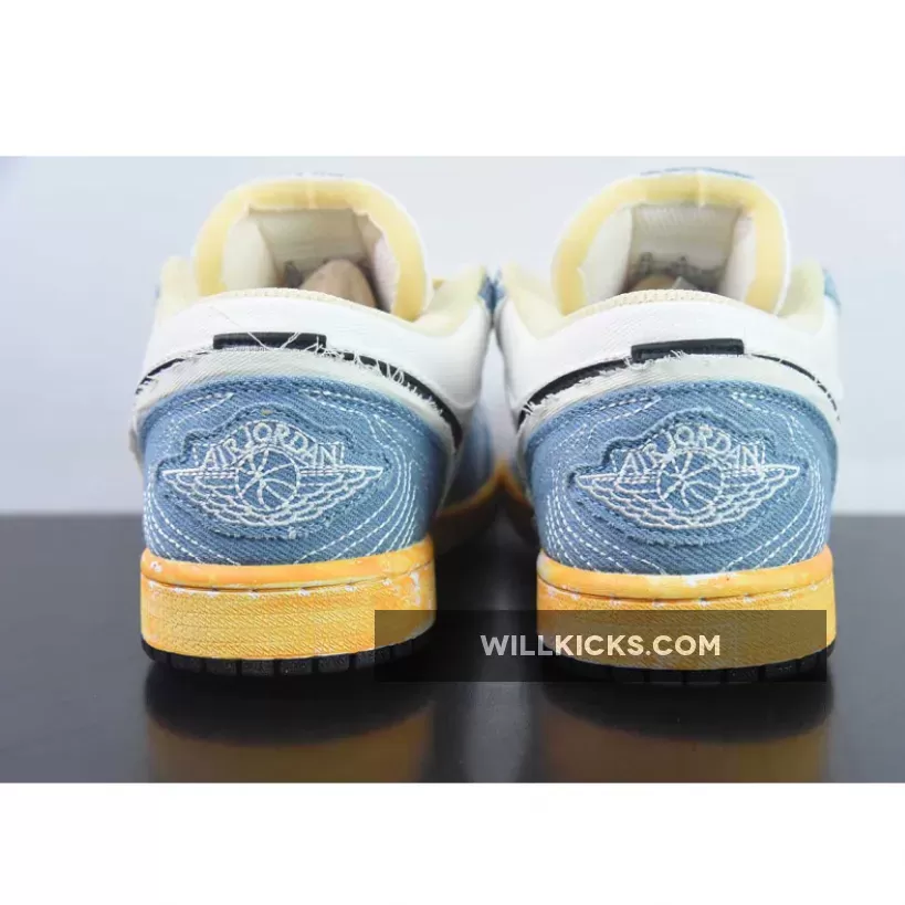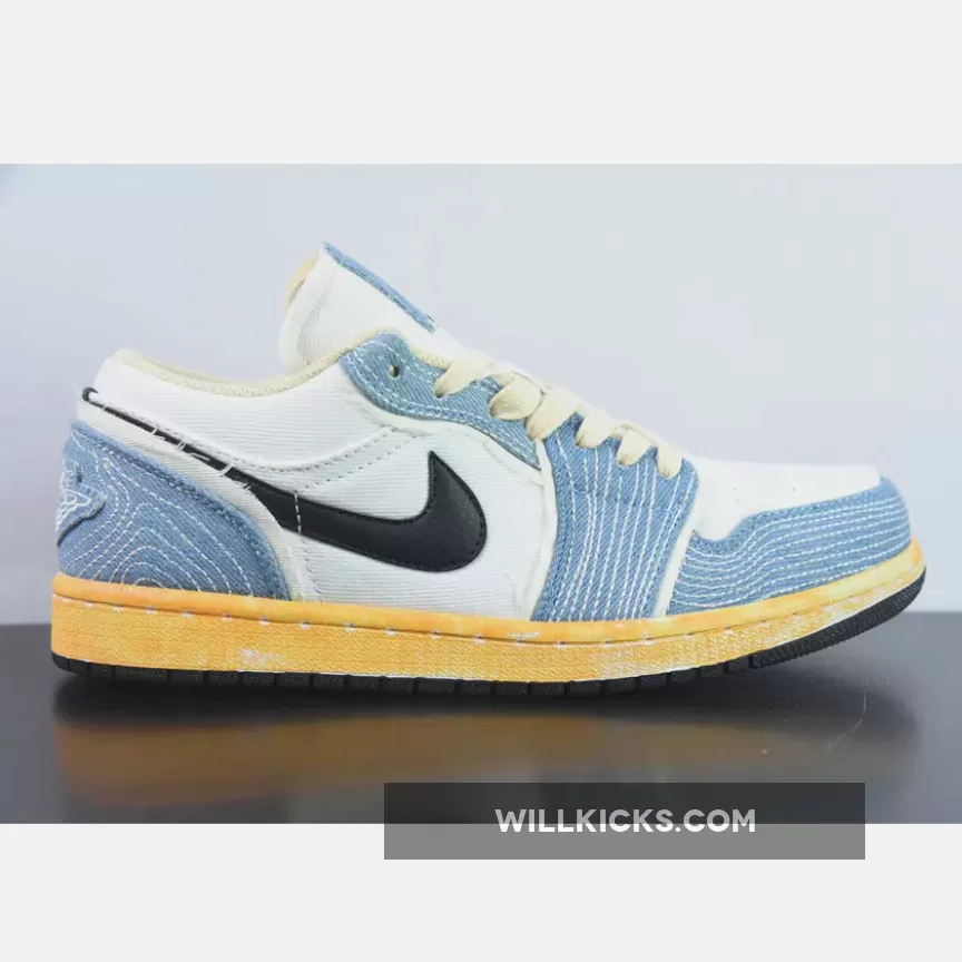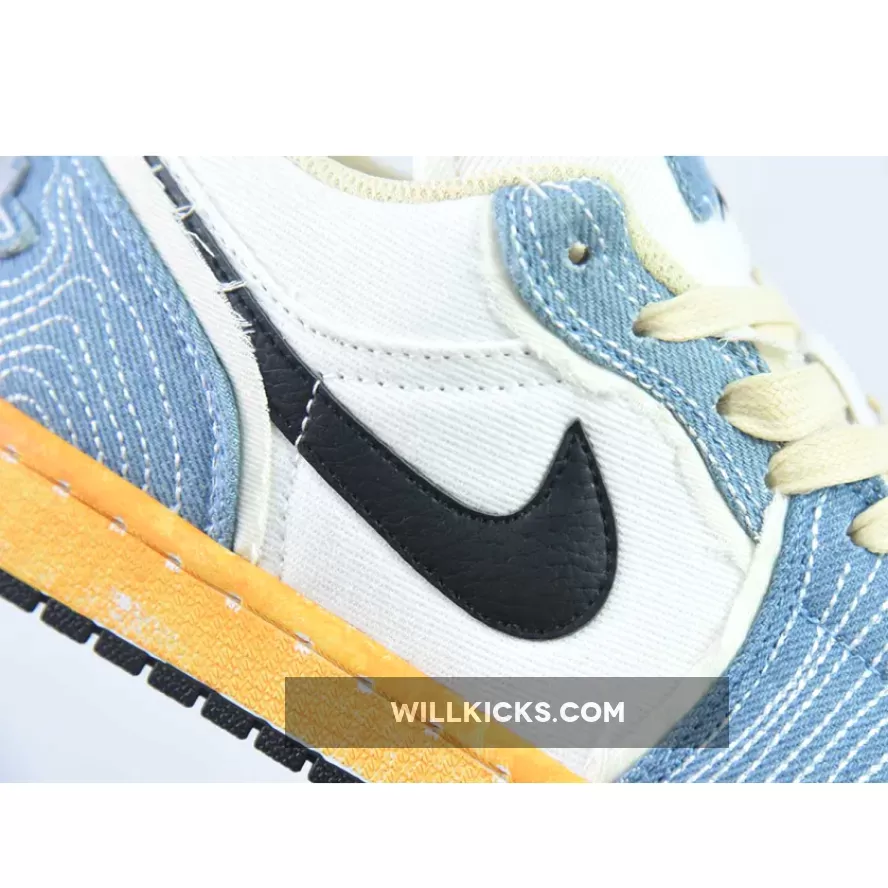 Once more paying homage to the traditional Japanese craftsmanship, the Air Jordan 1 Low Sashiko is given an aged aesthetic made up of a White canvas base with distressing and wear denim fabric overlays taking care of the the toe box, forefoot, eyestay, and heels with frayed edges.