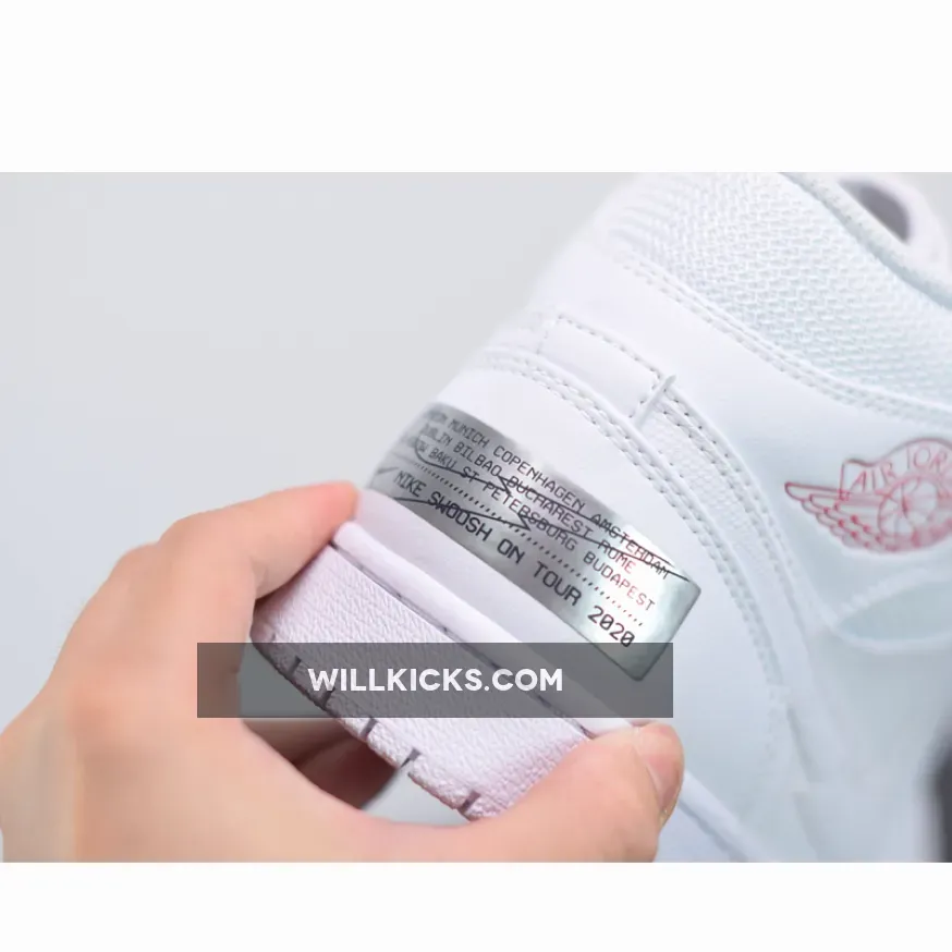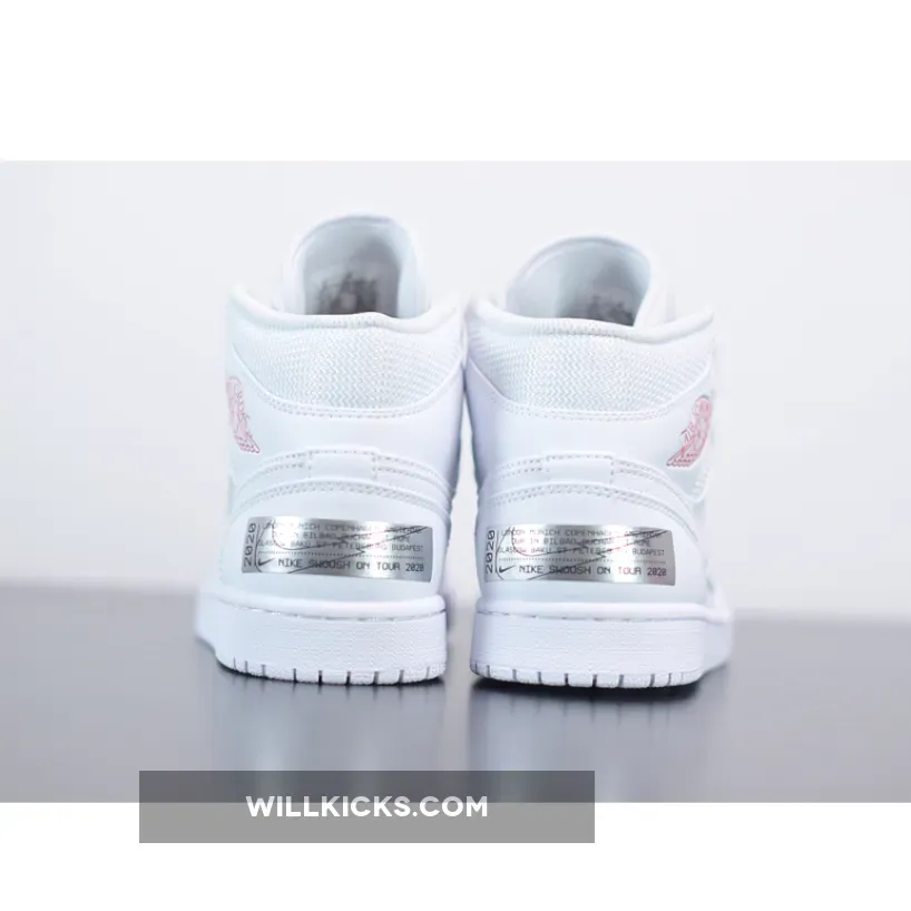 The Air Jordan 1 Mid SE ‘Euro Tour’ showcases a traveling theme that underscores the international reach of the Jordan franchise. Stamped in red, the classic Wings logo stands out against the sneaker’s white leather backdrop. An added mini-Swoosh is embroidered on the lateral forefoot, complementing a larger misaligned Swoosh in the same white finish. The heel overlay is embellished with a silver tour badge that lists a dozen European cities.