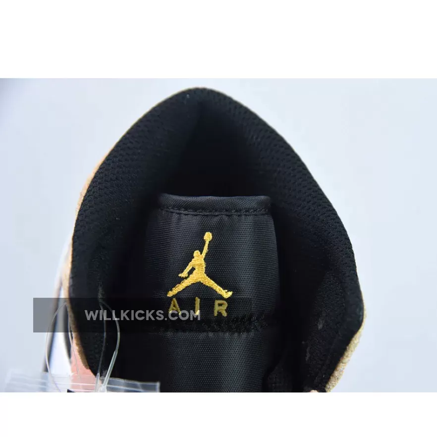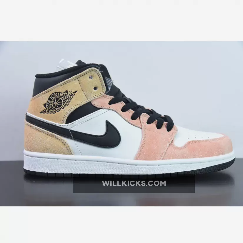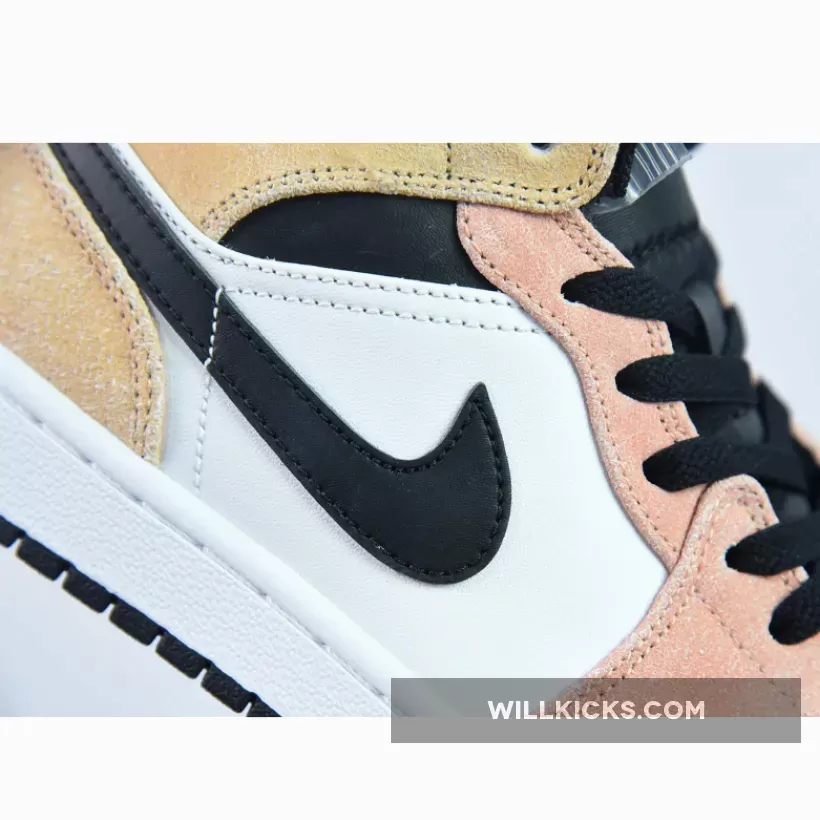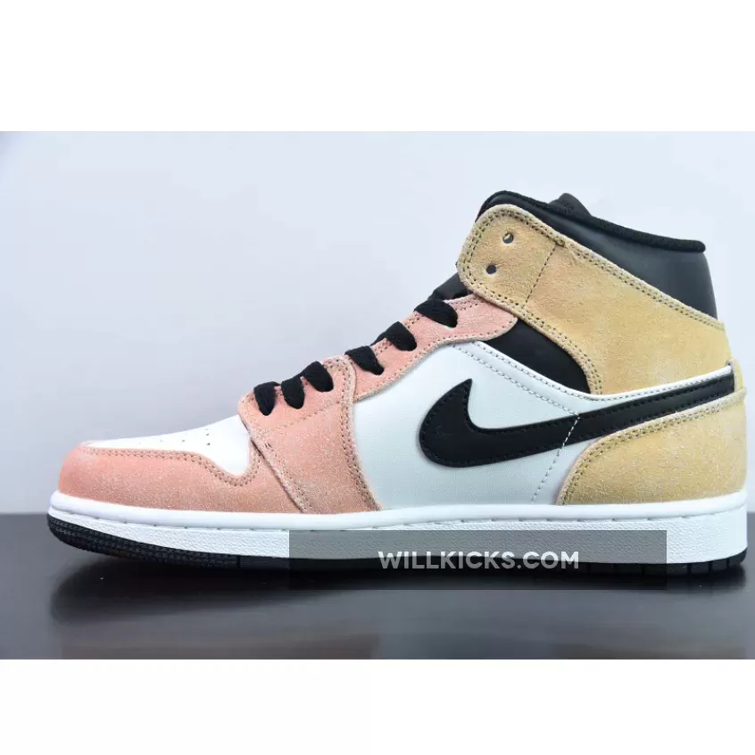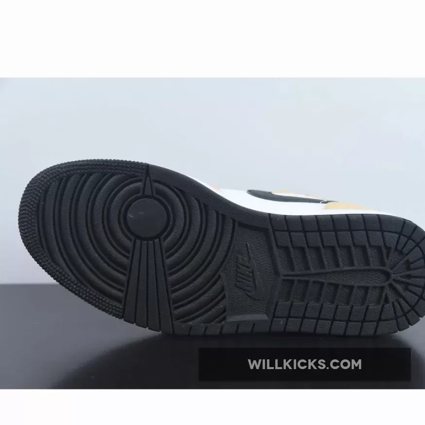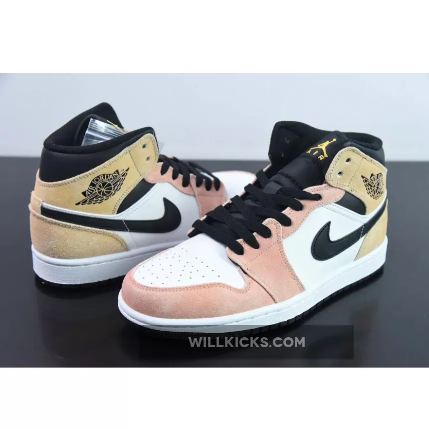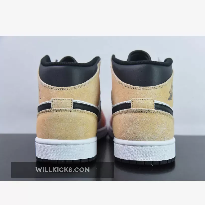 the pair possesses a dusk-like graduation from orange suedes at the toe to golden tints in the rear. It’s met in the middle — and at the toe — by bright white leathers, with bold blacks in support at the collar, Swoosh overlays, liners, laces, and tongue. The embroidered Jumpman logos on the tongues are Gold while the Wings logos on the lateral collar flaps are stamped in black. A white midsole and a black rubber outsole wrap up the look of this sneaker.