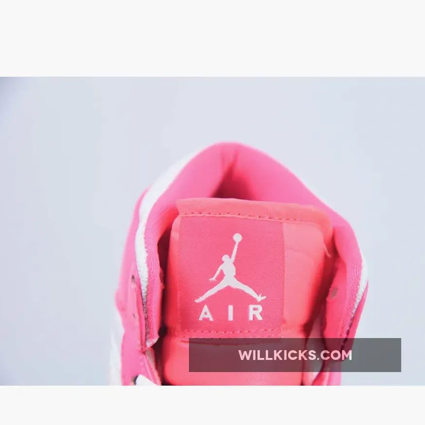 The Hyper Pink White Air w Jordan 1 Mid has a padded collar and tongue for support and cushioning, which makes it ideal for all-day wear. The Air Jordan wings logo can be found on the heel, and the Nike Swoosh is located on the sides. The sneaker has a rubber outsole that provides excellent traction and durability, allowing the sneaker to withstand the wear and tear of frequent use. The laces also come in a white color, and the Jumpman logo is visible on the tongue.