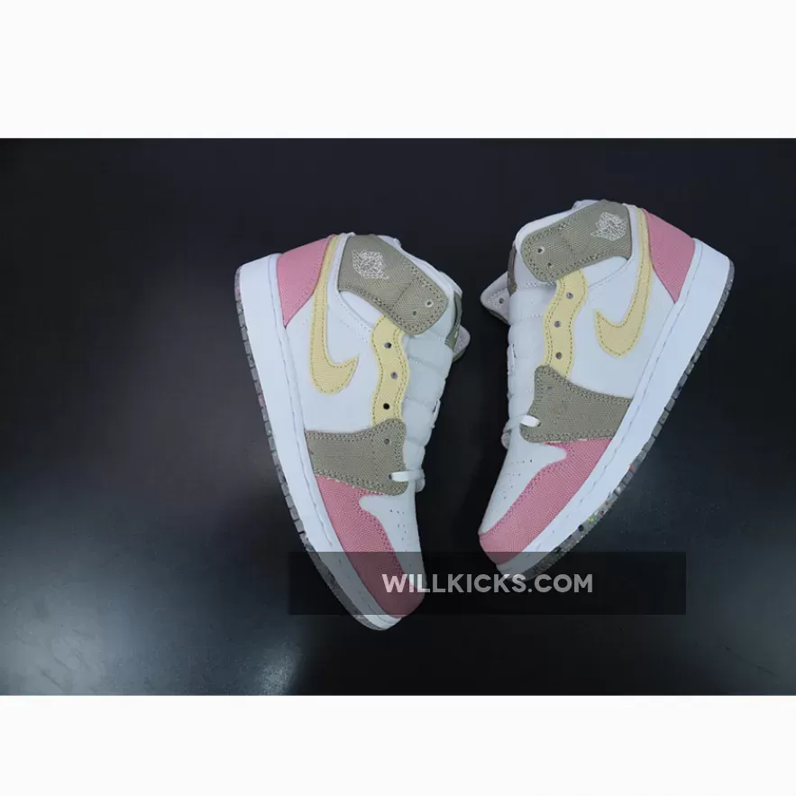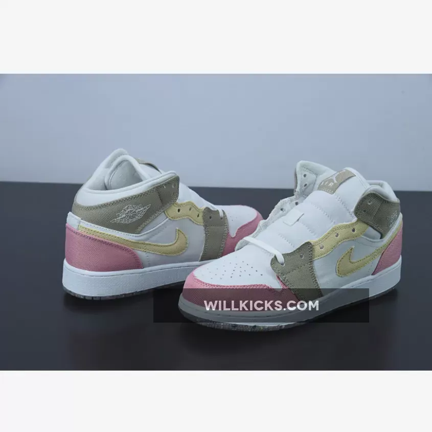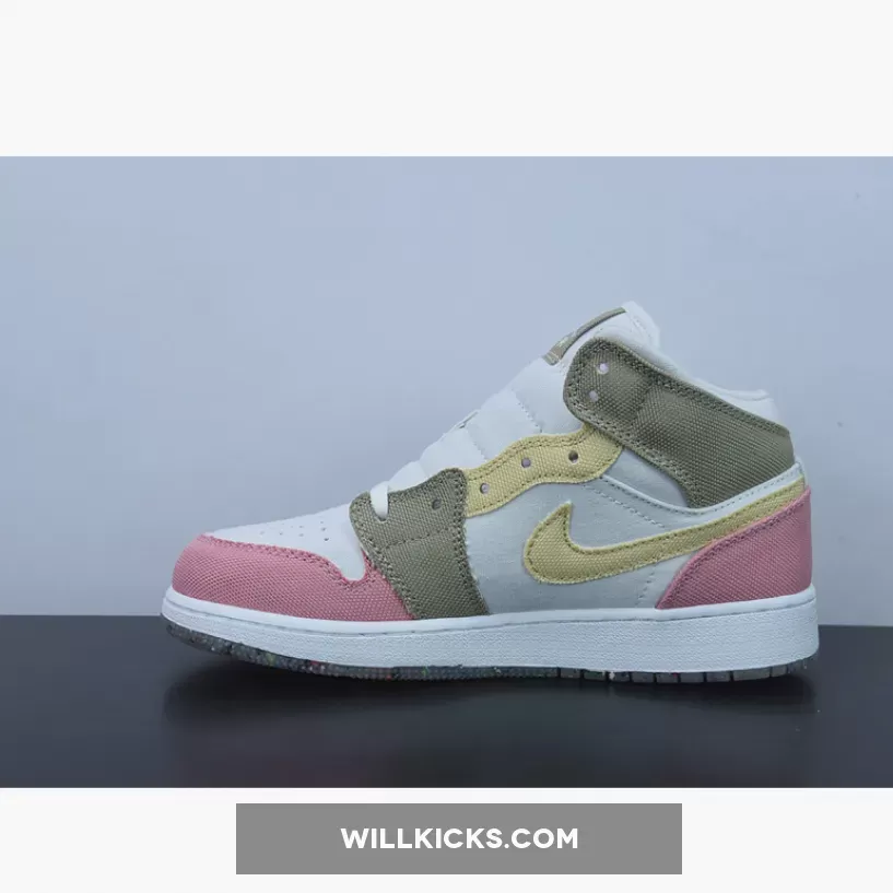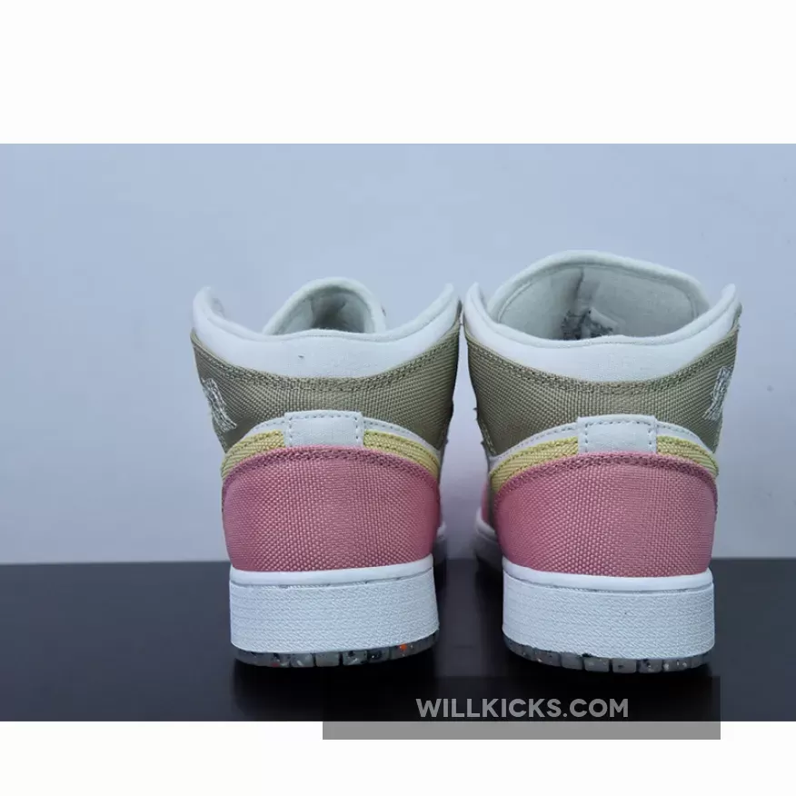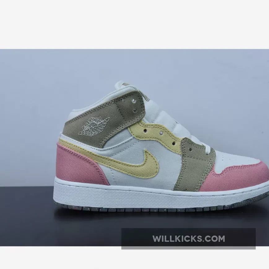 The Air Jordan 1 Mids have never shied away from experimentation. The new Air Jordan 1 Mid GS Pink Tan is its newest iteration, coming to you in recycled canvas, a pastel colourway and a smaller size.The base of the upper is a clean white recycled canvas, matching the laces. This makes it a great background for the rest of the shoe’s colourful details. The toe cap is in a Pink canvas, matching the cupsole. The signature profile Swooshes on the mid-panel on both the medial and lateral sides are in a peachy-looking Beige as is the eye stay panel. The mudguard and the collar flap are both in a Tan canvas. The Jumpman on the tongue tab is embroidered in white over Tan canvas, echoing the Wings logo embroidered on the collar flap. The midsole is a clean white. Another great detail on this shoe is the light grey speckled Grind outsole, indicating that this model is part of Nike’s “Move to Zero” campaign. Nab the Air Jordan 1 Low GS Pink Tan on Our Store Supplier app and always get first dibs on the latest Air Jordan sneaker drops.