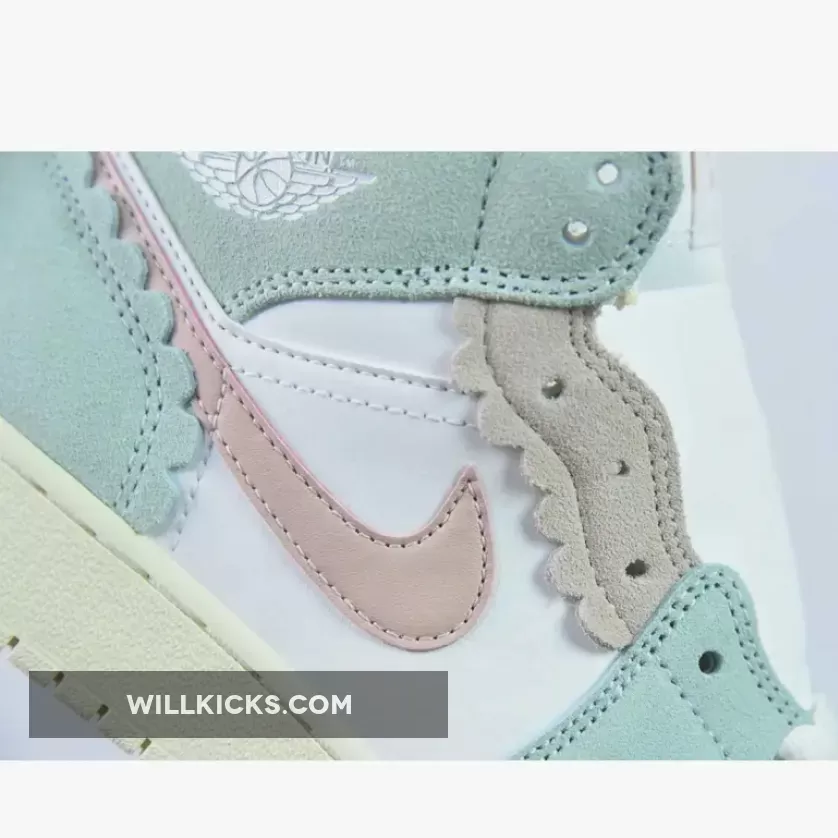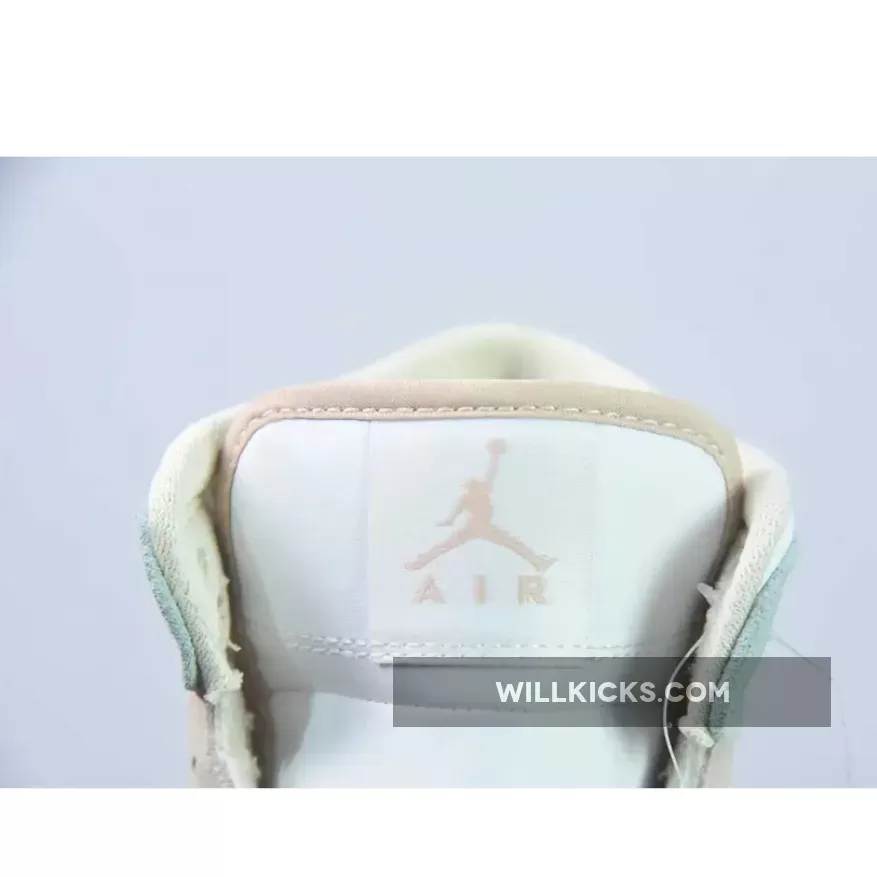 Dressed in a White, Pink Oxford, Jade Ice, Guava Ice, and Coconut Milk color scheme. This offering of the mid-top Air Jordan 1 comes constructed with a White leather base, suede pastel-colored overlays detailed with scalloped edges. Pale orange comes in via the mudguard and upper eye stays, while the lower eye stays, collar overlay and heel panel introduce a soft mint. Branding-wise, you get the signature Swoosh motif partially nestled under one of the scalloped trims for a fun, summery touch. Finally, the gum midsoles introduce a sandy-beige hue and come textured with micro spikes and ridges for traction.
