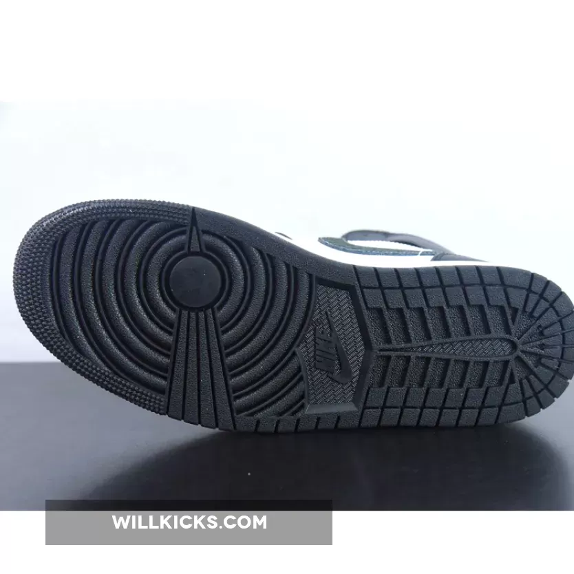 This special edition, mid-top AJ1 pays homage to the iconic Nike Dunk Low “Panda”, featuring a two-tone black and white colour palette. Black leather overlays on the mudguard, eye stay panel and heel panel are complemented by a white leather toe box and mid-panels. A white nylon tongue, on the other hand, contrasts with the black laces.