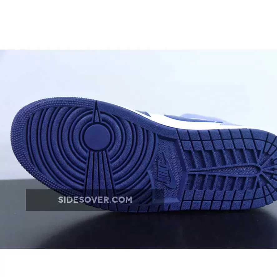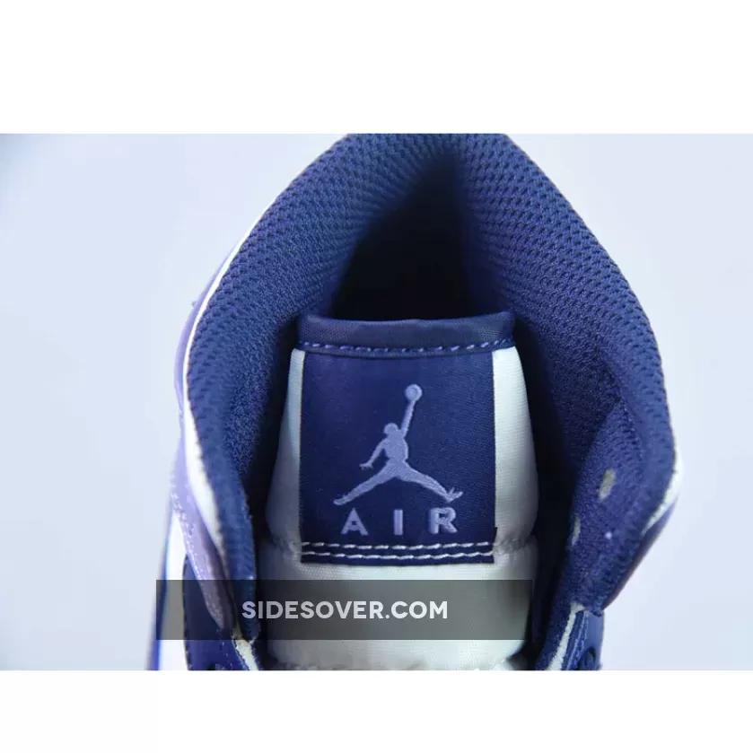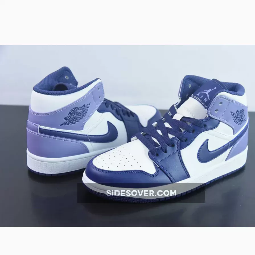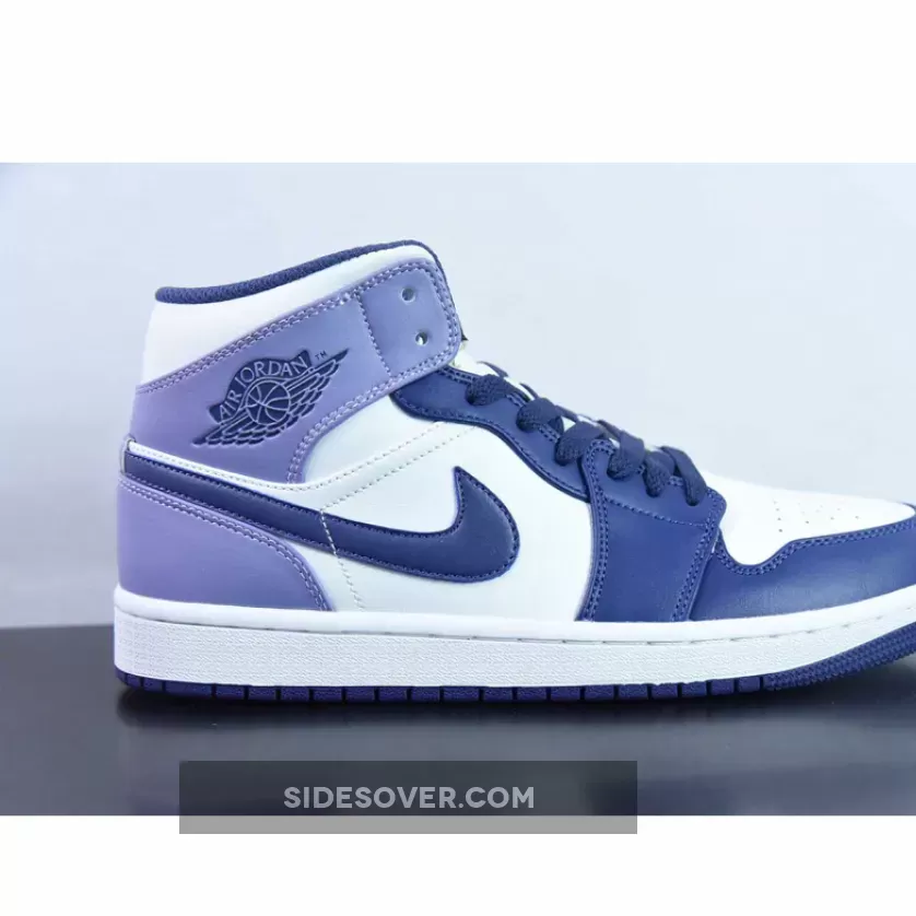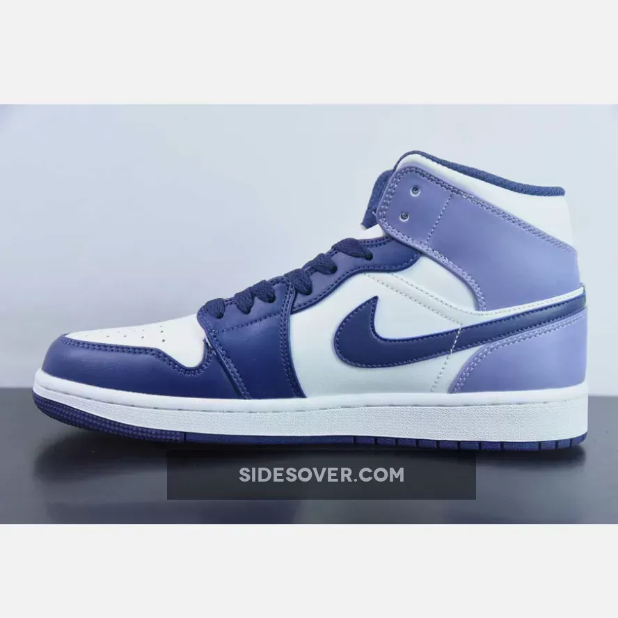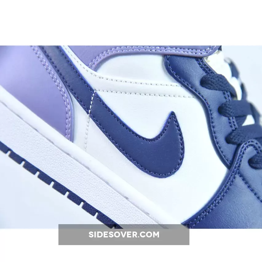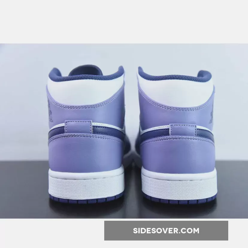 This offering of the Air Jordan 1 Mid features a full leather build on the upper with White serving as the base hue and two different shades of purple seen on the overlays.