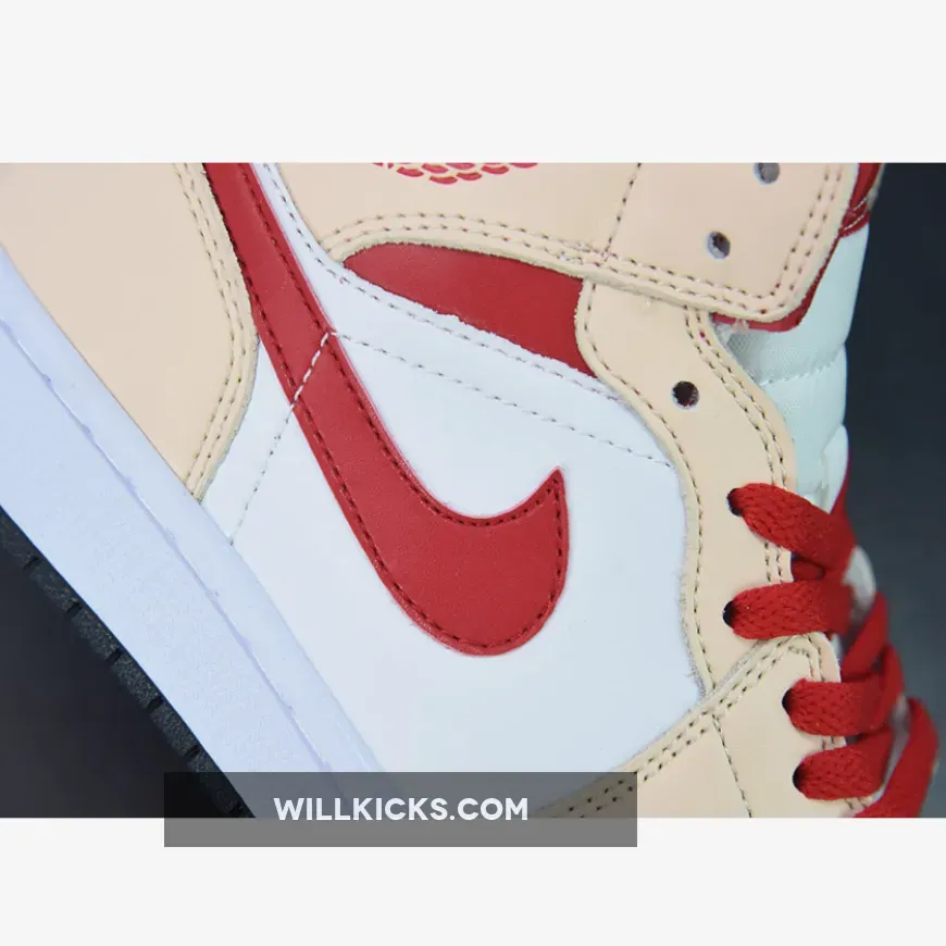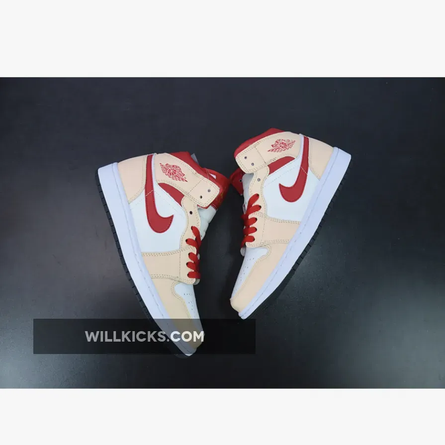 Pairing pure white with beige leather overlays, the Air Jordan 1 Mid Beige Red (GS) for grade schoolers is anchored in a calm, relaxing mood.