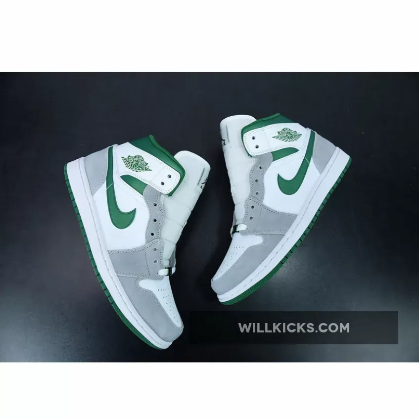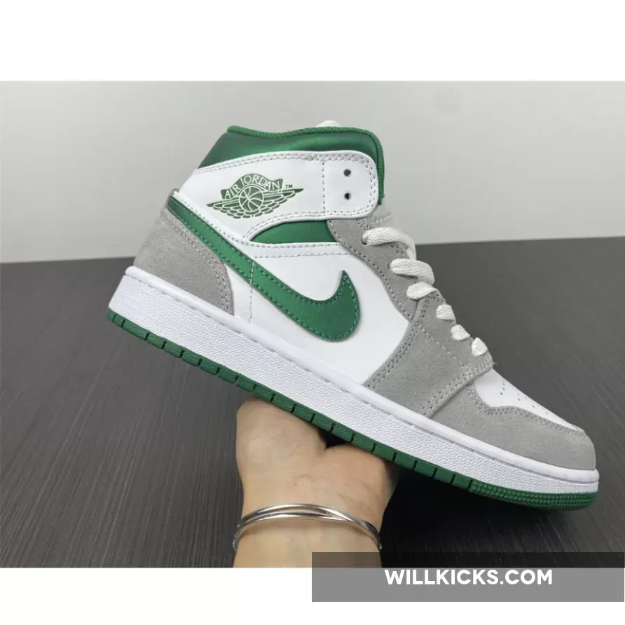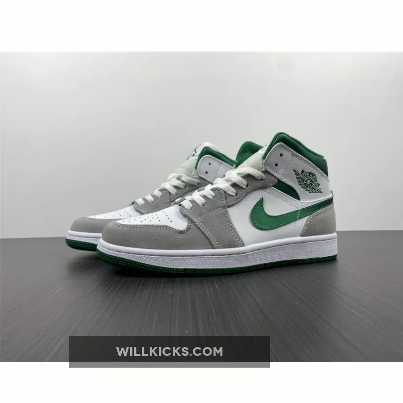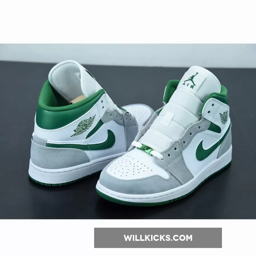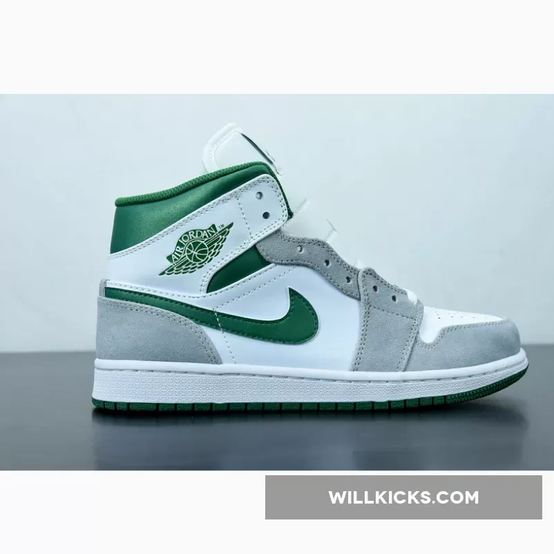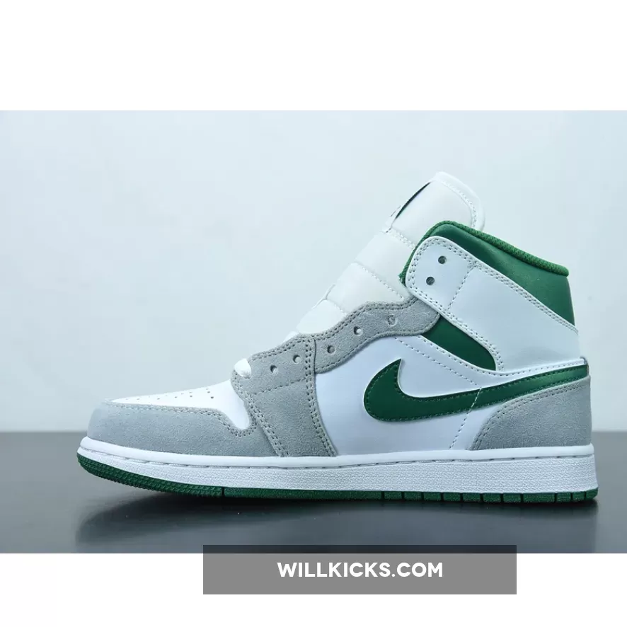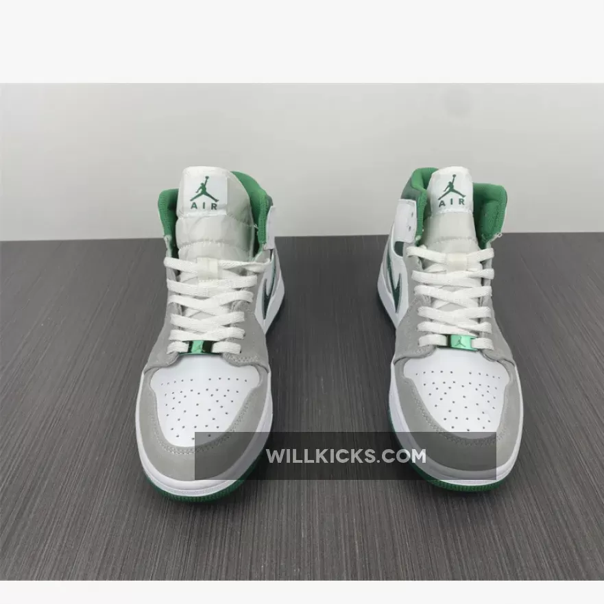 Add instant freshness to your ensemble with the Air Jordan 1 Mid White Grey Pine Green. This stylish pair’s crisp design begins with a classic white smooth leather that remains exposed in the side panels and perforated toe box. Suede overlays in the toe cap, mudguard, eye stay and heel adds a nice contrast to the colourless base. All in all, this versatile Air Jordan 1 Mid is a great companion for your fashionable fits.