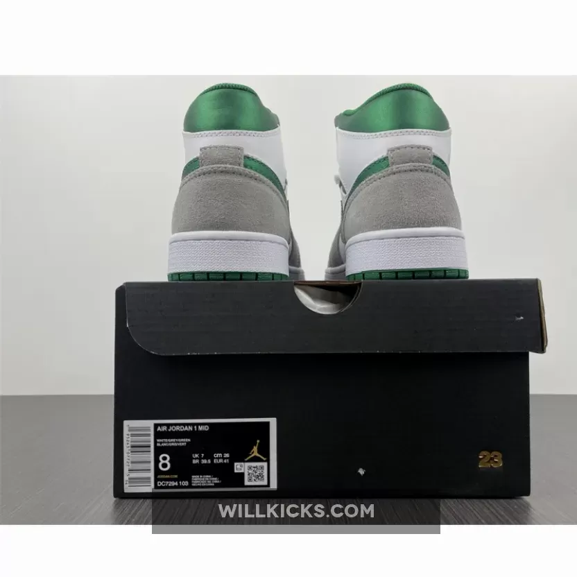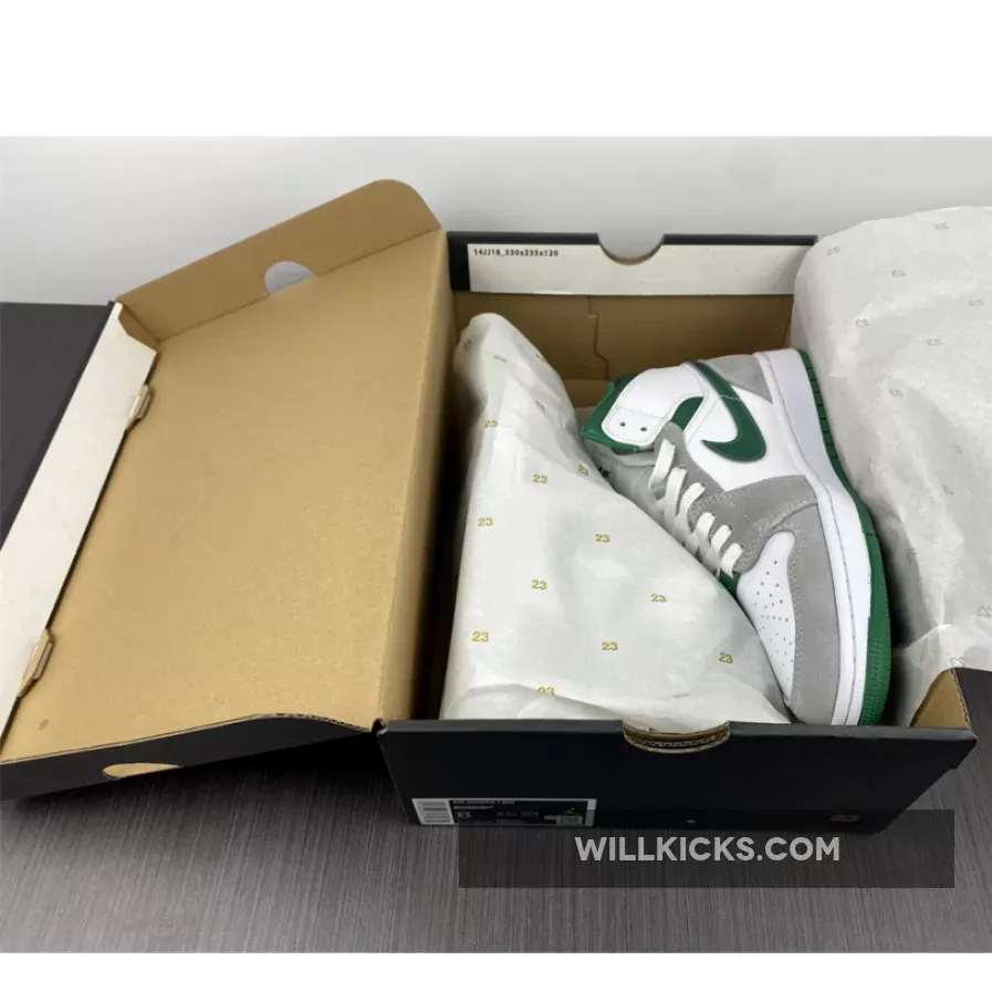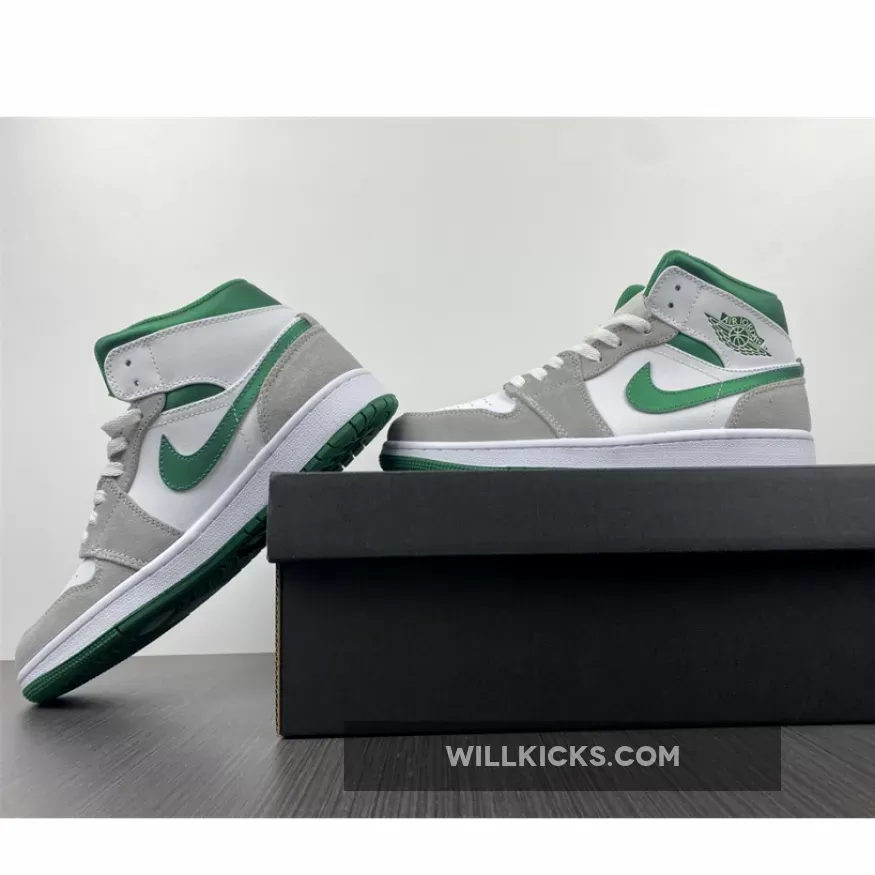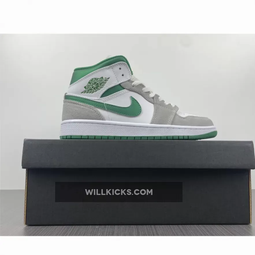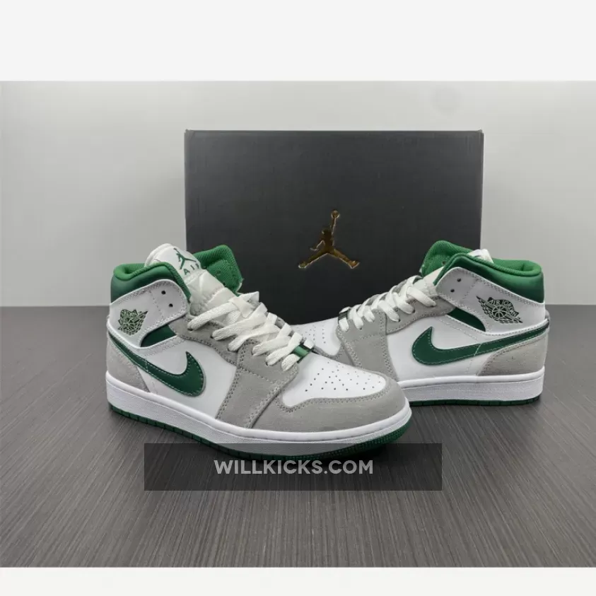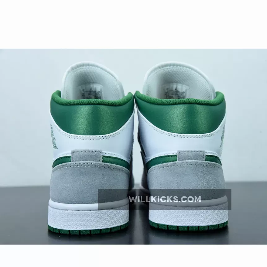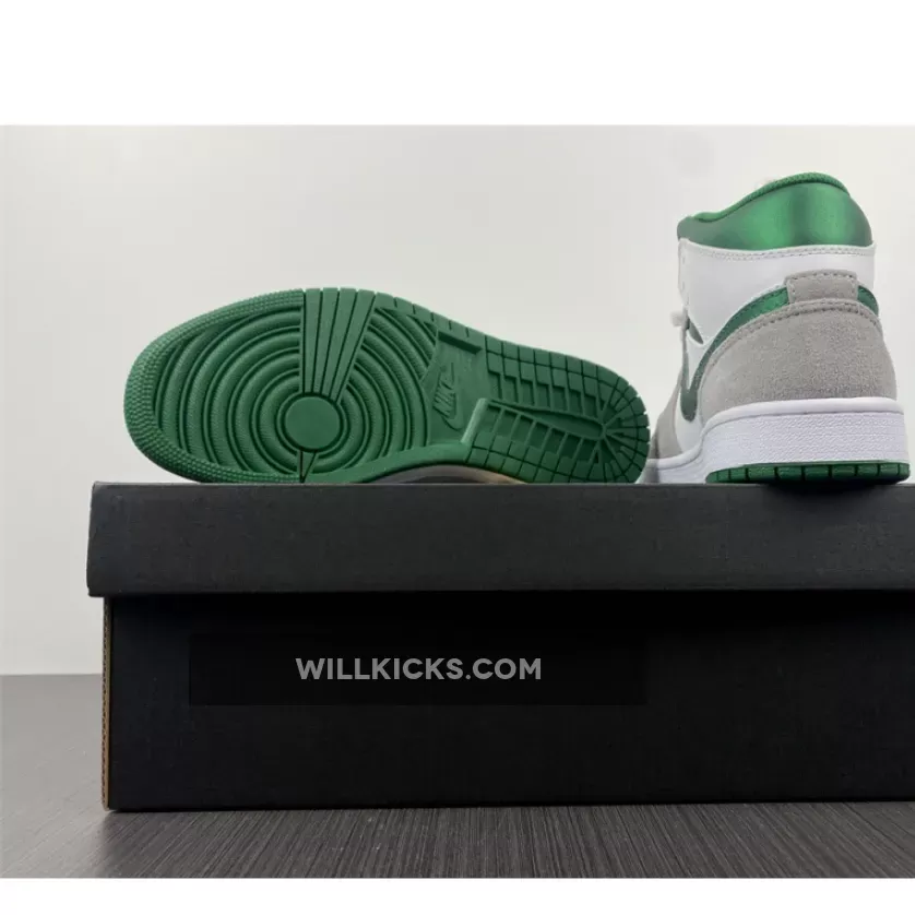 Add instant freshness to your ensemble with the Air Jordan 1 Mid White Grey Pine Green. This stylish pair’s crisp design begins with a classic white smooth leather that remains exposed in the side panels and perforated toe box. Suede overlays in the toe cap, mudguard, eye stay and heel adds a nice contrast to the colourless base. All in all, this versatile Air Jordan 1 Mid is a great companion for your fashionable fits.