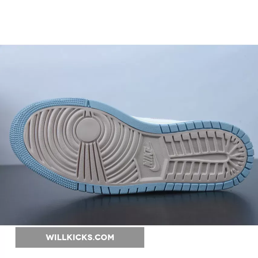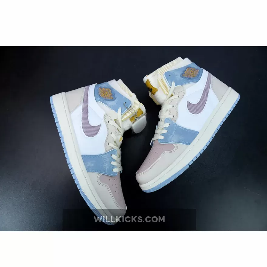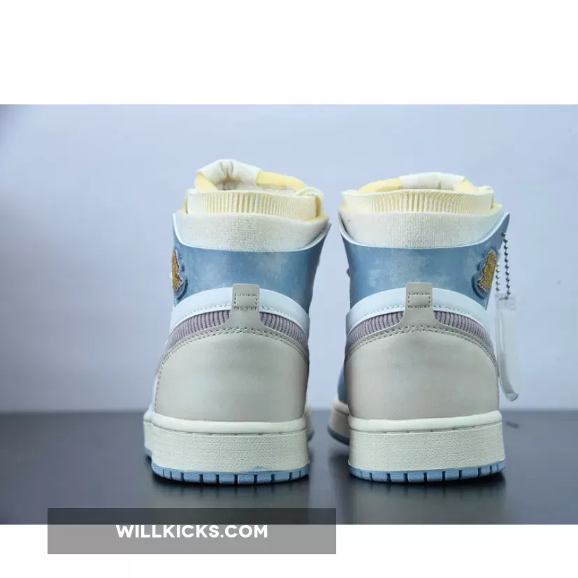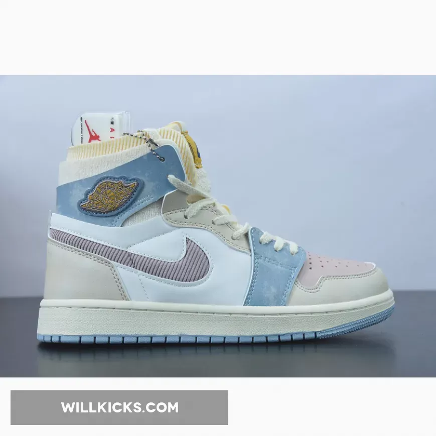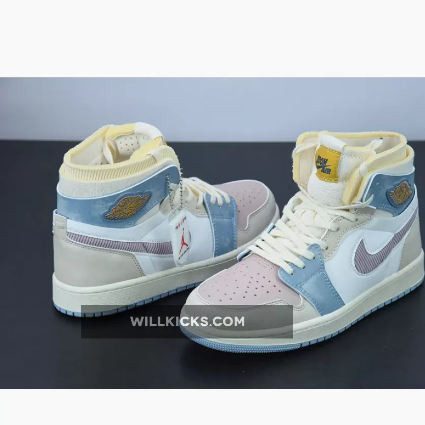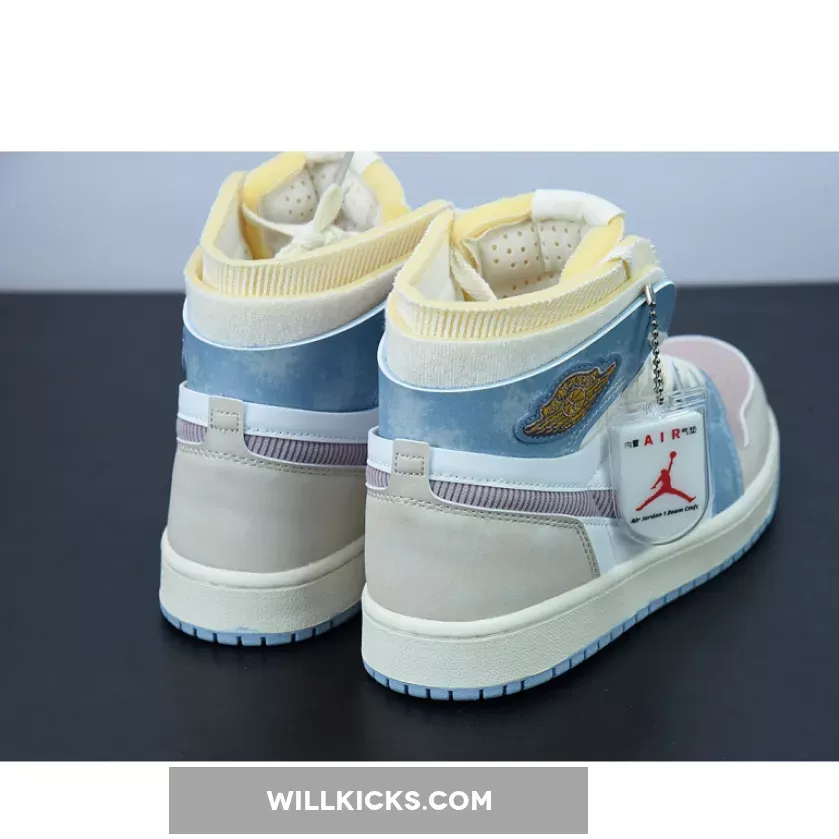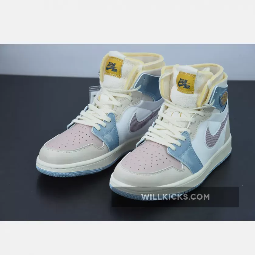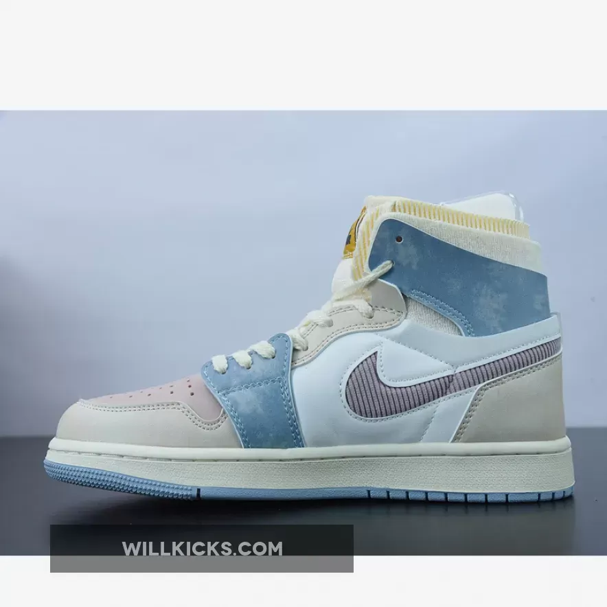 The new Air Jordan 1 Zoom CMFT comes in pastel shades. Meet the Air Jordan 1 Zoom CMFT Pink Plum Fog.The base of the upper is suede in charming Pink Oxford showing on the perforated toe box. The quarter is suede in Summit White with cutouts showing off the signature profile Swooshes in Plum Fog corduroy. The mudguard, part of the eyestay panel and the collar flap are in sky blue with the same washed finish as the beige overlays. The terry cloth that wraps around the exposed foam tongue and the ankle give the shoe a comfy look.