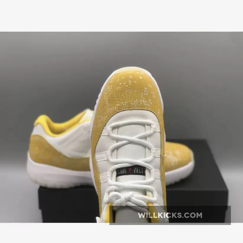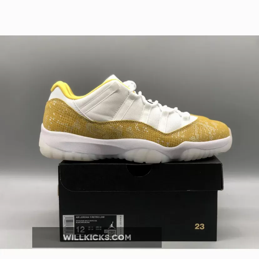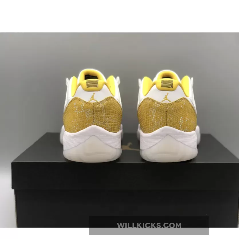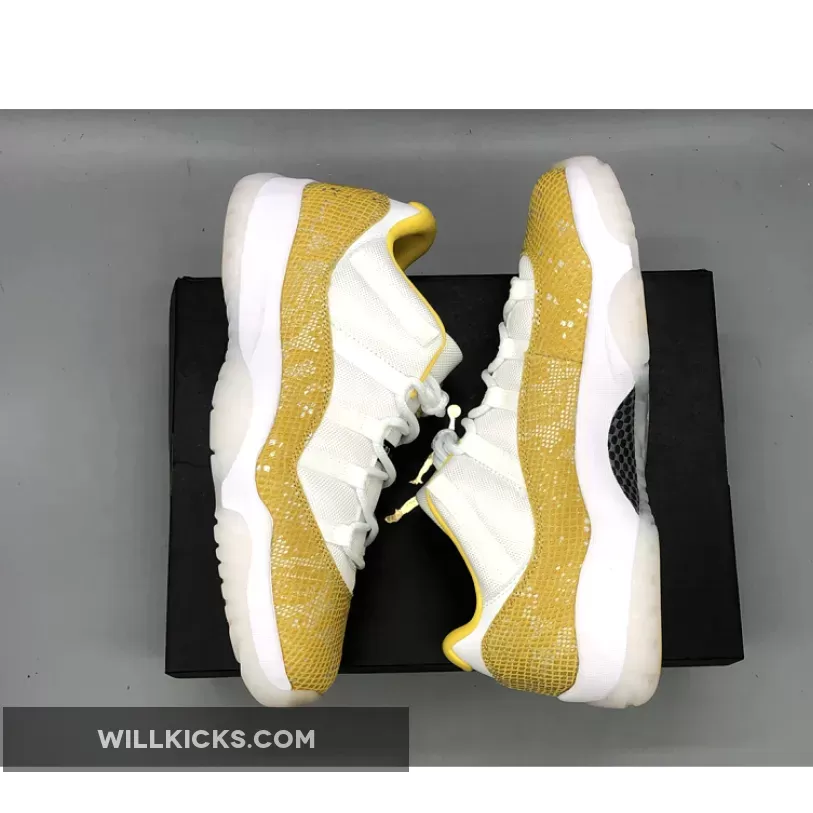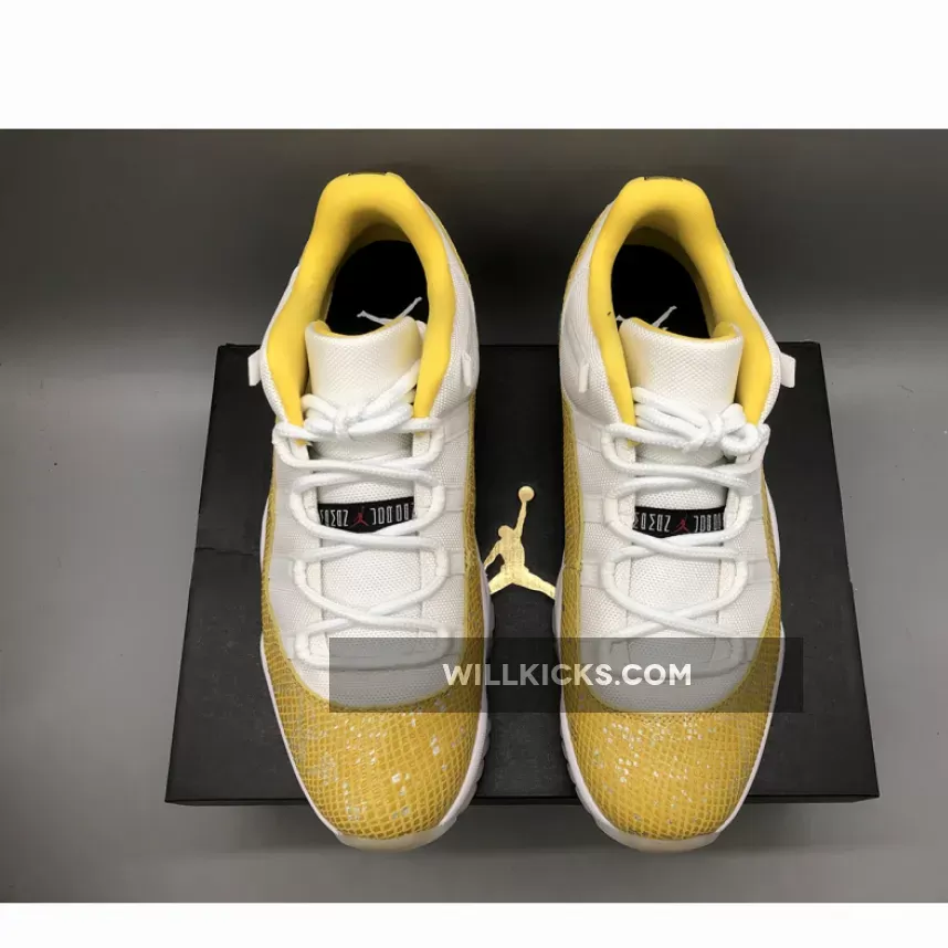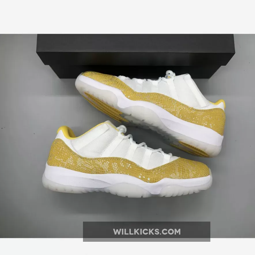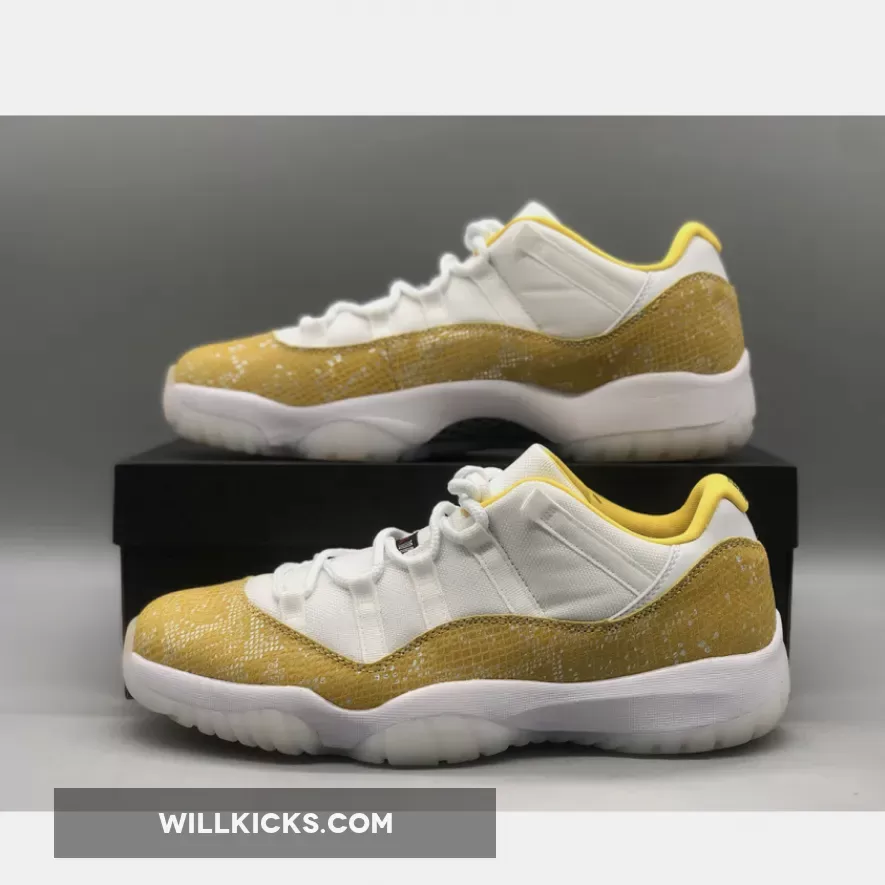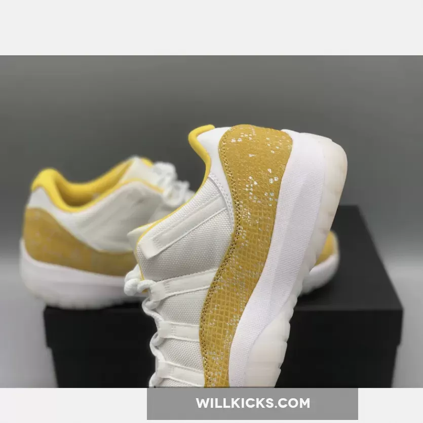 Using the same color blocking as the previous Air Jordan 11 Low “Snakeskin” colorways, the sneaker uses a white leather base as well as white nylon lace overlays with the rand surrounding the sneaker seen in a faux yellow snakeskin print throughout. Yellow is seen on the liner with the JUMPMAN JORDAN strip seen through the midfoot of the tongue.