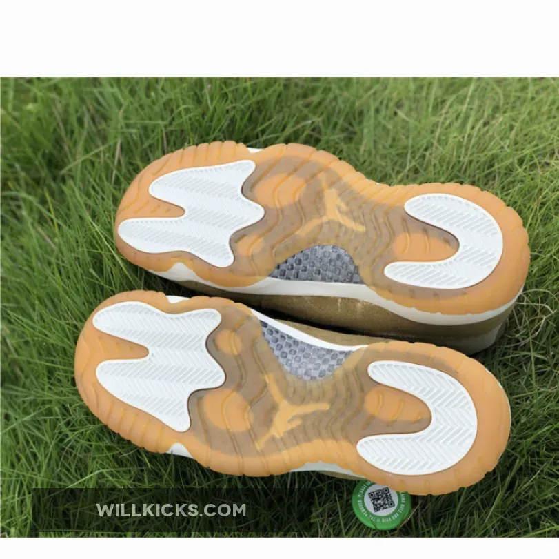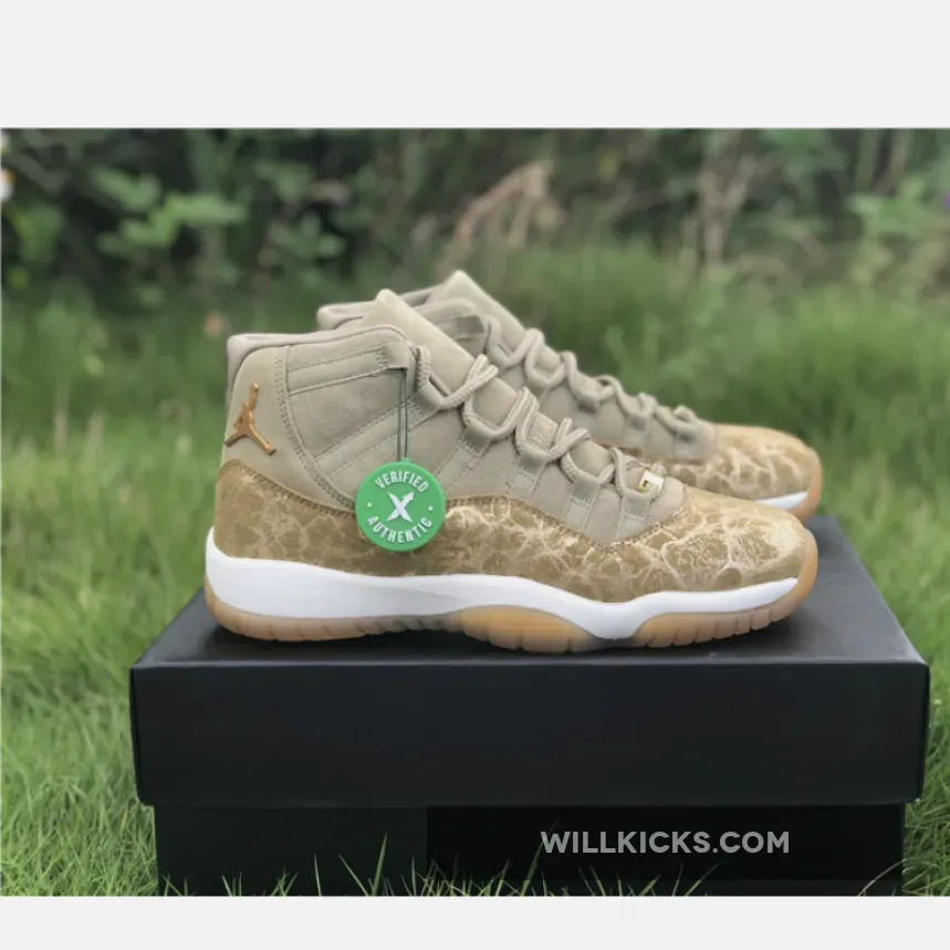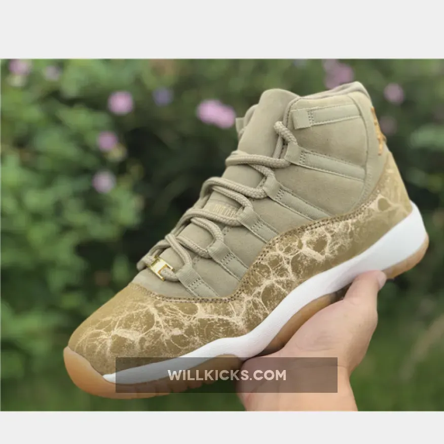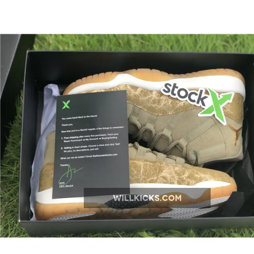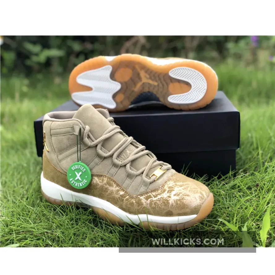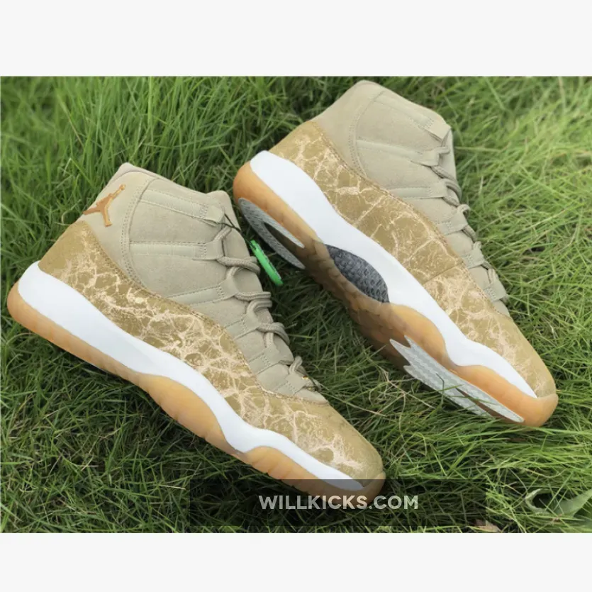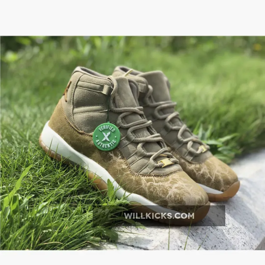 Dressed in a Neutral Olive, Sail, Gum Light Brown and Metallic Stout color scheme. This Air Jordan 11 features an Olive upper with a glitter texture replacing its patent leather overlay.