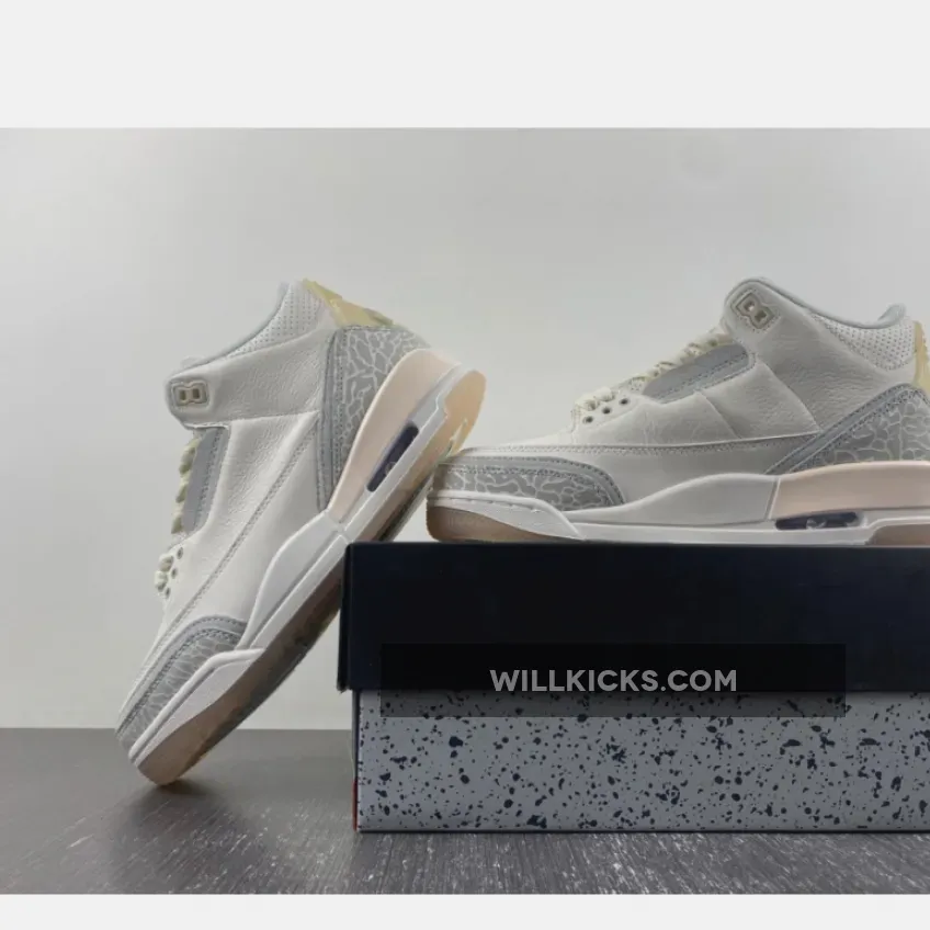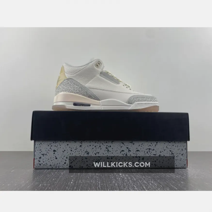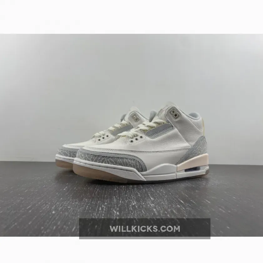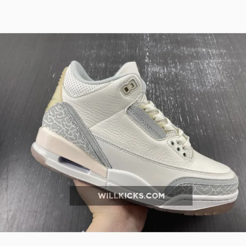 This particular rendition of the Air Jordan 3 showcases an elegant blend of Ivory, Grey Mist, and Cream hues. Its defining feature is the Ivory tumbled leather that envelops the upper, embellished with perforations encircling the collar. The smooth leather mudguards and suede overlays on the toe and heel introduce a tactile and visual contrast.