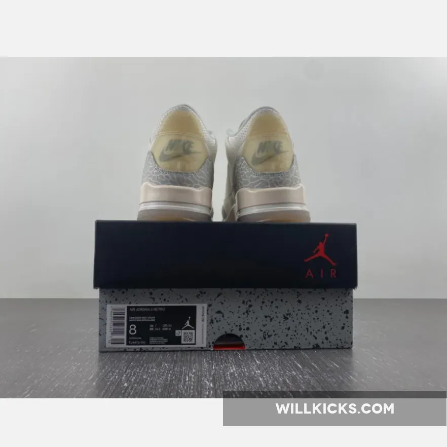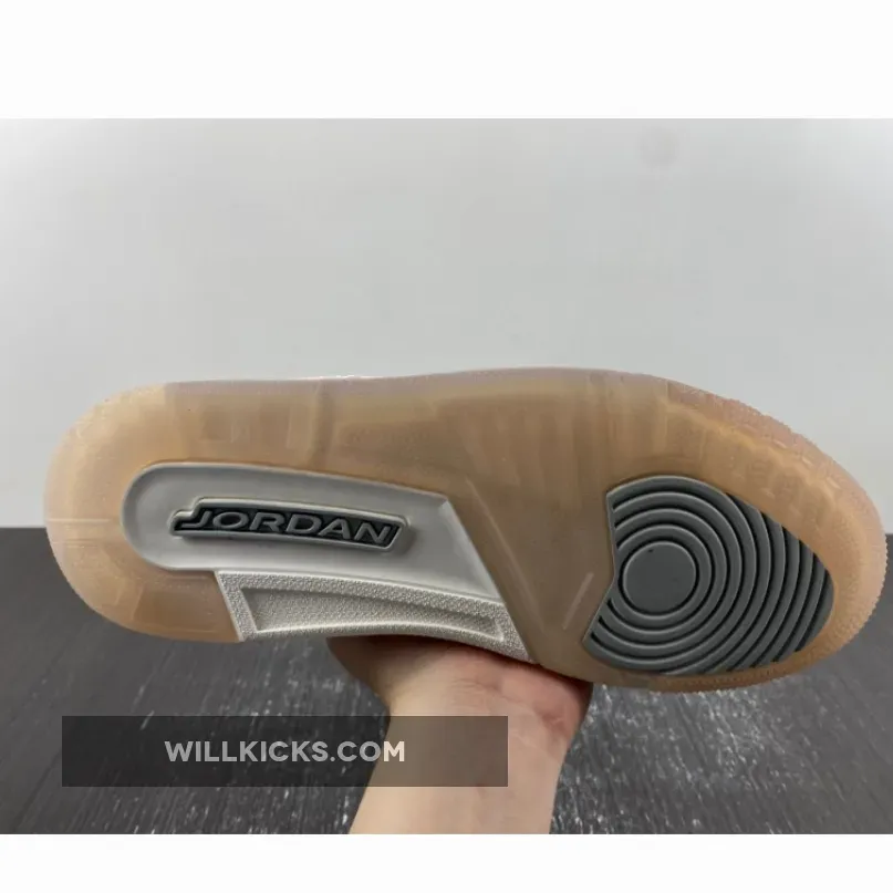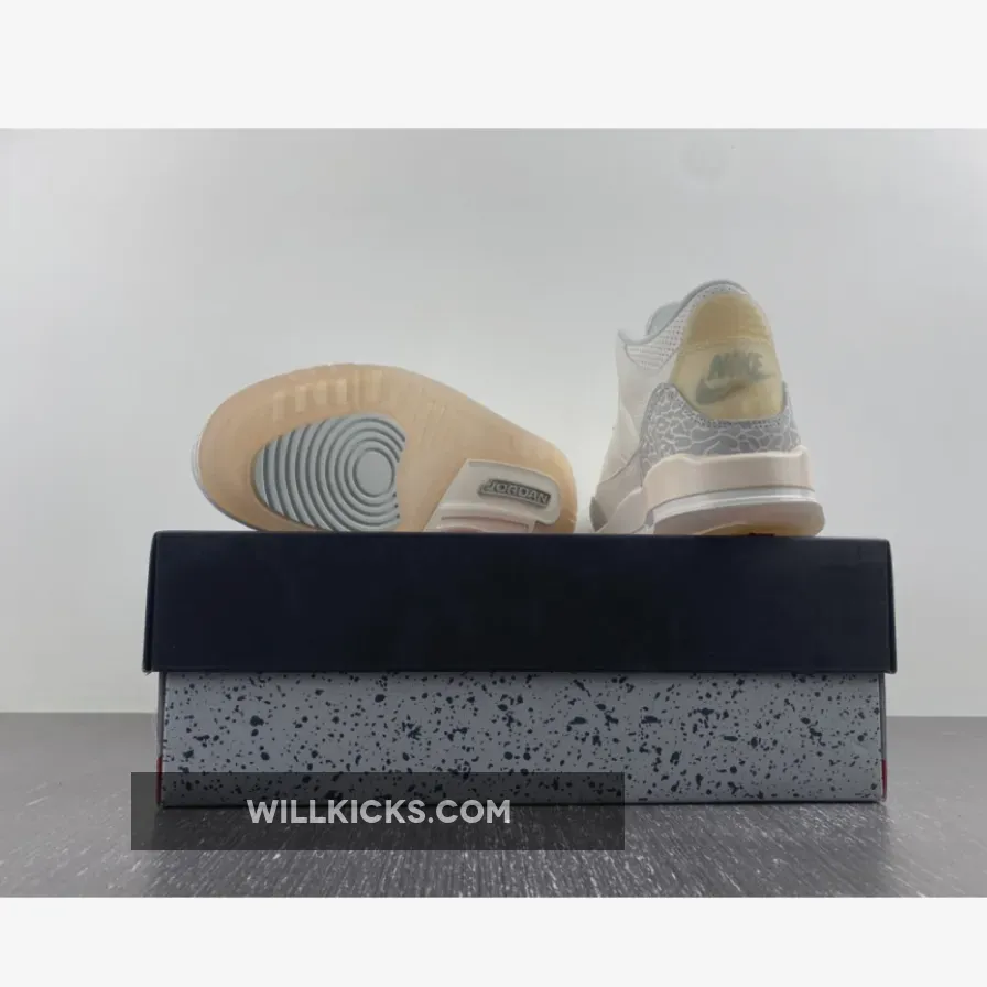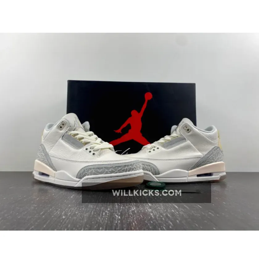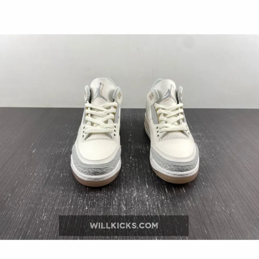 This particular rendition of the Air Jordan 3 showcases an elegant blend of Ivory, Grey Mist, and Cream hues. Its defining feature is the Ivory tumbled leather that envelops the upper, embellished with perforations encircling the collar. The smooth leather mudguards and suede overlays on the toe and heel introduce a tactile and visual contrast.