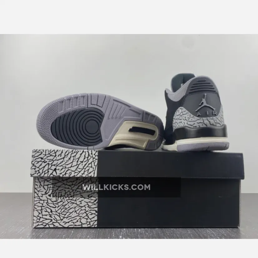 From here, black leather works its way onto the collar and tongue while the black signature heel detail showcases the Jumpman logo and “AIR” text in black as well. The lower level of the mudguard and heel features Jordan Brand’s elephant print, giving the pair a retro appeal. Wrapping things up, the Air-infused sole unit dons an off-white midsole and light gray rubber outsole.