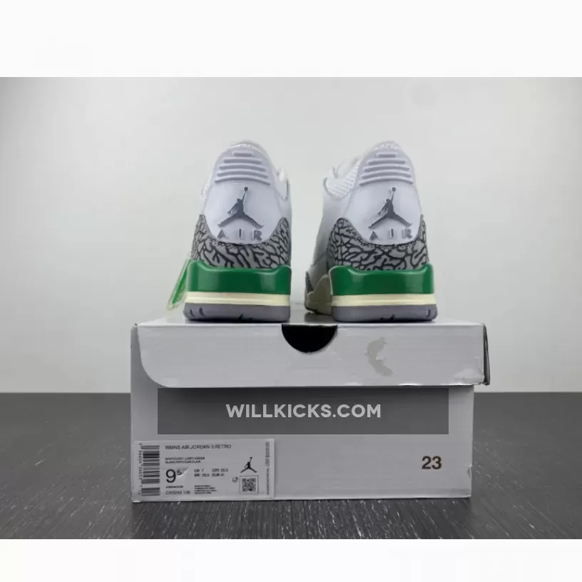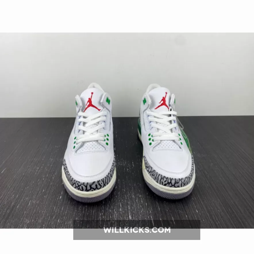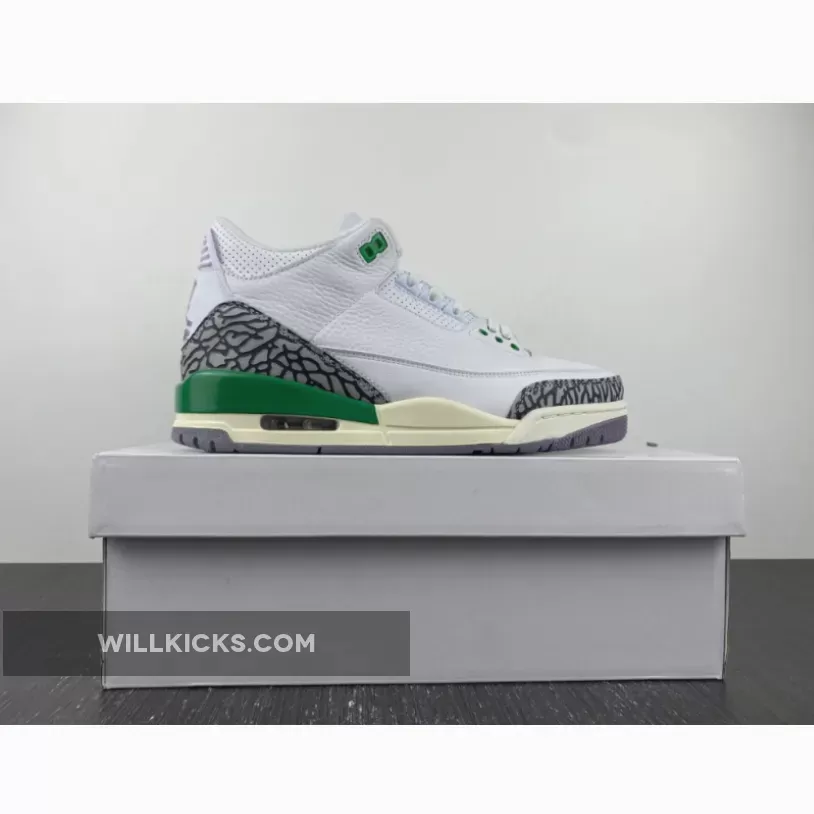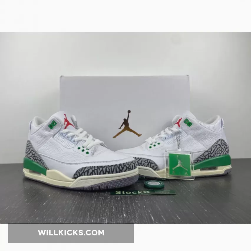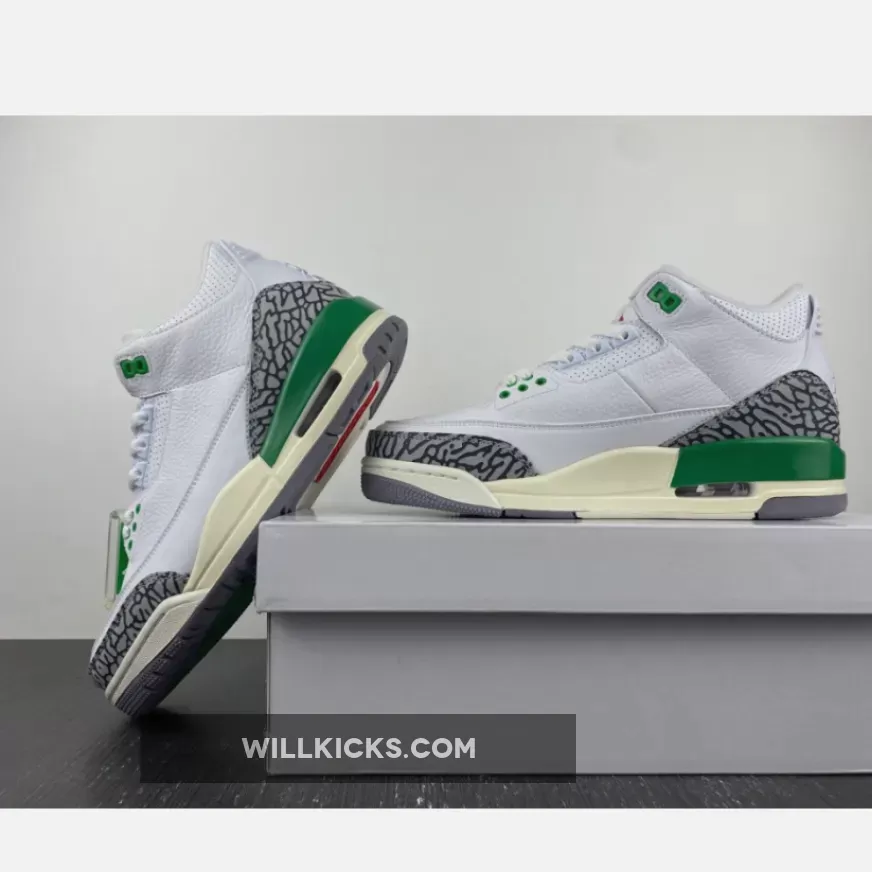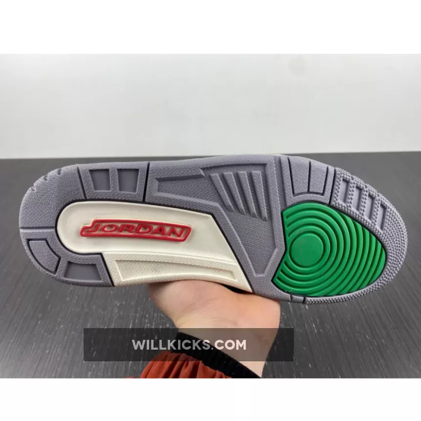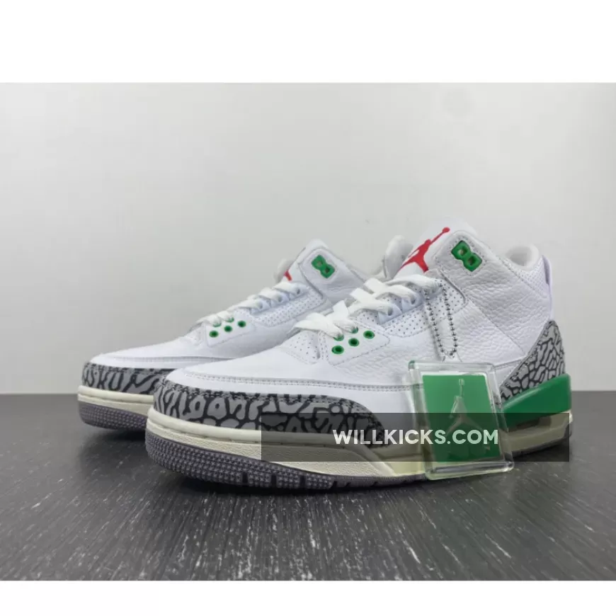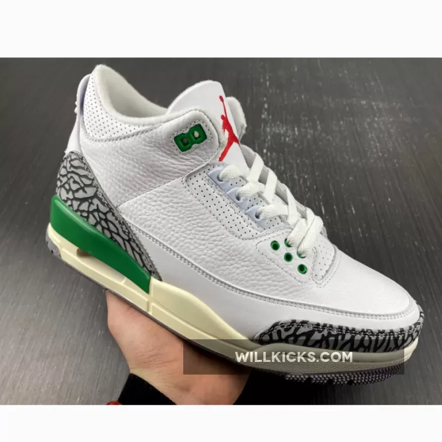 the Air Jordan 3 appears in a familiar presentation that features a white leather base joined by “Cement Grey,” “Sail” and “Varsity Red” to support the “Lucky Green” accents. The 3’s iconic elephant print arrives at the mudguard and heel counter while the off-white “Sail” color dresses the Air-infused midsole. A grey Jumpman logo arrives at the heel while a red one can be spotted at the tongue. As for its titular hue, the jolly green finds itself at the lacing system, hangtag and heel portion of the midsole, completing the look.