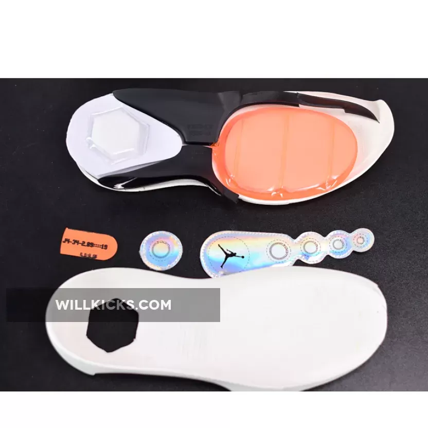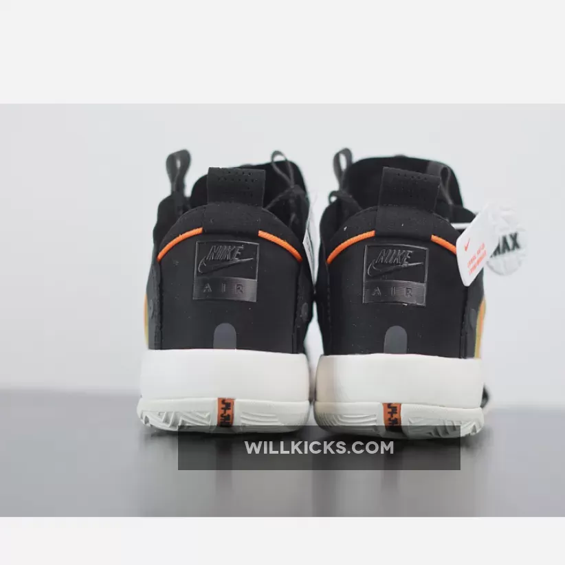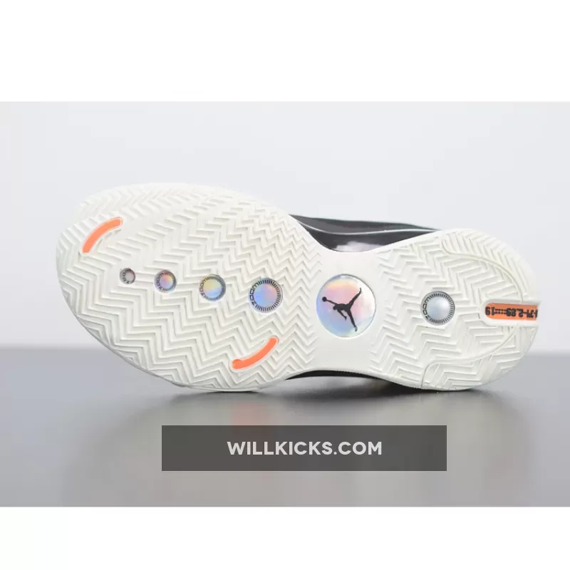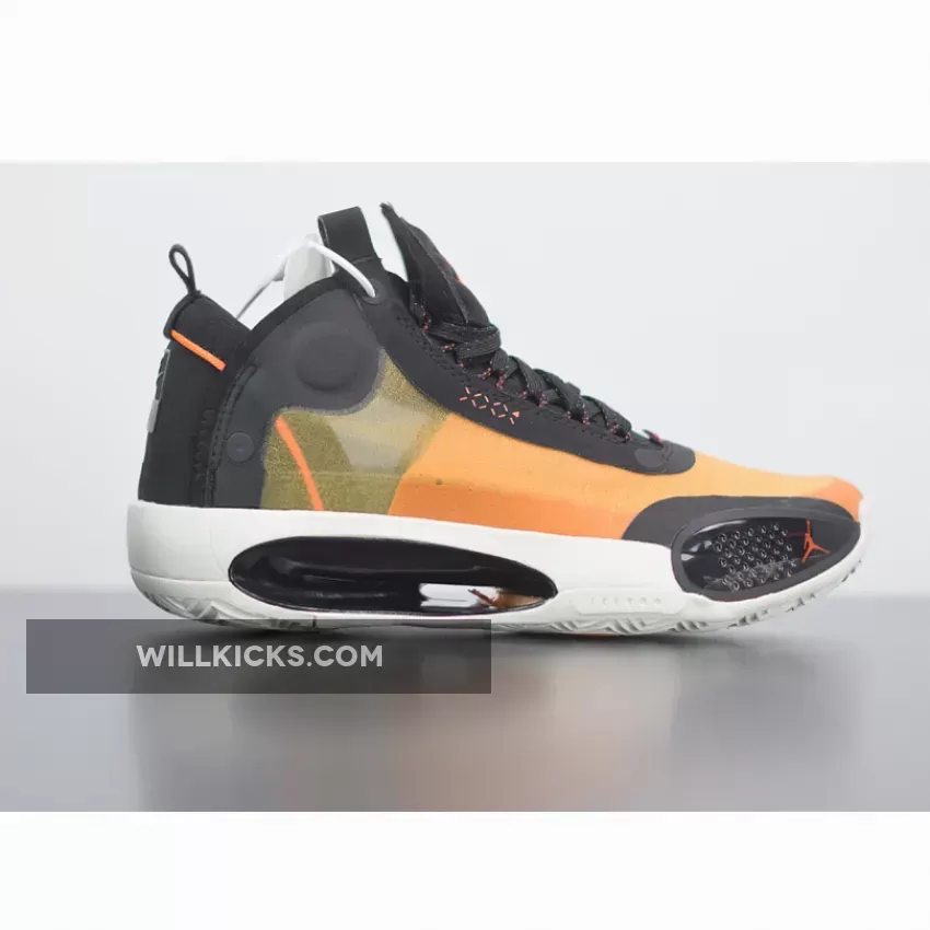 The Air Jordan 34 ‘Amber Rise’ was released in late November 2019 with a translucent TPE layer to accent the orange, grey and black colorway. Updated Jordan branding can be found at the heel—which is different in each colorway—as well as #23 presented in Morse code on the vamp and a 30th Anniversary call-out for the AJ4 on the outsole. One of the lightest Jordans ever, it includes a stripped-down upper and lightweight Eclipse plate that connects two Zoom Air units under the foot.