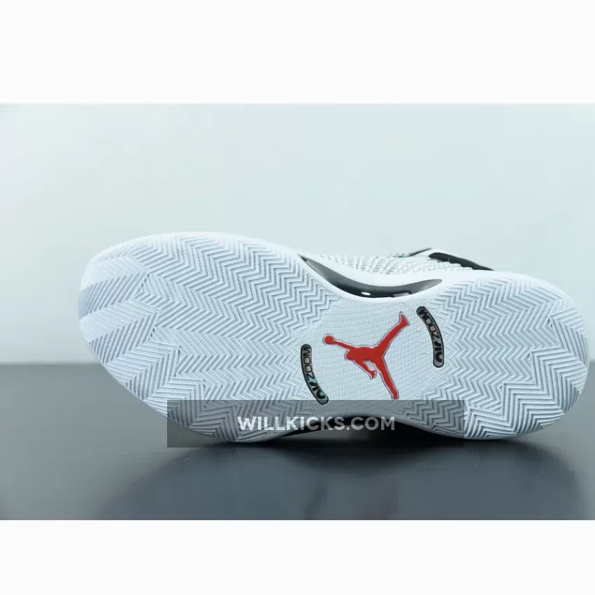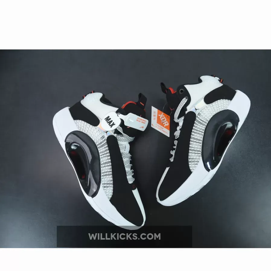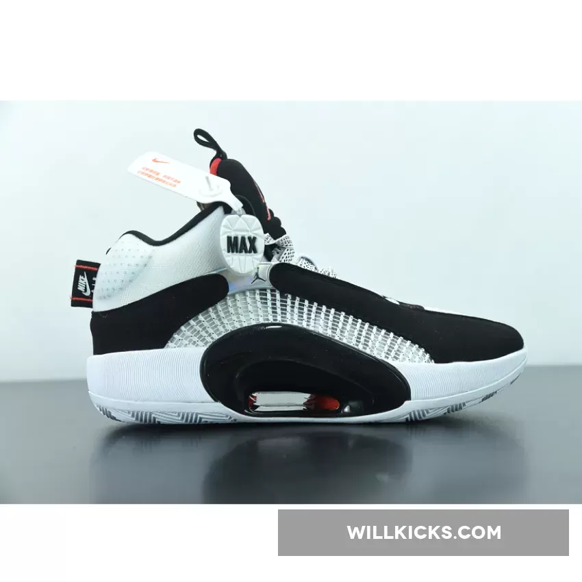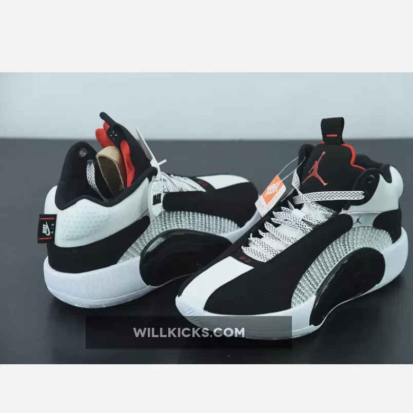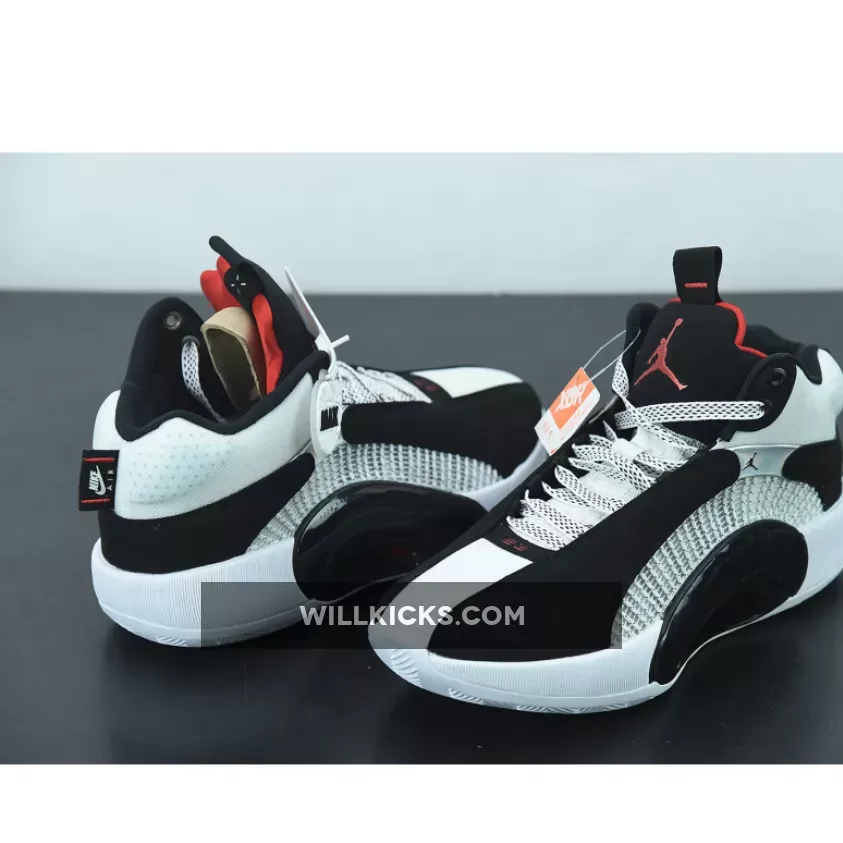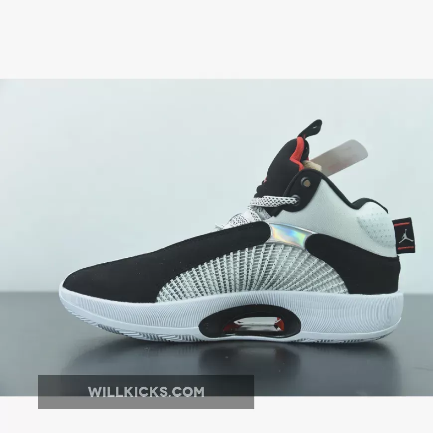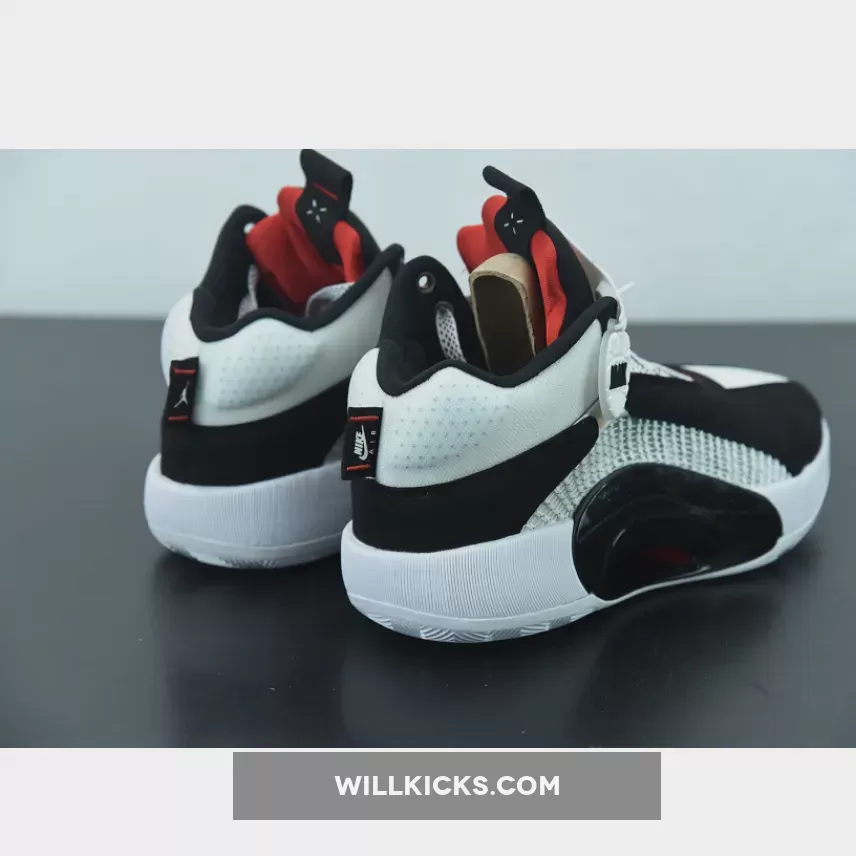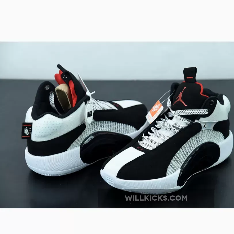 this Air Jordan 35 comes highlighted in a White, Black, and Fire Red color theme. Mostly White covers the upper but is joined by Black nubuck overlays. Furthermore, iridescent allows this pair to pop more, but the true highlight is the ‘Fire Red’ Air Jordan 5 tongue.