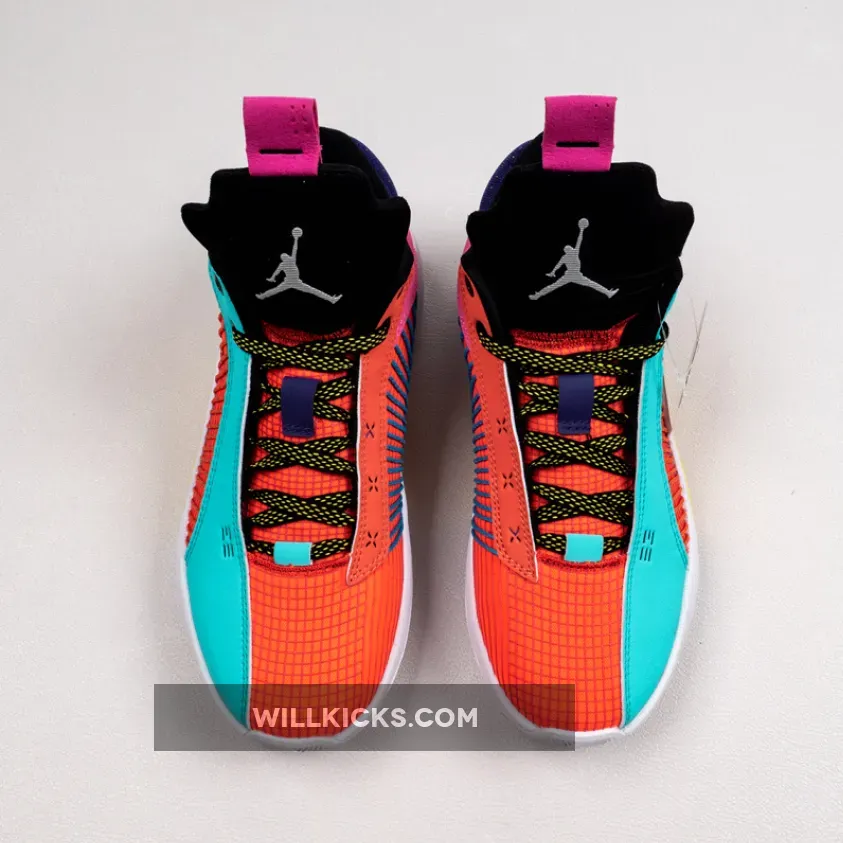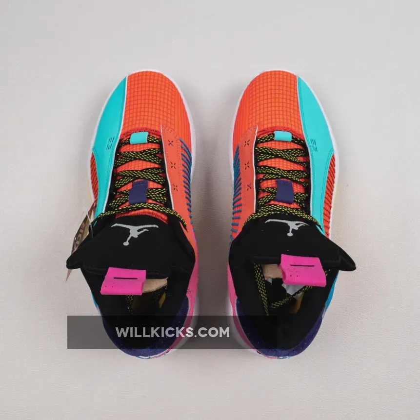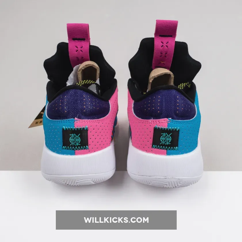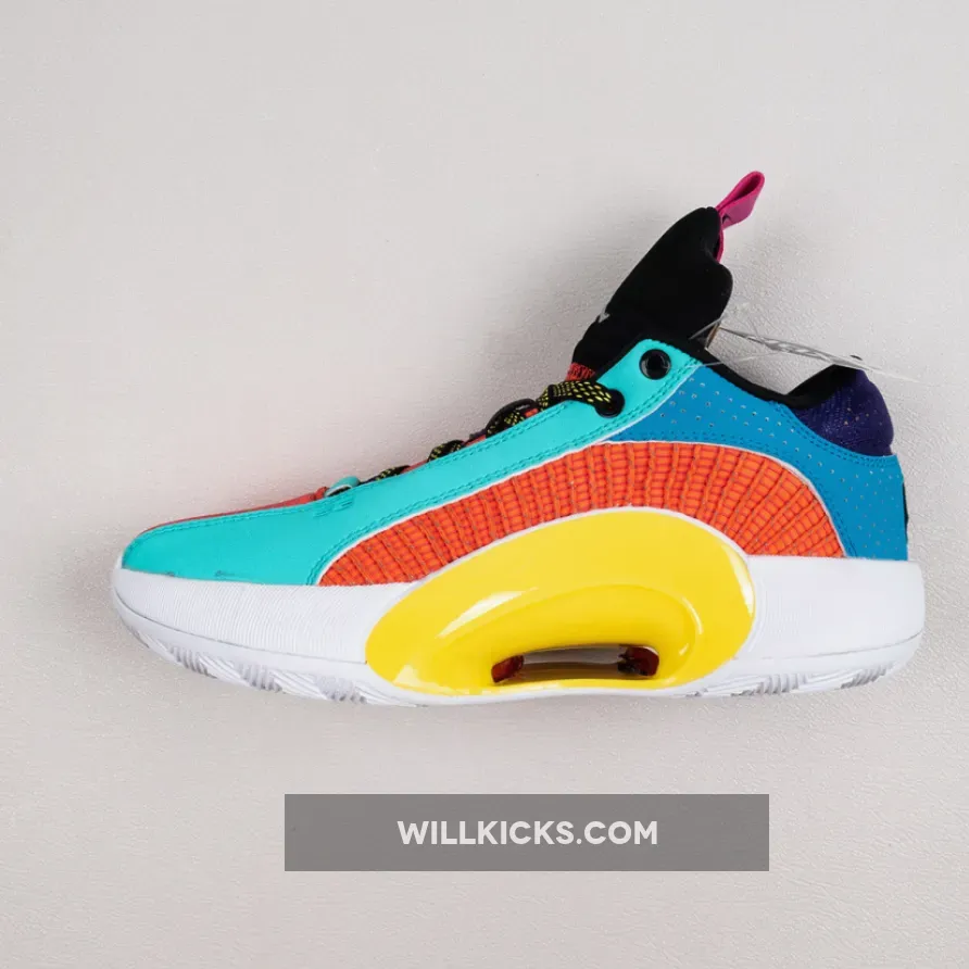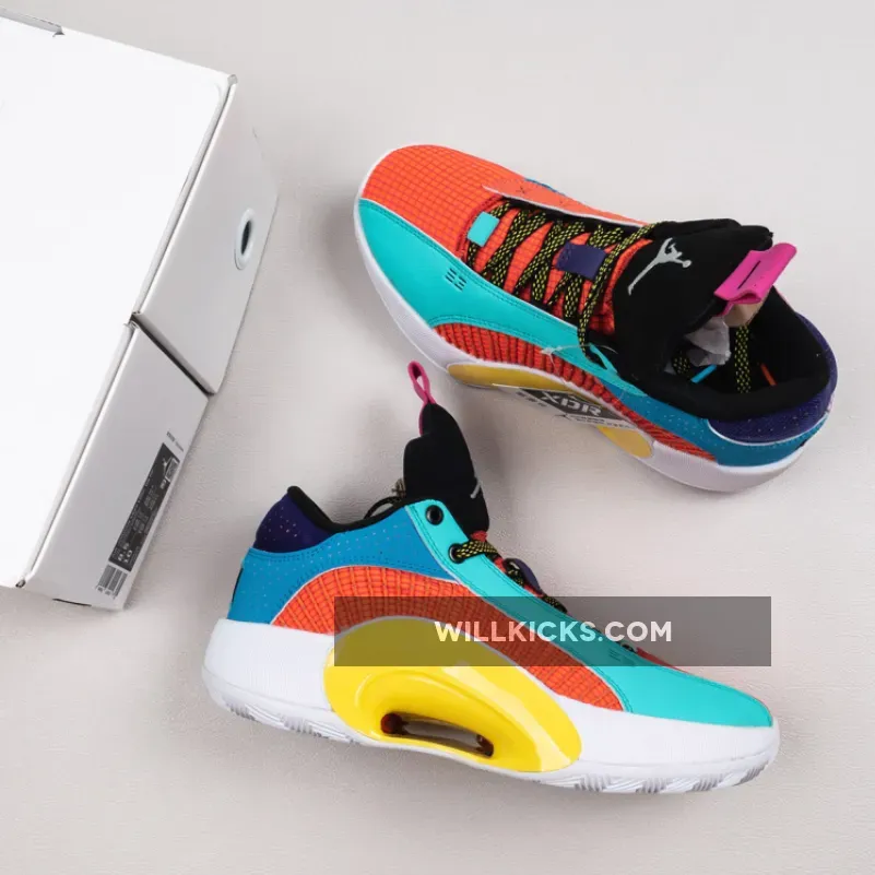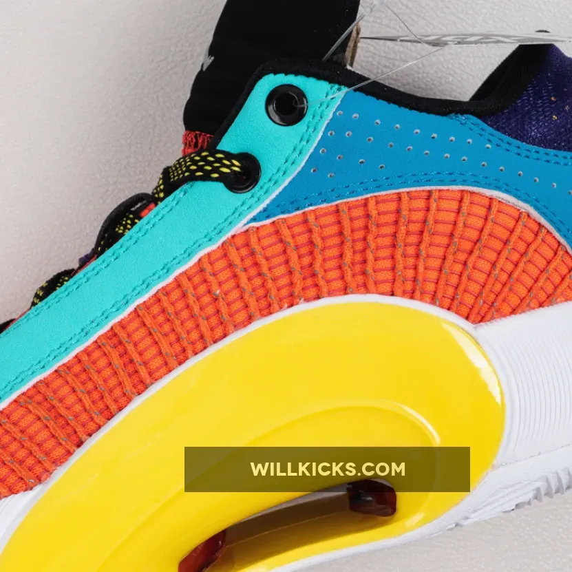 Dressed in a Multi-Color color scheme nodding to the zone therapy color chart. This low-top Air Jordan 35 features a Bright Red mesh base with suede overlays in Aqua and Blue on the lateral, and Orange and Pink on the medial. Other details includes 3M reflective hints, Purple mesh in the rear, Yellow Eclipse plate atop a White rubber sole. Kanji symbols on the heels with vibrant-colored graphic insoles resembling the foot chart completes the design.