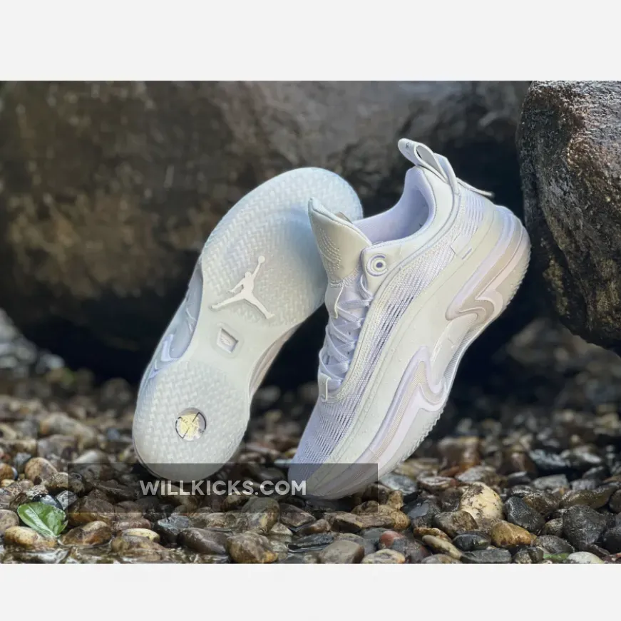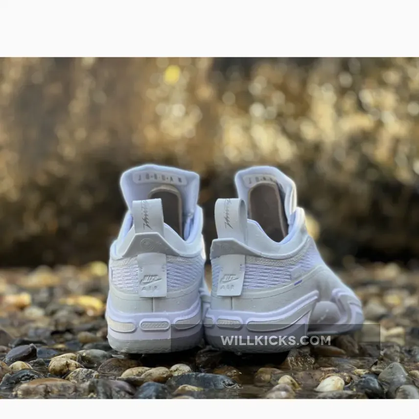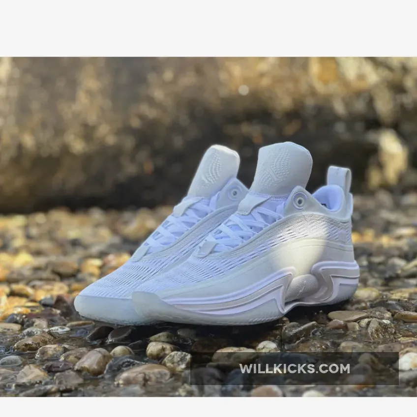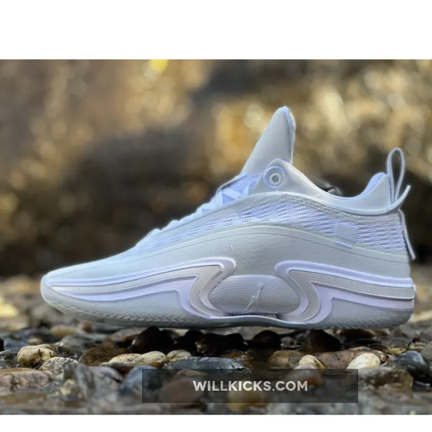 The Tate Kuerbis-designed Air Jordan 36 has an angelic-looking iteration that just got released. Meet the Air Jordan 36 Low White Metallic Silver. This AJ36 has a luxe-looking gauze-like Jacquard Leno-Weave upper in white held in place by a TPU ribbon. White repeats on the laces, lace locks and extra-large heel pull tabs.