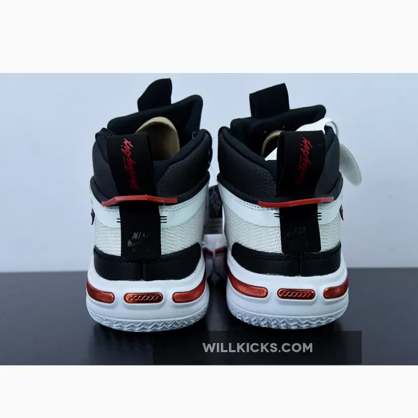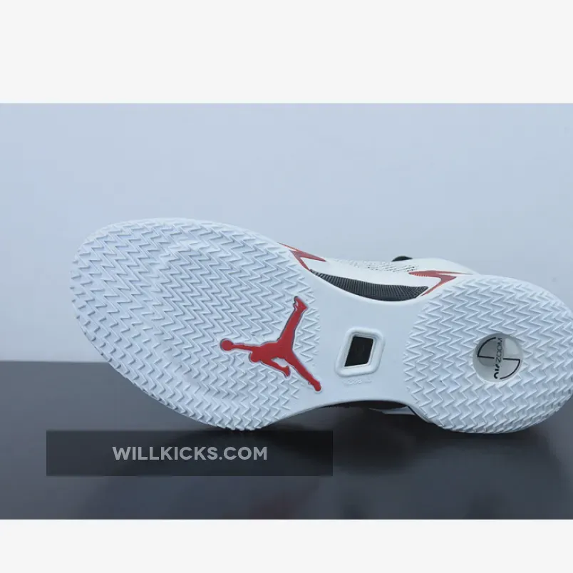 The hardwood-ready shoe starts off with a breathable Jacquard Leno-weave upper in white lined with a TPU ribbon. A subtle reptile texture runs throughout the tongue and ankle collar in a stark black hue with an enlarged tongue tab rolled onto the laces featuring the Jumpman logo in bright red.