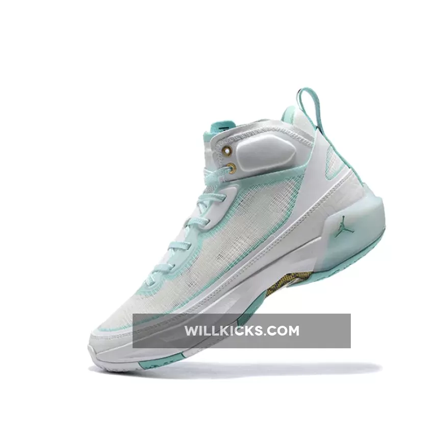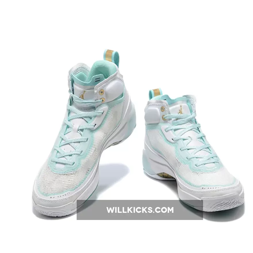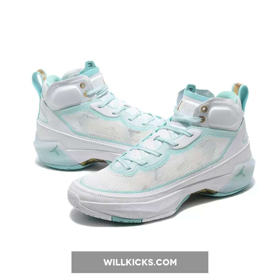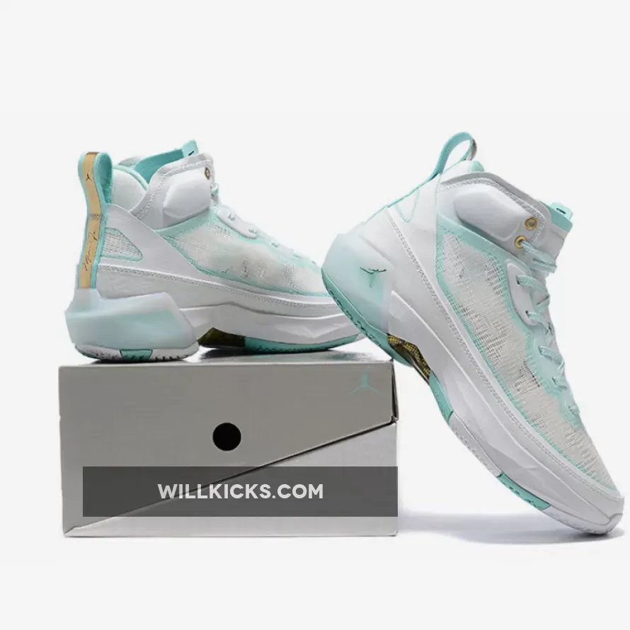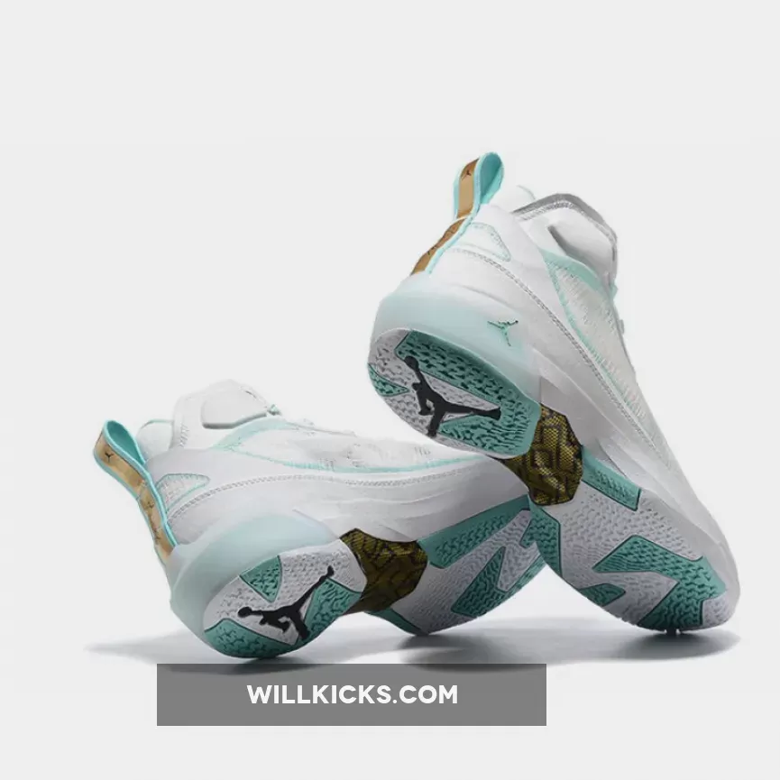 This AJ37’s breathable mesh base is white showing off an attractive turquoise underlay on the lower part of the upper. The TPU upper edges that connect to the eye stay panel are also bordered with the same turquoise hue. The puffed-out and comfy-looking collar is white, matching the mesh base. The laces feature a white-and-turquoise weave, complementing the upper, while an embossed Turquoise mini Jumpman embellishes the lateral midsole at the heel area. Bronze accents add a touch of luxe to the shoe via the collar eyelets and the heel pull tabs that extend down the spine of the heel. A white midsole, a bronze midfoot carbon fibre shank and a white-and-turquoise rubber outsole finish off the design of this shoe. Shop the Air Jordan 37 Guo Ailun on Our Store Supplier app and always be on top of the latest Jordan Brand and Nike release dates.