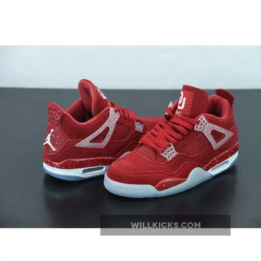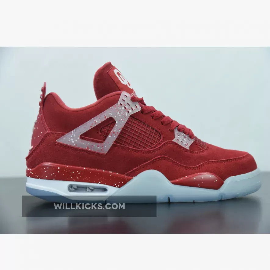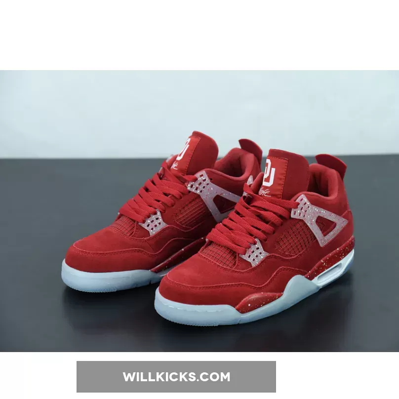 Right before the 2018 Orange Bowl where the Sooners were shut down 45-34 by the Alabama Crimson Tide, OU received a new pair of Air Jordan 4 PEs that’s constructed of full red suede on the uppers and translucent speckled lacewings. The Oklahoma Sooners branding tops the tongue label while Jumpman logos detail the heels against a white and red speckled background.
