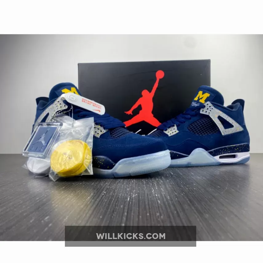 “I’m thrilled with my Air Jordan 4 Retro ‘Michigan Wolverines’ PE! The navy blue and gold yellow color scheme is dope. Love the branded school logos on the tongue labels. The translucent speckled eyelets add a nice touch. Comfortable after break-in. Not ideal for intense basketball, but perfect for casual wear. Solid purchase!”